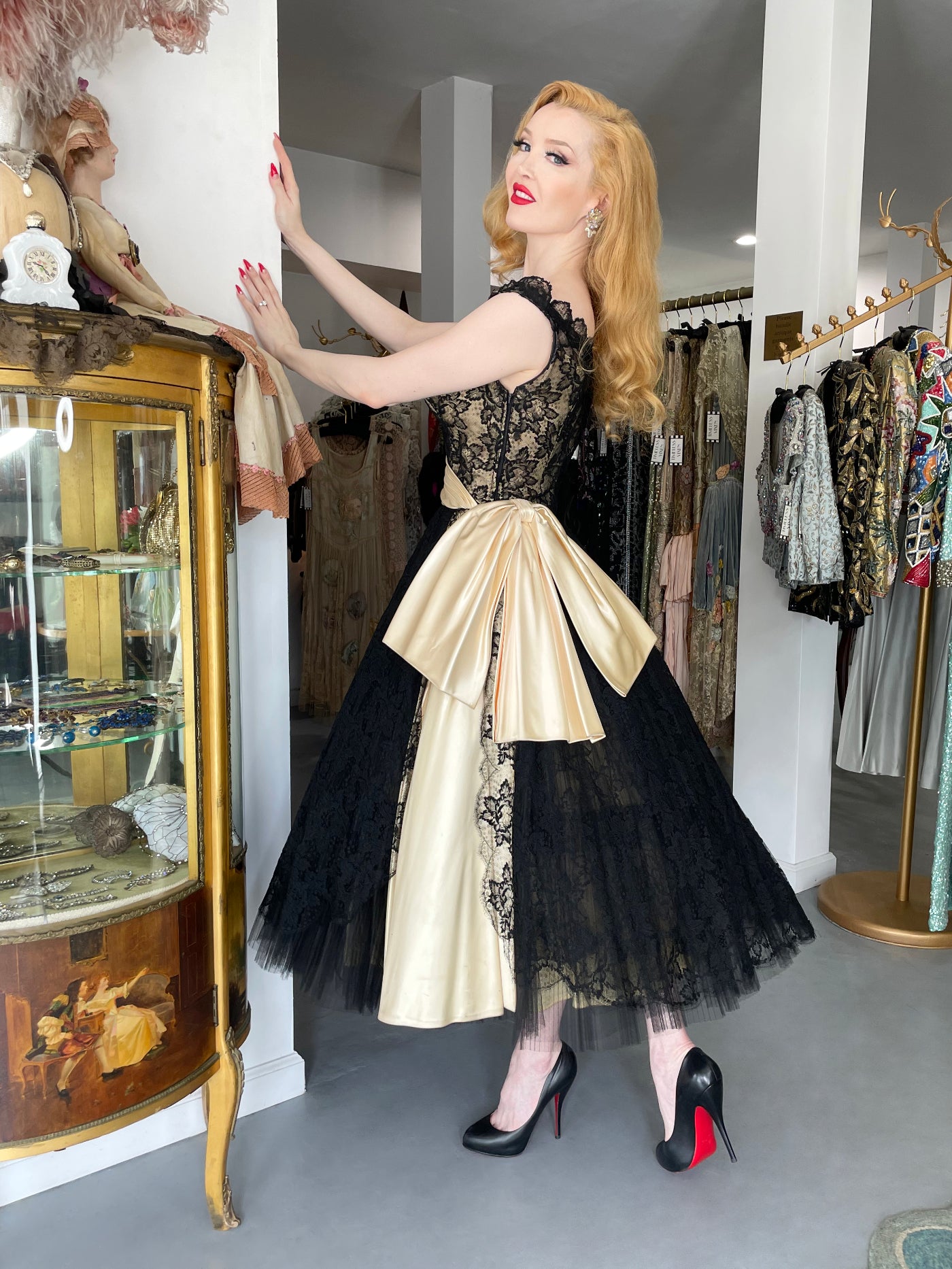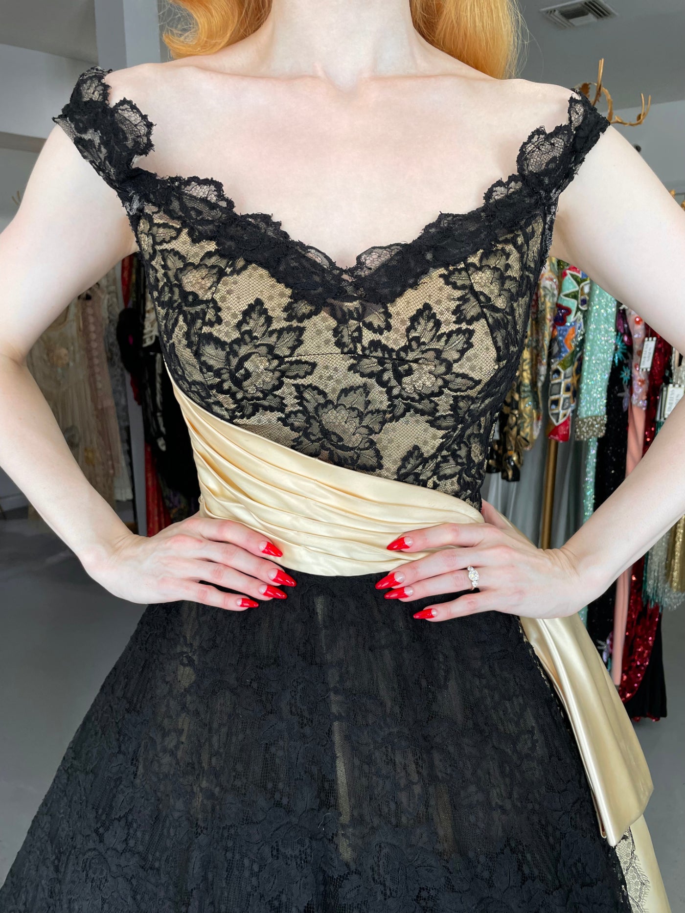 An exceptionally beautiful, museum worthy Pauline Trigère designer dress dating back to the early 1950's. These early examples of her work are very hard to come by. During this time period, Pauline Trigère's name was part of the glamorous excess in Hollywood fashion. Her exquisite tailoring and feminine fitting clothing were highly desired by the wealthy and famous. Trigère designs commanded some of the highest prices often because they were made with very expensive materials. This stunning party dress is definitely inspired by Christian Dior's 'new look' which was incredibly popular during this era. The couture quality fabrics used are sensational; a large-scale black French floral lace and luxurious mid-weight ivory cream silk satin. I love the elegant wide off-shoulder neckline with sheer illusion lace bodice. The lace cutwork looks so alluring against the skin. My favorite design element is the asymmetric pleated ivory silk satin cummerbund nipped waist which flows into a dramatic side bow sash. We showed many images so you can see how gorgeous the dress is from all angles. The pleated tulle under layers really give beautiful foundation to the full skirting. It is impeccably seamed and on the level of modern day couture. A perfect look for any modern wedding or red carpet event.