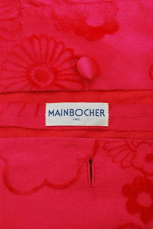 Gorgeous Mainbocher couture shocking pink abstract floral dress dating back to 1970. As shown, this rare beauty was modeled by Loulou de la Falaise for Vogue Magazine. Mainbocher was a well-respected couturier who operated fashion houses in Paris and later New York from the 1930's through the 1970's. Mainbocher's arrival in New York coincided perfectly with the city élite's love for French couture, for though he epitomized it, he satisfied their patriotism because he was actually an American. The integrity of luxurious fabrics, intricate cut, quality workmanship were cherished by Mainbocher's upper crust customers. This documented 1970 dress is a perfect example of his genius. The fabric is a lush mid-weight velvet flocked silk satin. The 3/4-length sleeve buttons down bodice really compliments the classic nipped-waist silhouette. The dress can even be worn as a dramatic jacket if you choose to leave it unbuttoned. You get the effect of elegance and edgy at the same time. I love the sculpted mermaid skirting which really moves beautifully when worn. As Mainbocher once said "I have never known a really chic woman whose appearance was not, in large part, an outward reflection of her inner self."