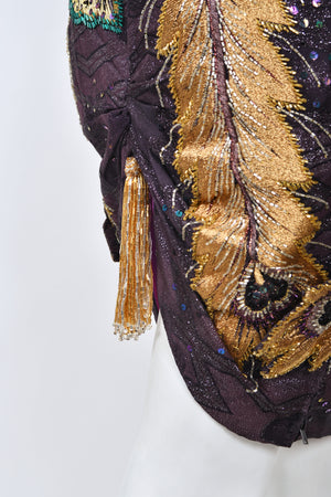 An absolutely magnificent and ultra seductive custom couture peacock novelty dance dress dating back to the late 1970's. This incredibly special piece came from a collector who explained it was used in Dolly Parton's ABC Variety Show which had a short run from 1976-1977. The fabrication on this captivating showstopper is true couture quality; sparkling metallic embroidered and heavily beaded mid-weight silk in the most extraordinary purple gold peacock feather motif. Feather shaped appliqués also adorn the front bodice and hemline, creating such alluring depth and texture. Not only is this dress beyond beautiful, it has so many clever details. A front center metal zipper is worked into the feather motif and when it is unzipped, a built-in beaded bustier is revealed. Each side of the skirt also has concealed metal zippers and when you zip them up, pleated sheer silk is displayed. When you turn around there is a flirty gold beaded tassel on your behind reminding you to 'shake a tail feather'. We added many pictures so you can appreciate this masterpiece. A custom made dance dress like this is a true piece of American performance history and would make an epic red carpet or holiday look.