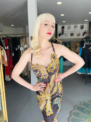 This peacock feather motif custom dance dress is in beautiful condition with no rips, stains or alternations. Closes with hidden front center zipper and impressive corset style inner bustier bodice. The level of couture work on this piece would be very hard to find today. Highly wearable and an investment piece that will continue to increase in value.