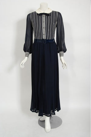 • 1970's Jacques Réval Paris Navy Chiffon Sequin-Stripe Pleated Maxi Dress