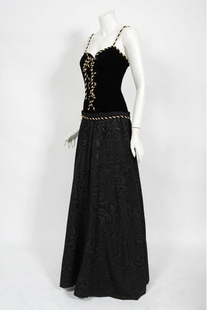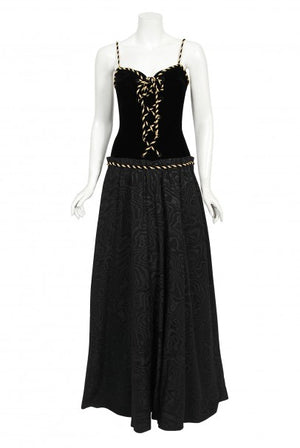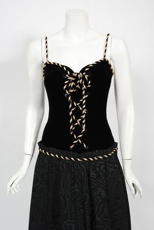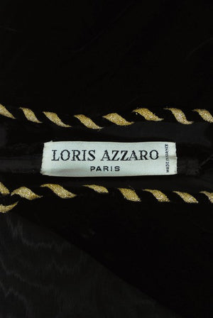 A seductive Loris Azzaro silk moiré and velvet low plunge lace-up corset gown dating back to the late 1970's. Loris Azzaro is famous for creating glamorous and provocative customized looks for celebrity elite. His timeless designs were favorites to actresses such as Raquel Welch, Sophia Loren and Nicole Kidman. Allurement is an inherent part of the Azzaro image, resulting from a relationship to the body founded on freedom. This iconic Loris Azzaro gown is a wonderful example of his genius. Totally reminds me of the Yves Saint Laurent 'Russian Collection' era! The top boned bodice is fashioned from luxurious silk velvet and that metallic-gold striped rope for the lace-up front and shoulder straps. I love the seductive low-cut plunge dropped nipped waist design. The gorgeous light weight silk moiré full-length skirt has interior construction to help create that flattering, effortlessly look. The pictures say it all!