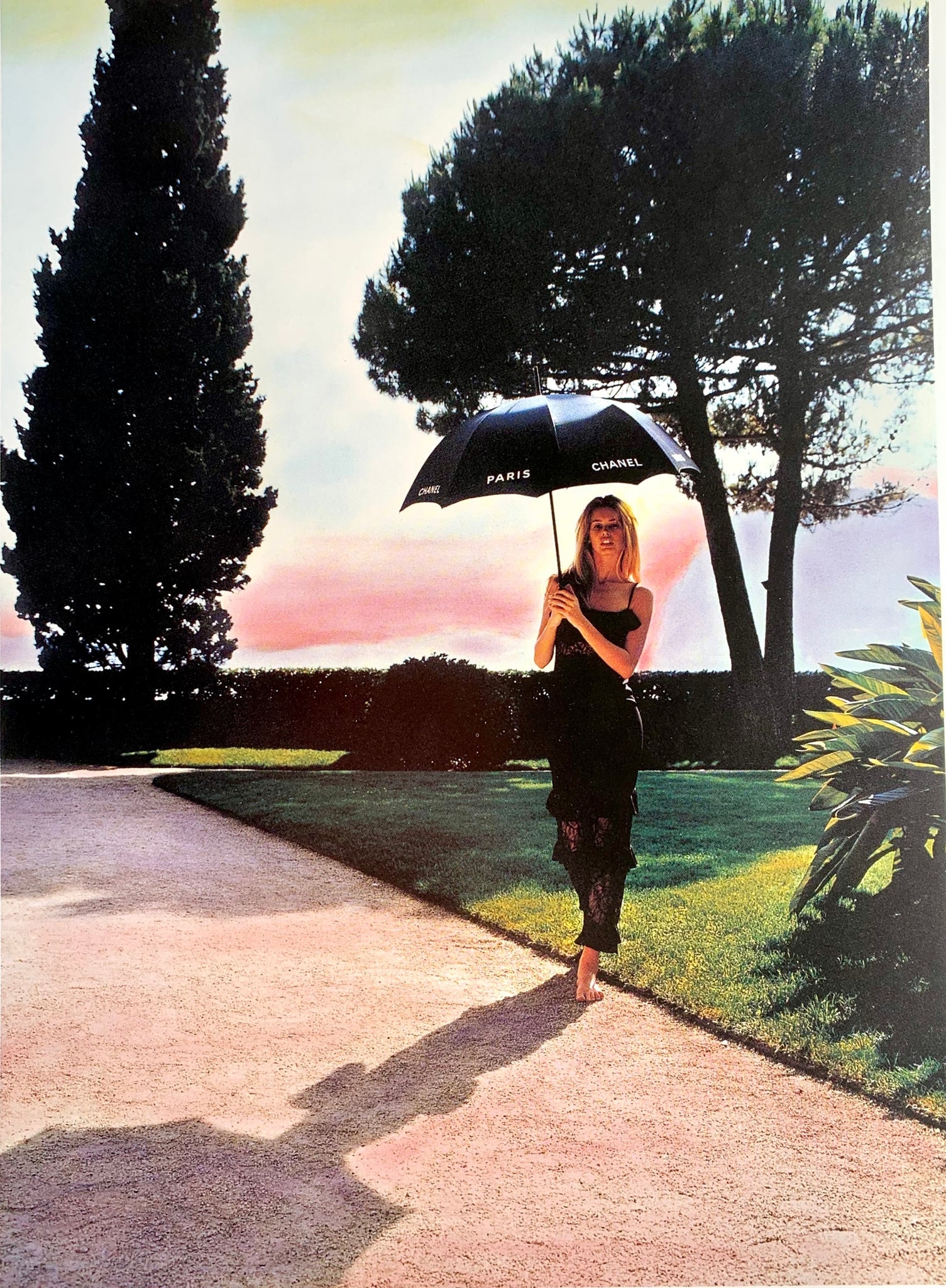 Cut from sheer black silk chiffon, the silhouette remains lean through the bodice before releasing into soft movement at the lower half, where alternating bands of tiered sheer chiffon panels and black floral lace are layered. Each tier is finished with a chiffon ruffle, creating dimension while allowing the lace to reveal glimpses of skin beneath. Across the bust, a delicate ruffle traces the neckline, mirroring the movement found below. A band of intricate black floral lace wraps the midsection, defining the waist while reinforcing that unmistakable lingerie influence Lagerfeld explored throughout the collection. The bodice is minimal yet precise: slender straps frame the shoulders, while the open neckline keeps the focus on the décolletage. Turn around and the back remains clean, fastening with a concealed zipper and finished with a signature CC logo button. The construction is so thoughtful, balancing transparency with structure so you can wear it with ease. This archival Chanel is extremely compelling on its own, but the level of documentation puts it at another level. You’re not just getting a runway dress—you’re acquiring a design photographed by Lagerfeld himself, worn by one of the era's defining supermodels, and published in a Vogue France campaign.