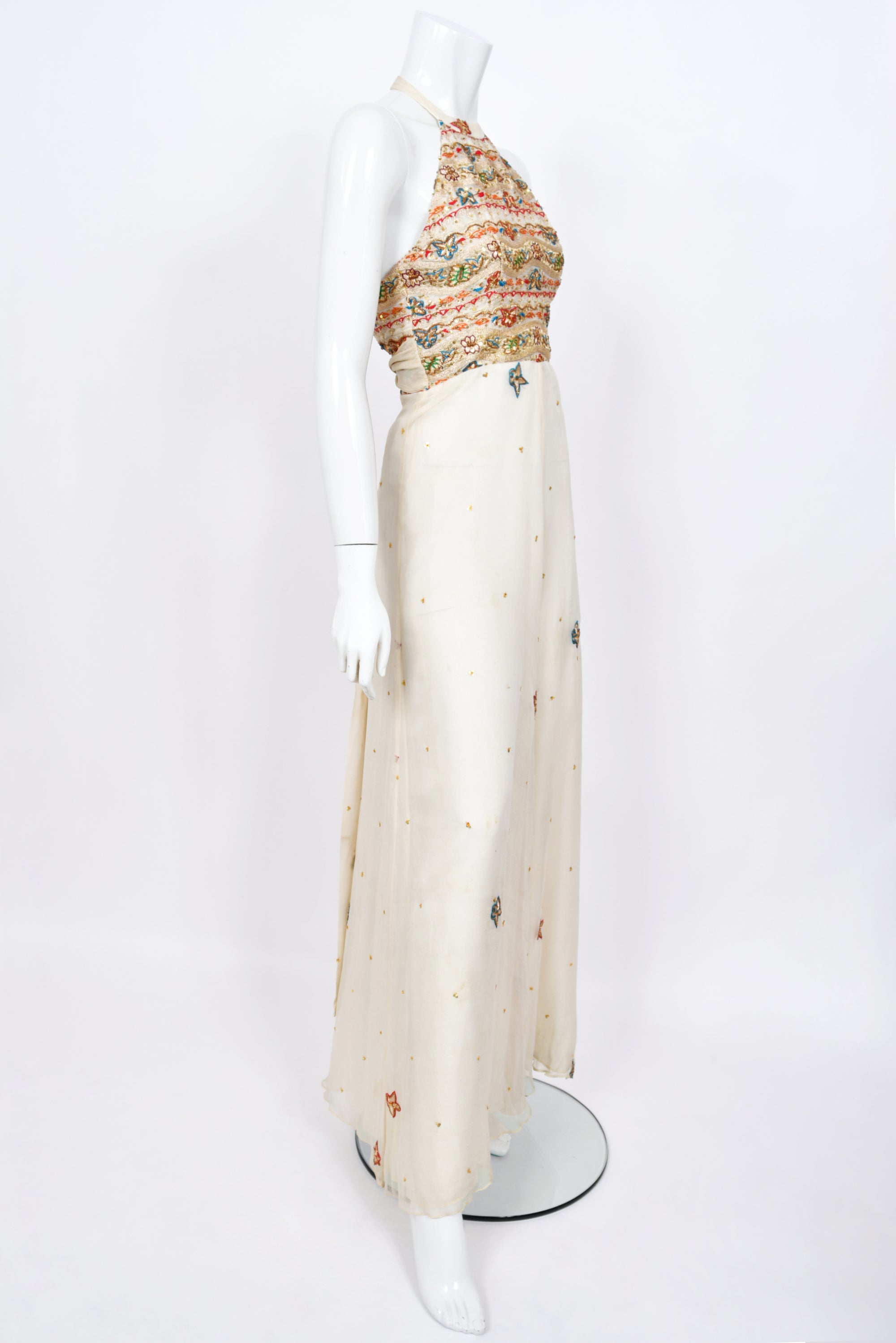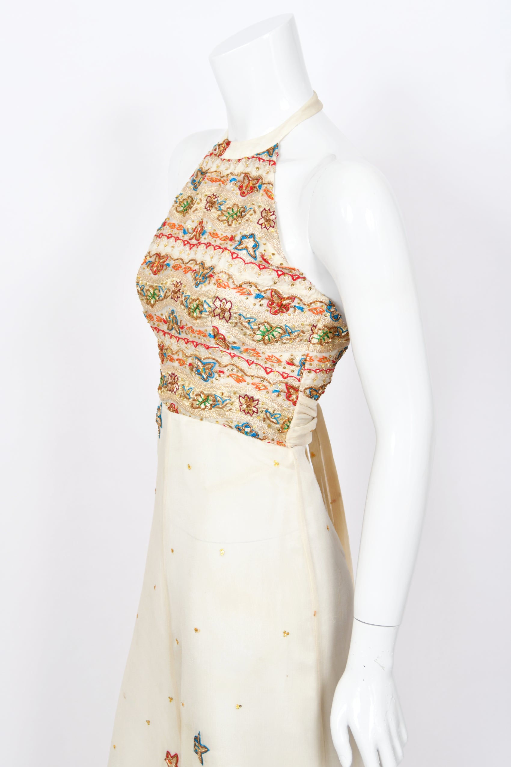 • 1979 Thea Porter Couture Metallic Gold Embroidered Ivory Silk-Chiffon Halter Gown