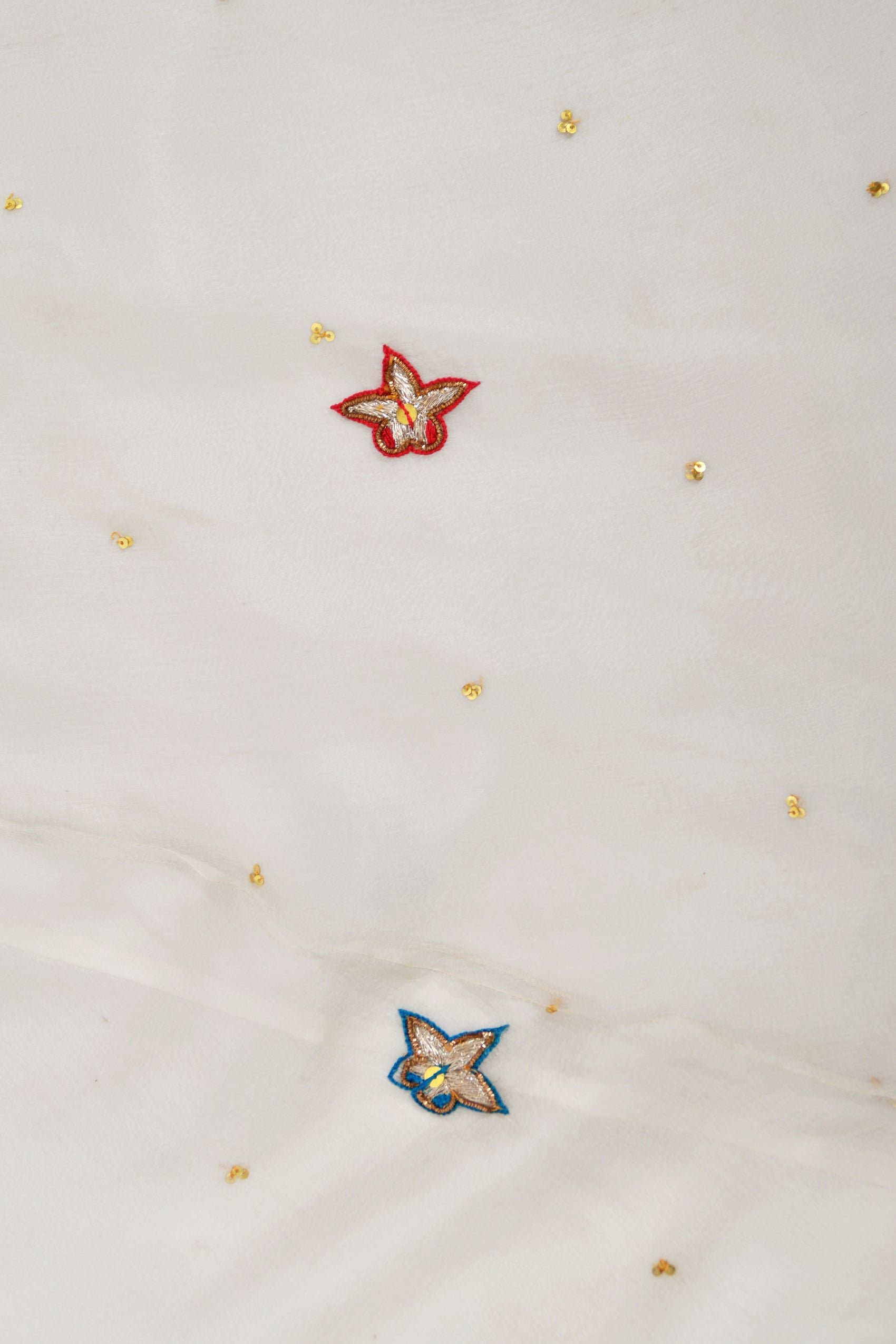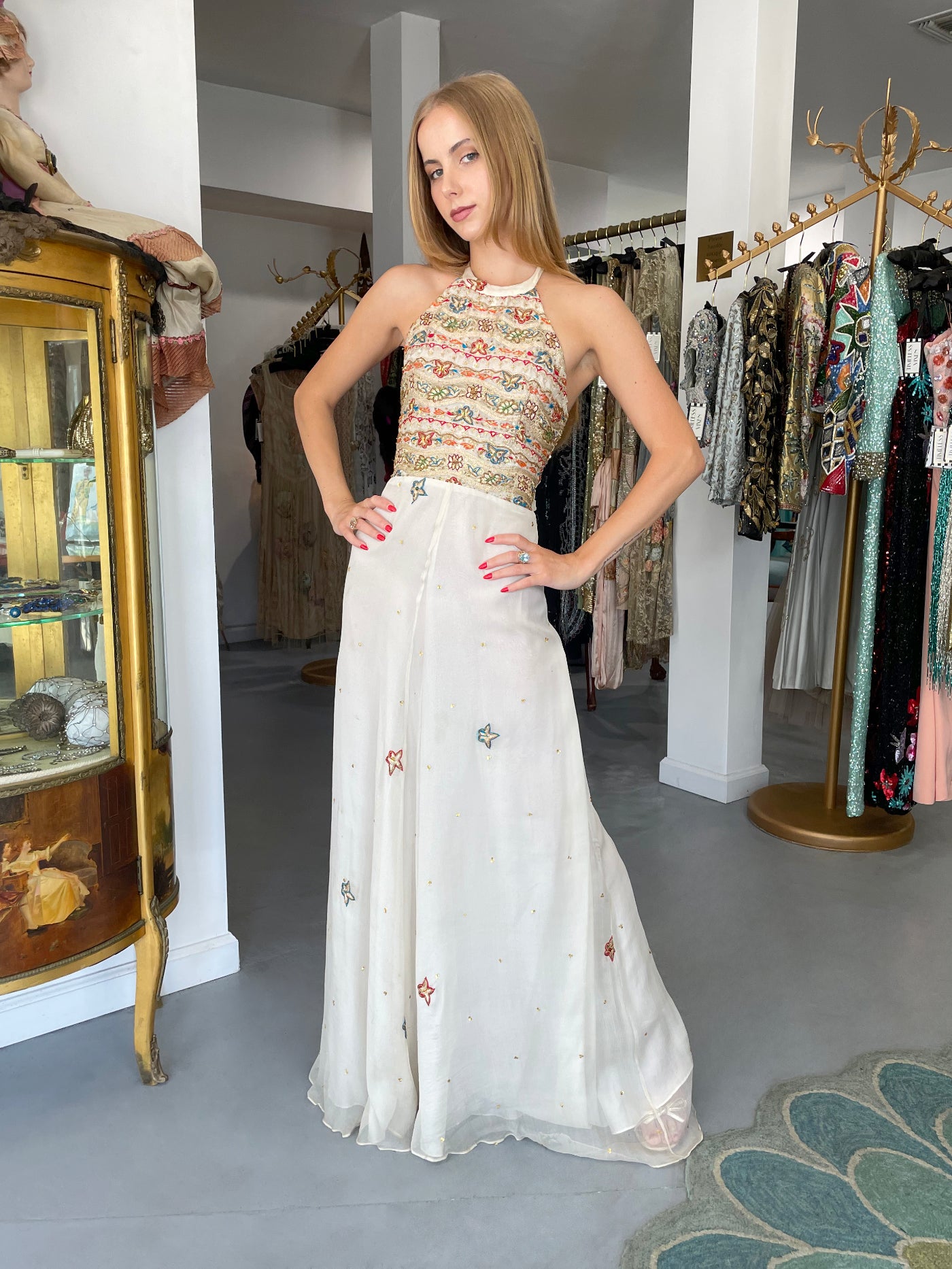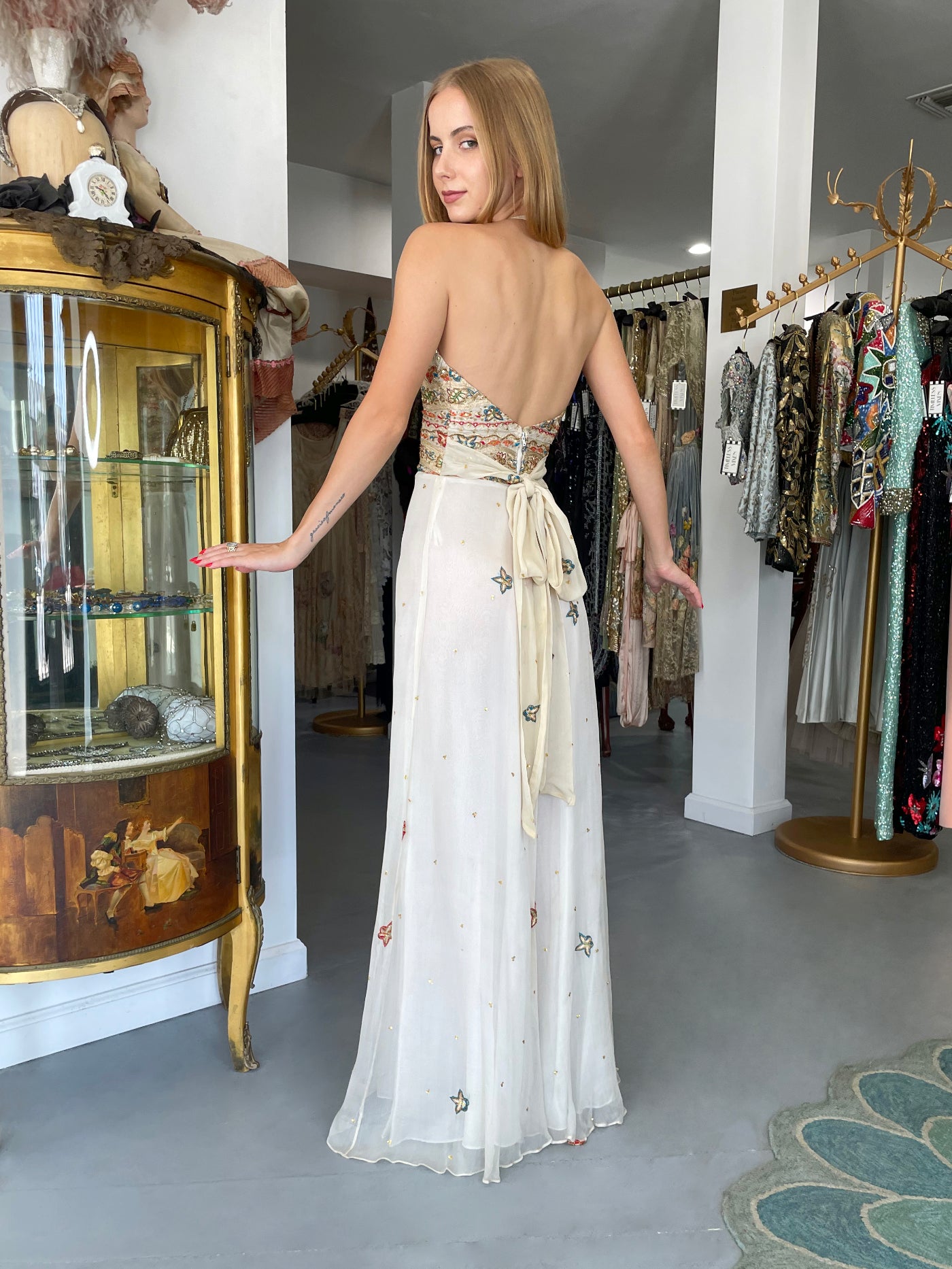 This particular dress captures the effortless opulence of Porter’s handwork. The halter neckline bodice is a chic playground of color and texture— intricately embroidered with metallic gold thread, sequins, and silk floss in an array of jewel tones. Rows of varying floral motifs in shimmering gold, crimson, turquoise, and green are set against a soft ivory base. The embroidery glistens as it catches the light, while the clean, high neckline and fitted bodice beautifully frame the shoulders and collarbone. The dress flows into a fluid ivory silk chiffon skirt, gently flaring with movement. Scattered across the fabric are the same delicate embroidered gold flowers outlined in colored thread, punctuated by tiny gold sequins — subtle details that glimmer like stars in motion. The back of the gown is equally striking, featuring a low-cut open back that ties with a long silk sash bow. This gown is a testament to Porter’s artistry —where texture, handwork, and cut combine to create an ethereal yet undeniably glamorous effect. This dress would be so epic for a gala or modern bride seeking something romantic, original, and historically significant. A wearable work of art from one of fashion’s most visionary British designers.