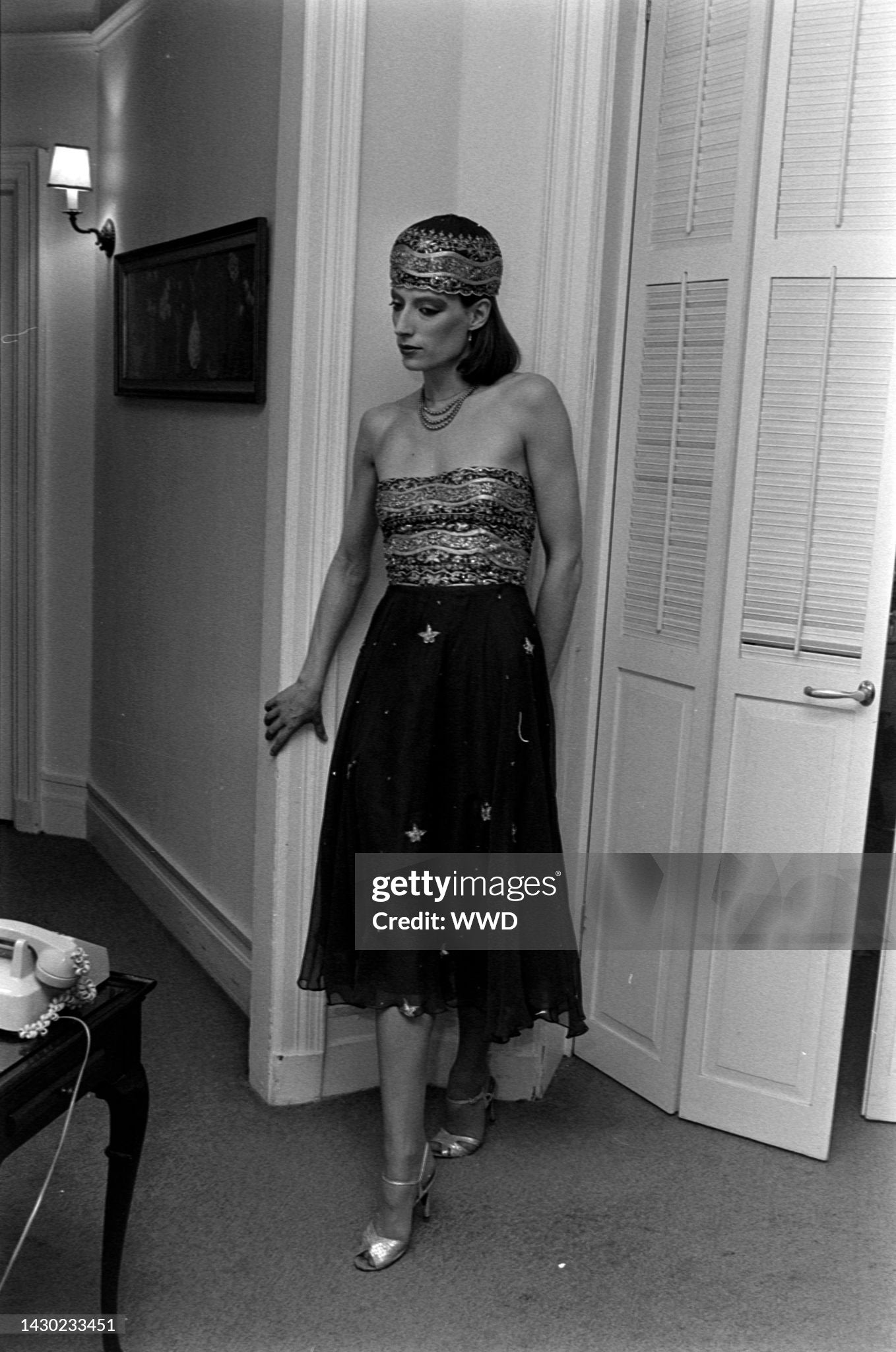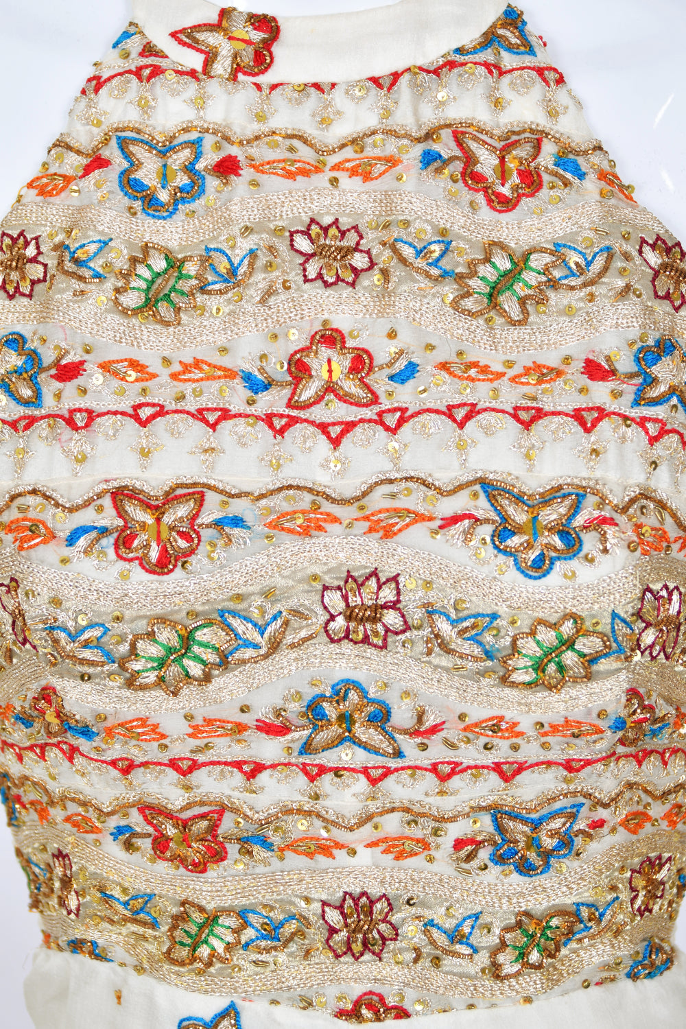 This truly exquisite and incredibly rare Thea Porter couture metallic embroidered halter ivory silk chiffon gown dates back to her 1979 fall-winter collection. Known as the 'Queen of Bohemian Chic', Thea Porter revolutionized 1970s fashion with her richly embroidered garments, drawing inspiration from the textiles and craftsmanship of the Middle East, as well as from Victorian and Renaissance romanticism. Her couture creations were beloved by an elite clientele, from Bianca Jagger and Elizabeth Taylor to Stevie Nicks and Joni Mitchell, all captivated by her signature blend of glamour and ease. As shown, a very similar design was worn by model Sara Kapp for Porter’s fall-winter 1979 runway show.