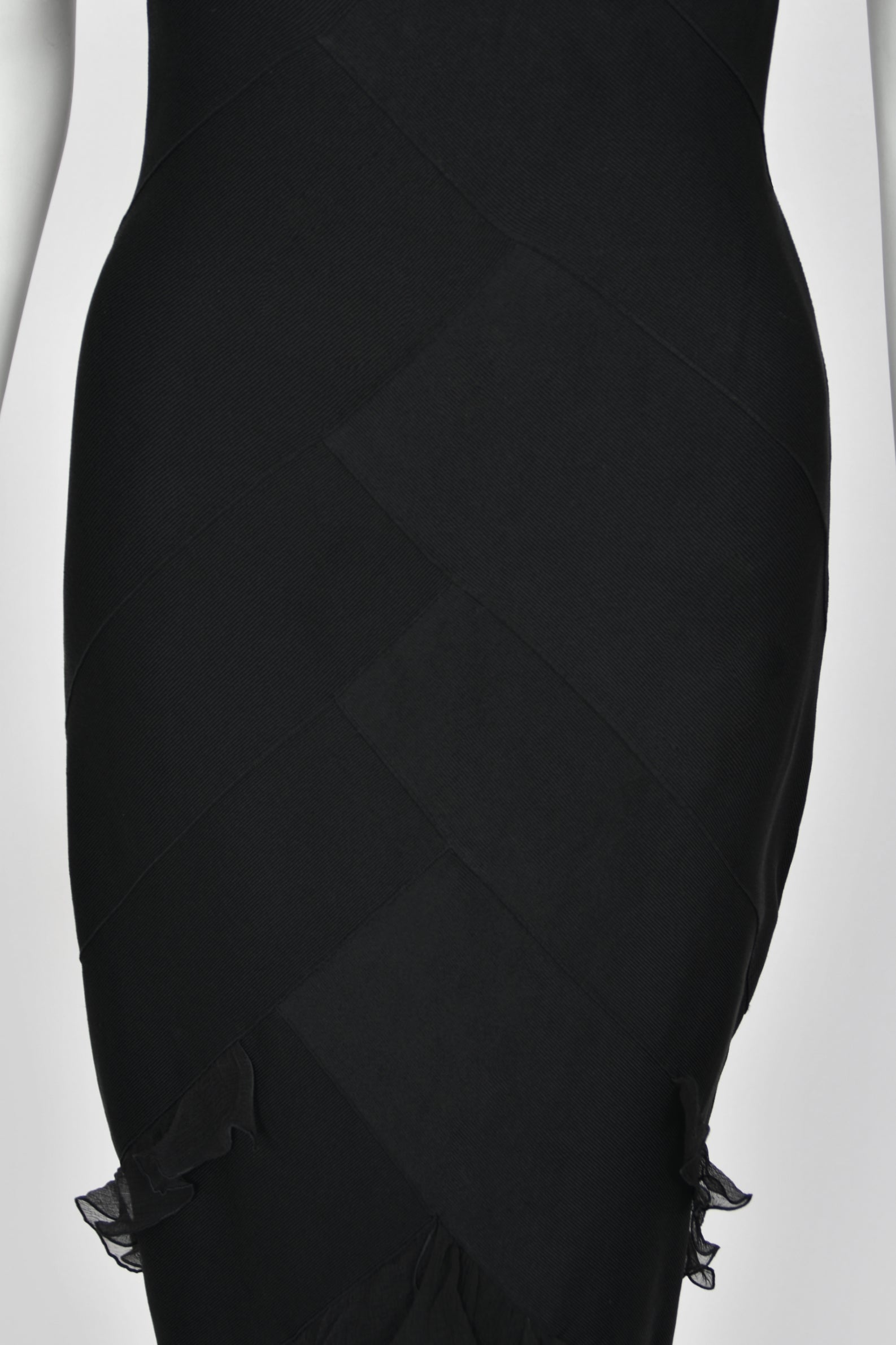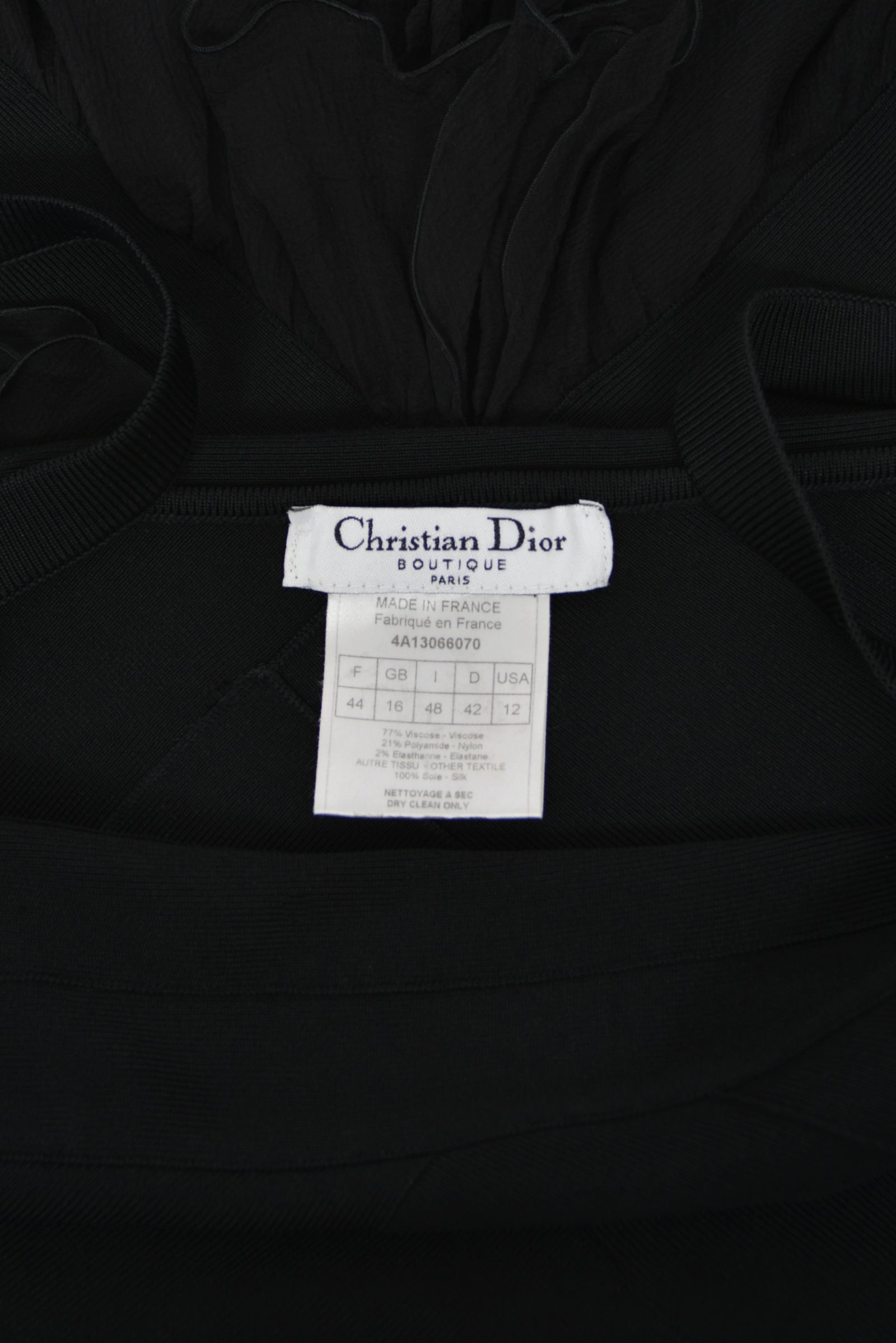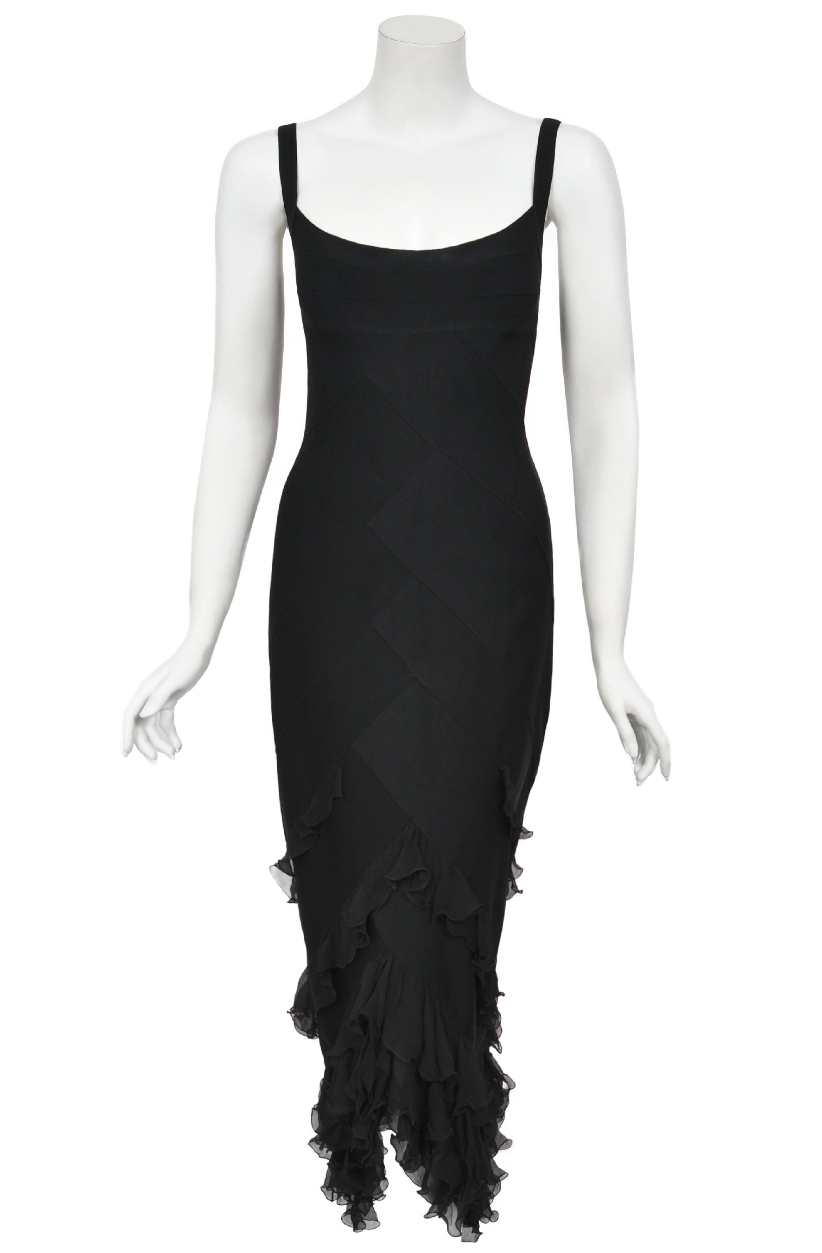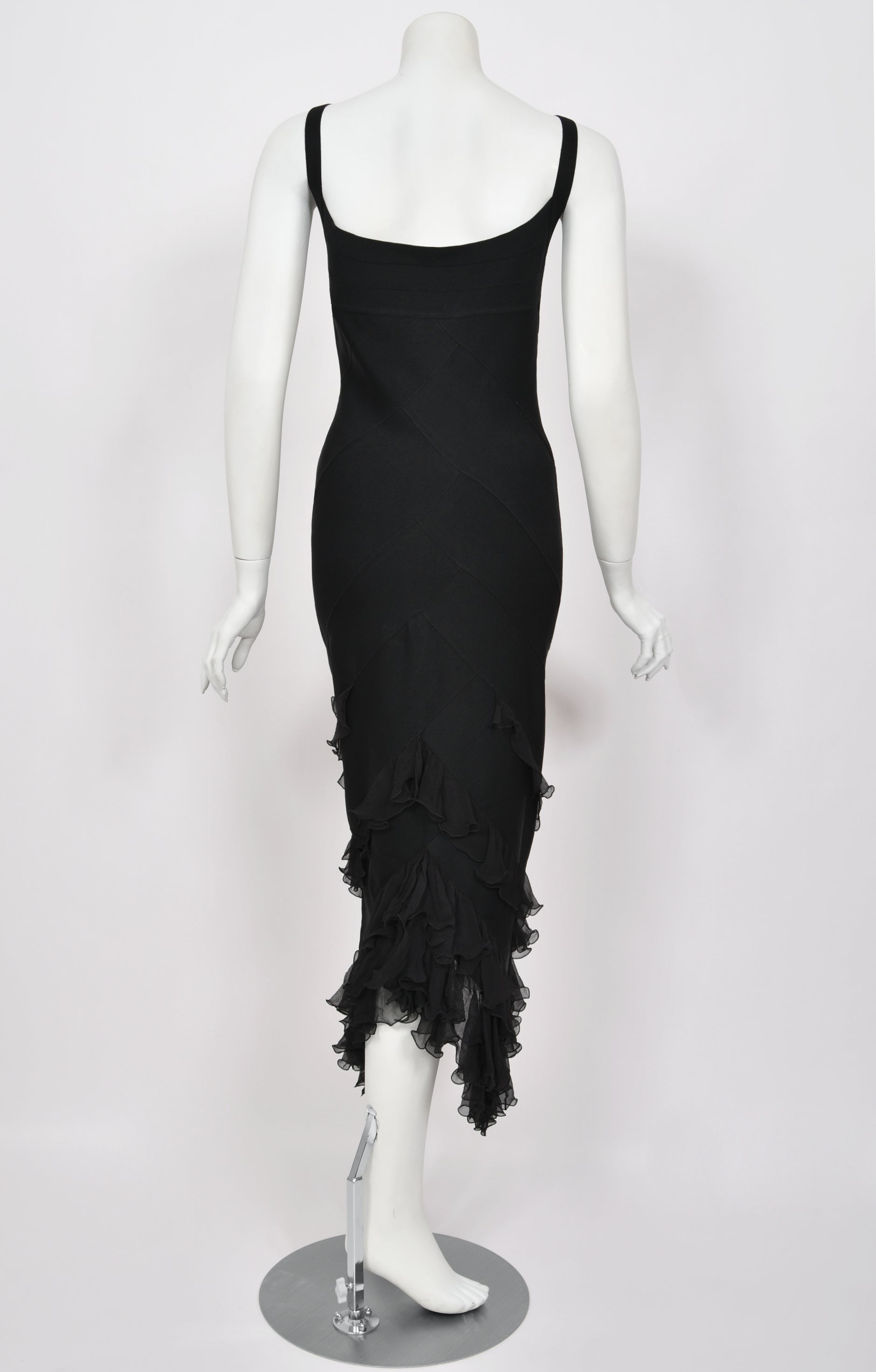 This ultra seductive Christian Dior by John Galliano black stretch-knit ruffle trimmed dress dates back to his 2004 fall/winter collection. This 'little black dress' captures the intoxicating blend of technical mastery and sensual drama that defined Galliano’s tenure at the house. During his years as creative director, Galliano transformed Dior into a playground of fantasy, theatrics, and innovation, leaving a legacy that still shapes the vocabulary of modern fashion.