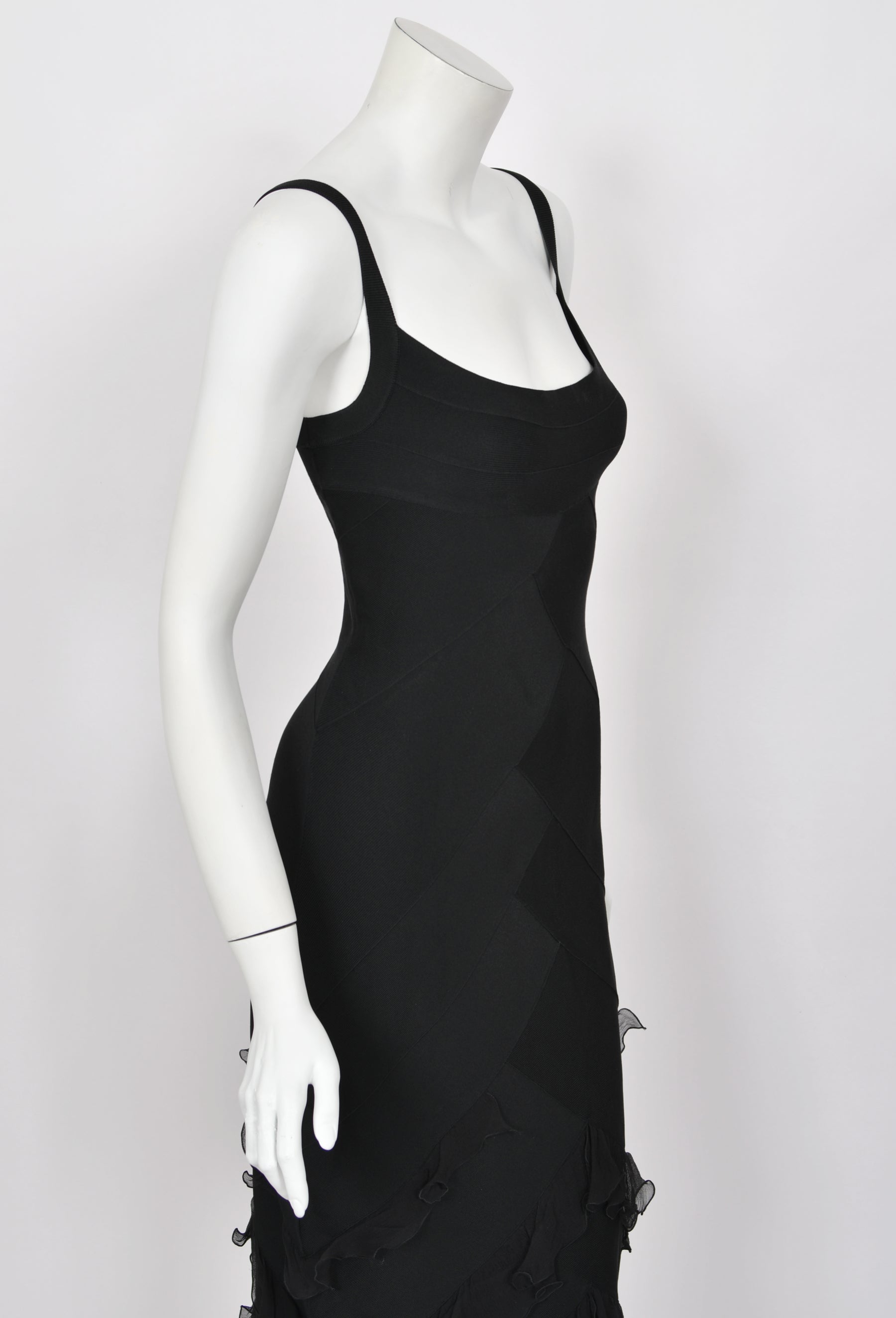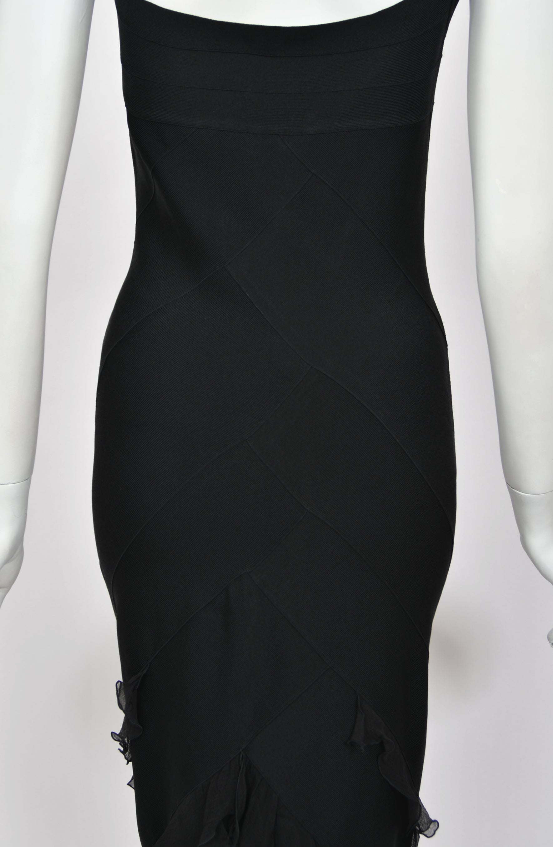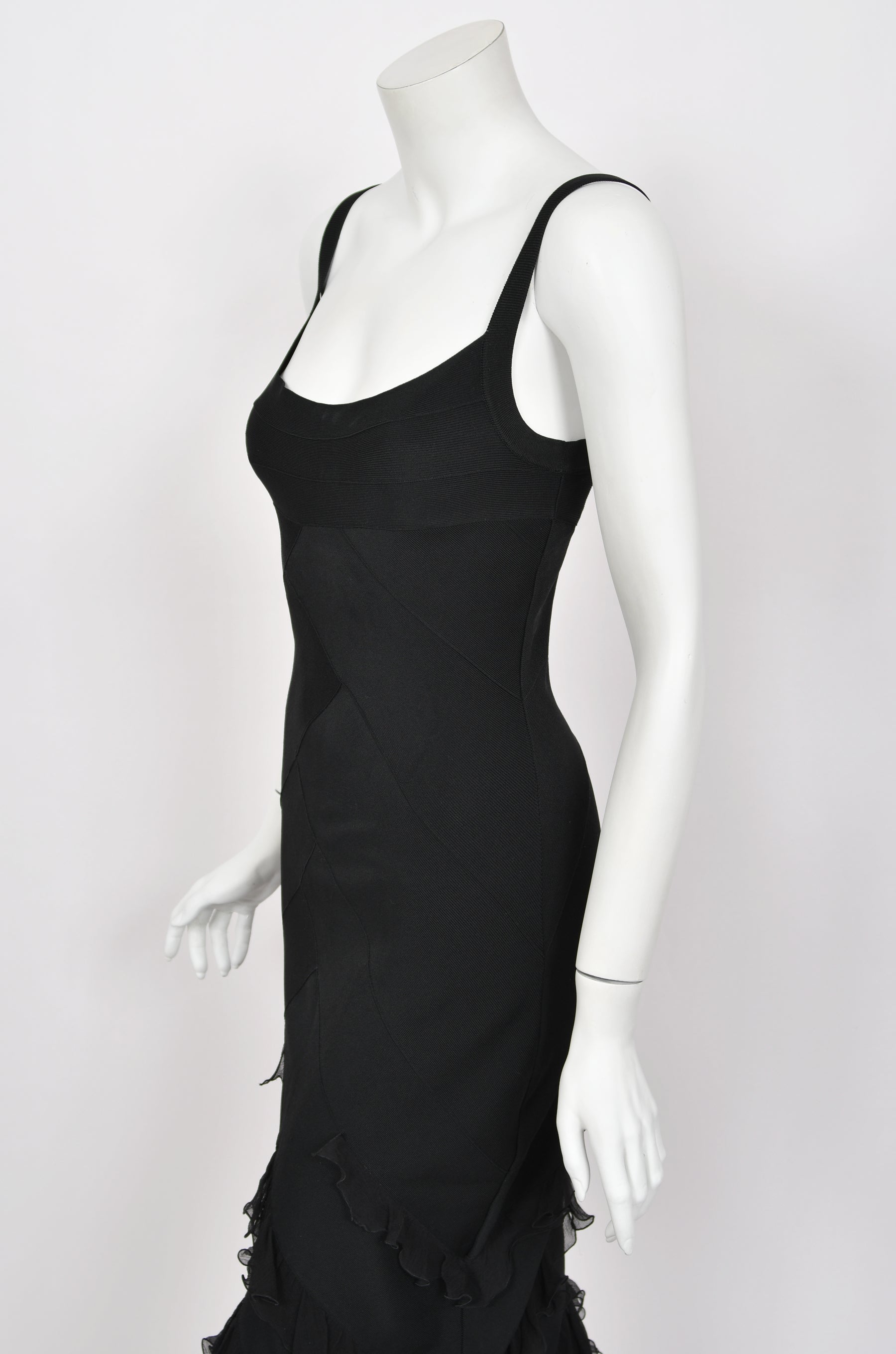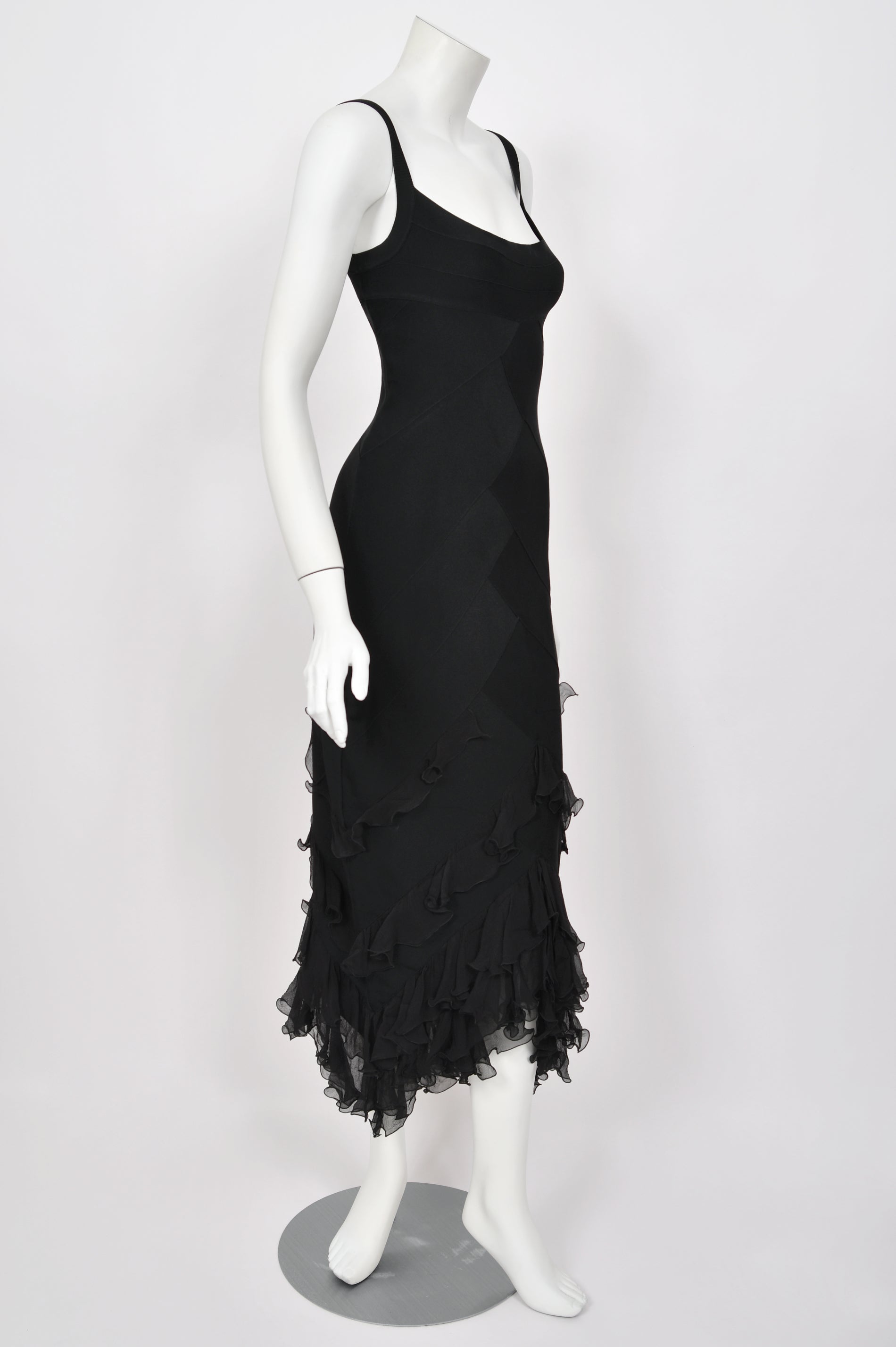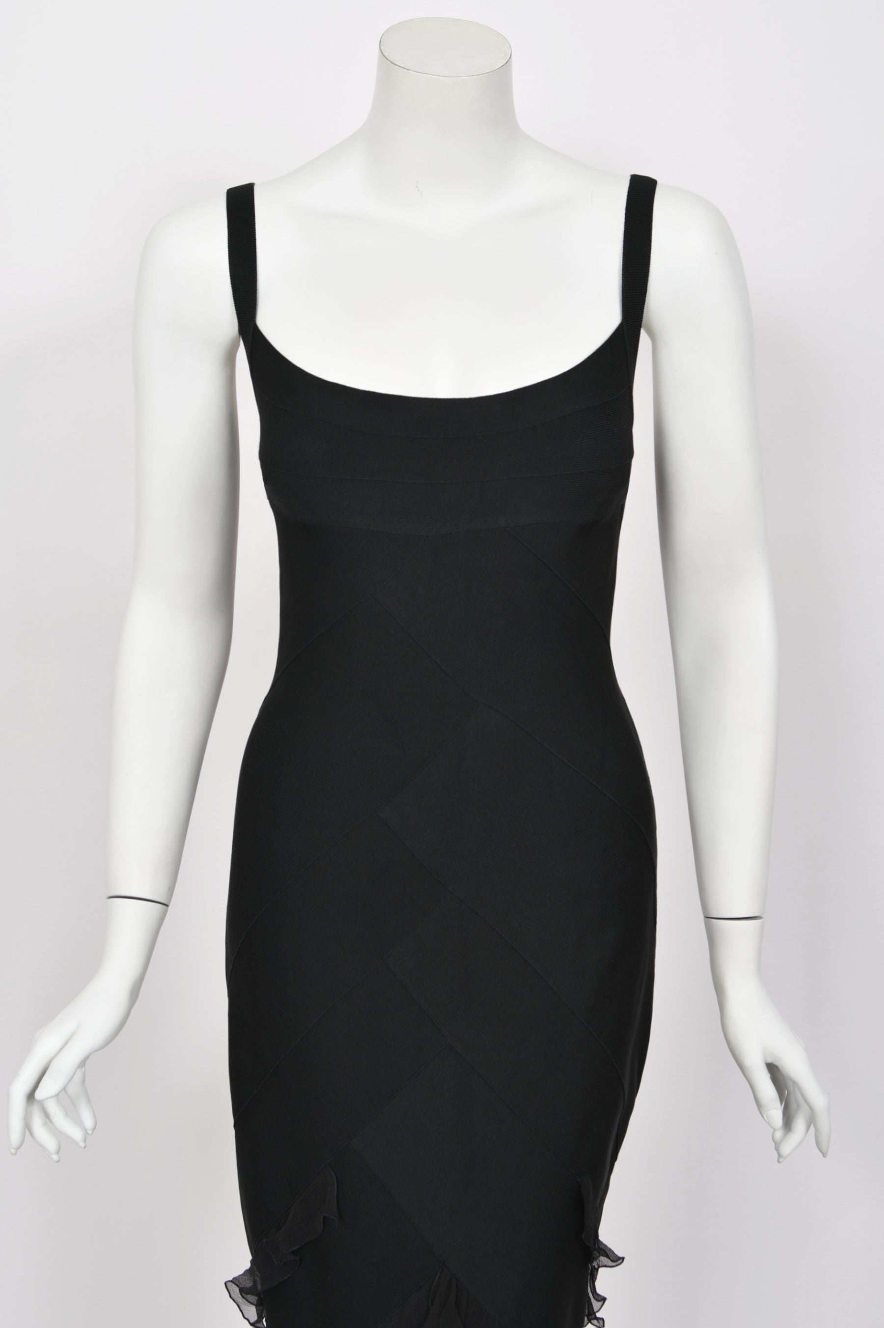 This ultra seductive Christian Dior by John Galliano black stretch-knit ruffle trimmed dress dates back to his 2004 fall/winter collection. This 'little black dress' captures the intoxicating blend of technical mastery and sensual drama that defined Galliano’s tenure at the house. During his years as creative director, Galliano transformed Dior into a playground of fantasy, theatrics, and innovation, leaving a legacy that still shapes the vocabulary of modern fashion.