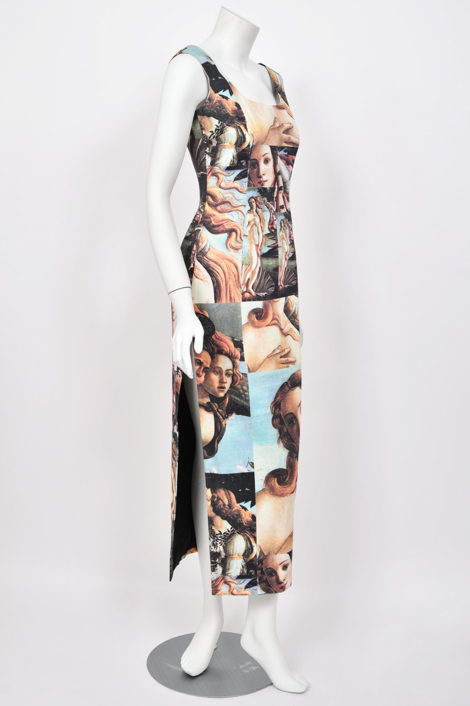 Crafted from the softest mid-weight polished cotton, this dress features a collaged print of Sandro Botticelli’s “The Birth of Venus” — one of the most revered works of the Italian Renaissance. The imagery captures Venus’s ethereal beauty, cascading hair, and divine femininity, rendered in a patchwork-like montage that feels both painterly and avant-garde. The square neckline and scooped back add a subtle sensuality, while the nipped waist and hourglass silhouette beautifully contour the body, celebrating the female form without restriction. A thigh-high slit provides a daring balance to the otherwise classical imagery, lending movement and modernity. The polished cotton fabrication allows the dress to glide effortlessly over the figure, feeling structured yet comfortable. Perfect for red carpet events, art galas, or high-fashion editorial moments, it remains a testament to the enduring power of beauty, art, and Italian couture.