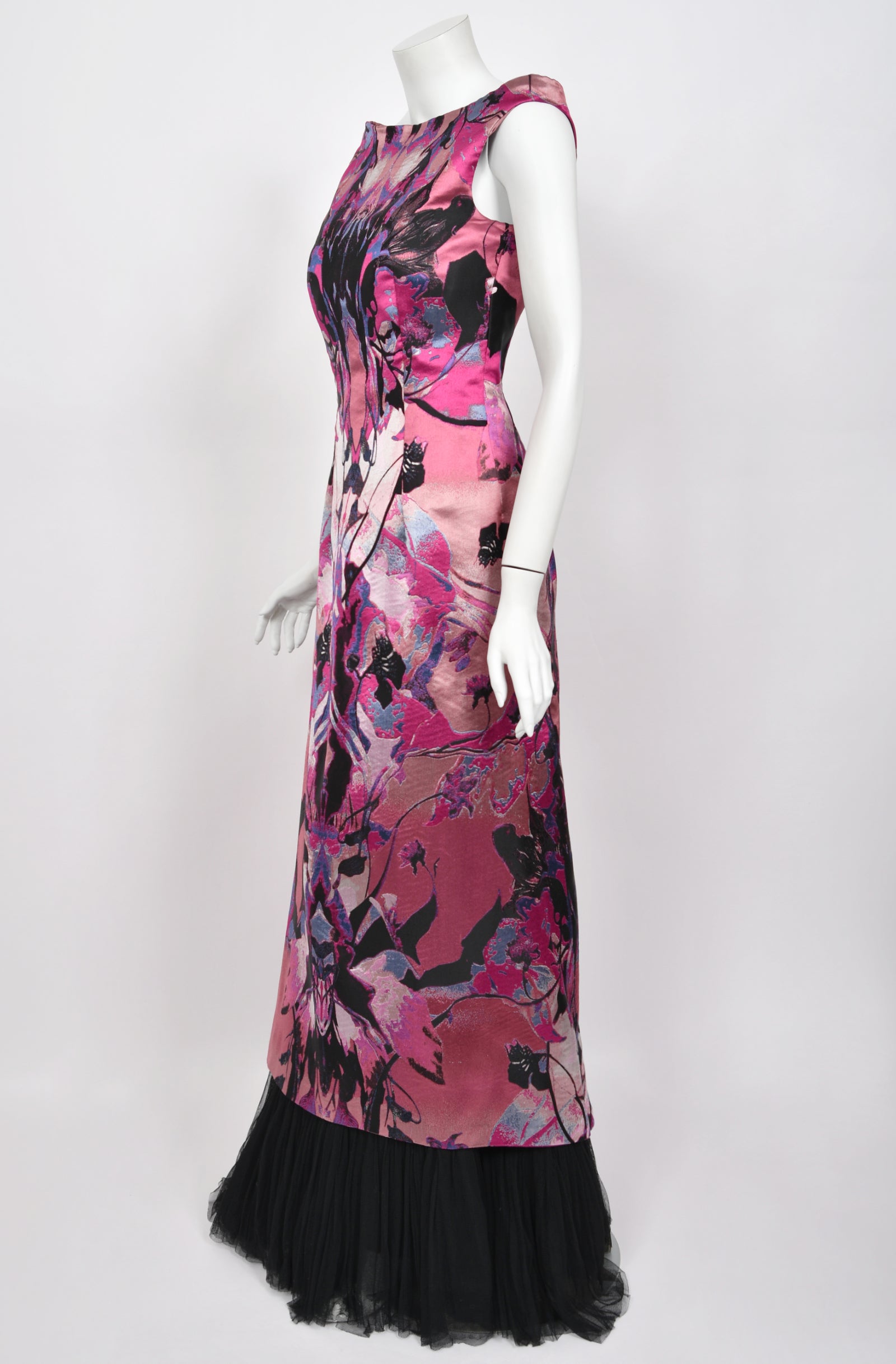• 2010 Alexander McQueen Orchid Print Silk Jacquard & Tulle Asymmetric Bustle Gown