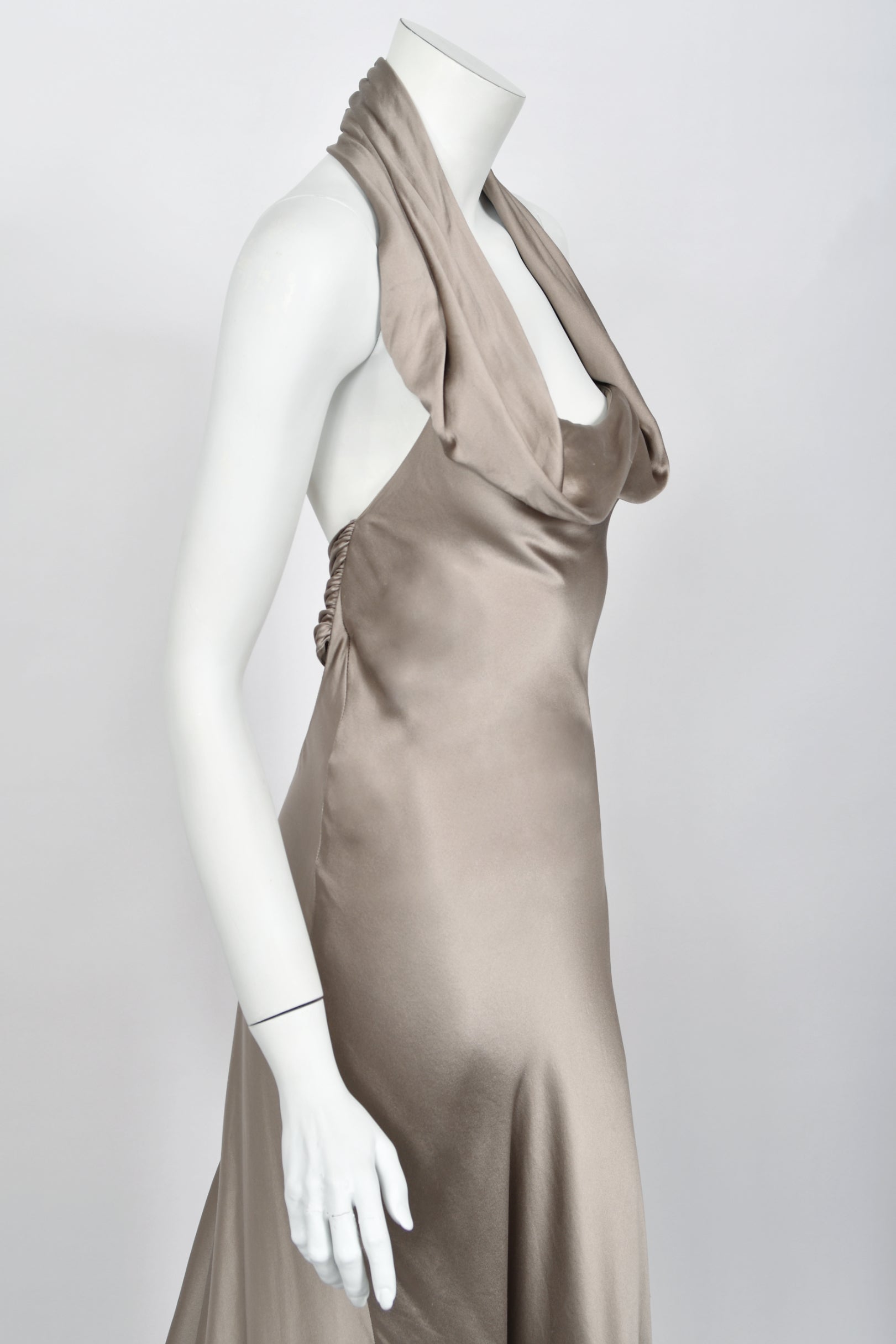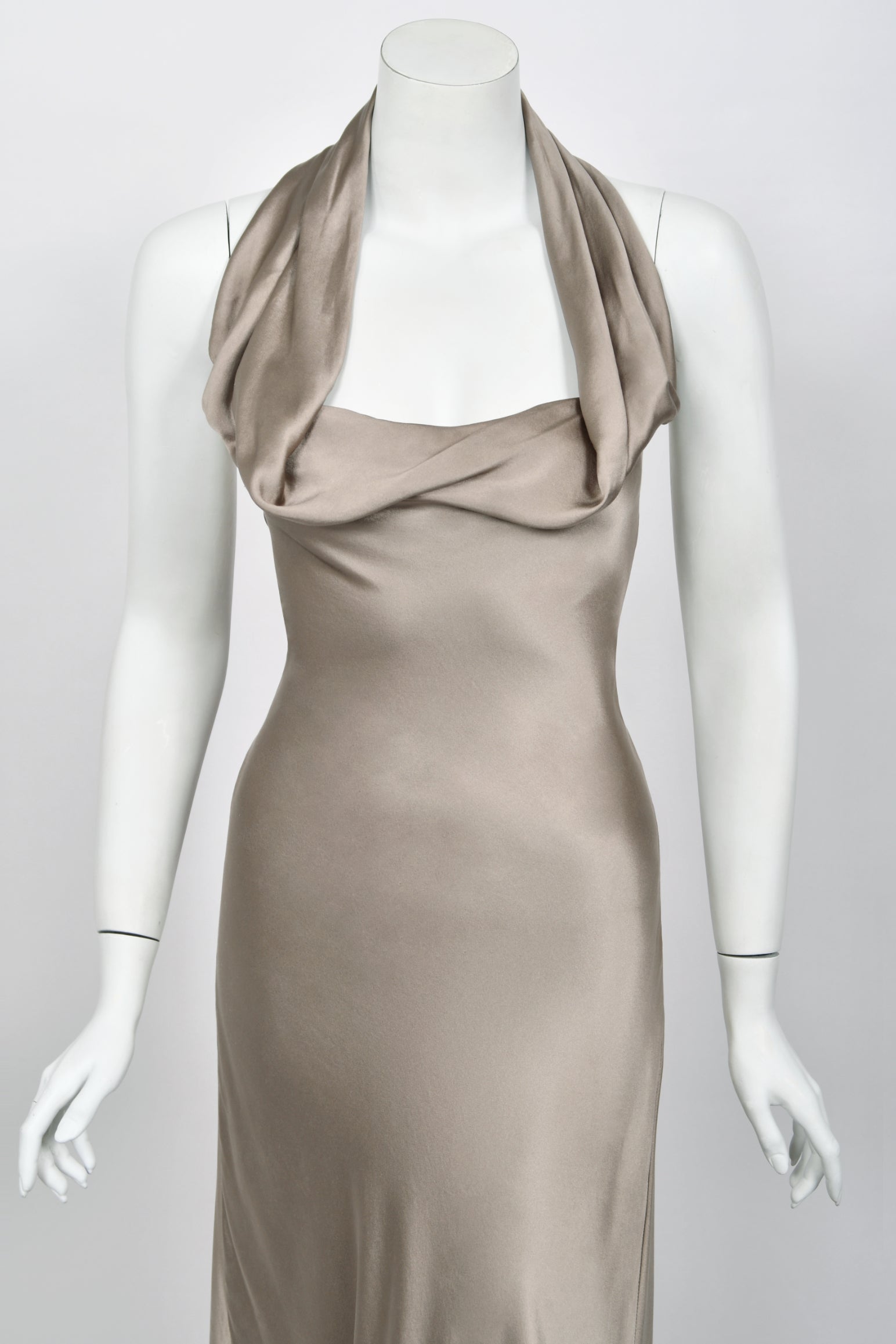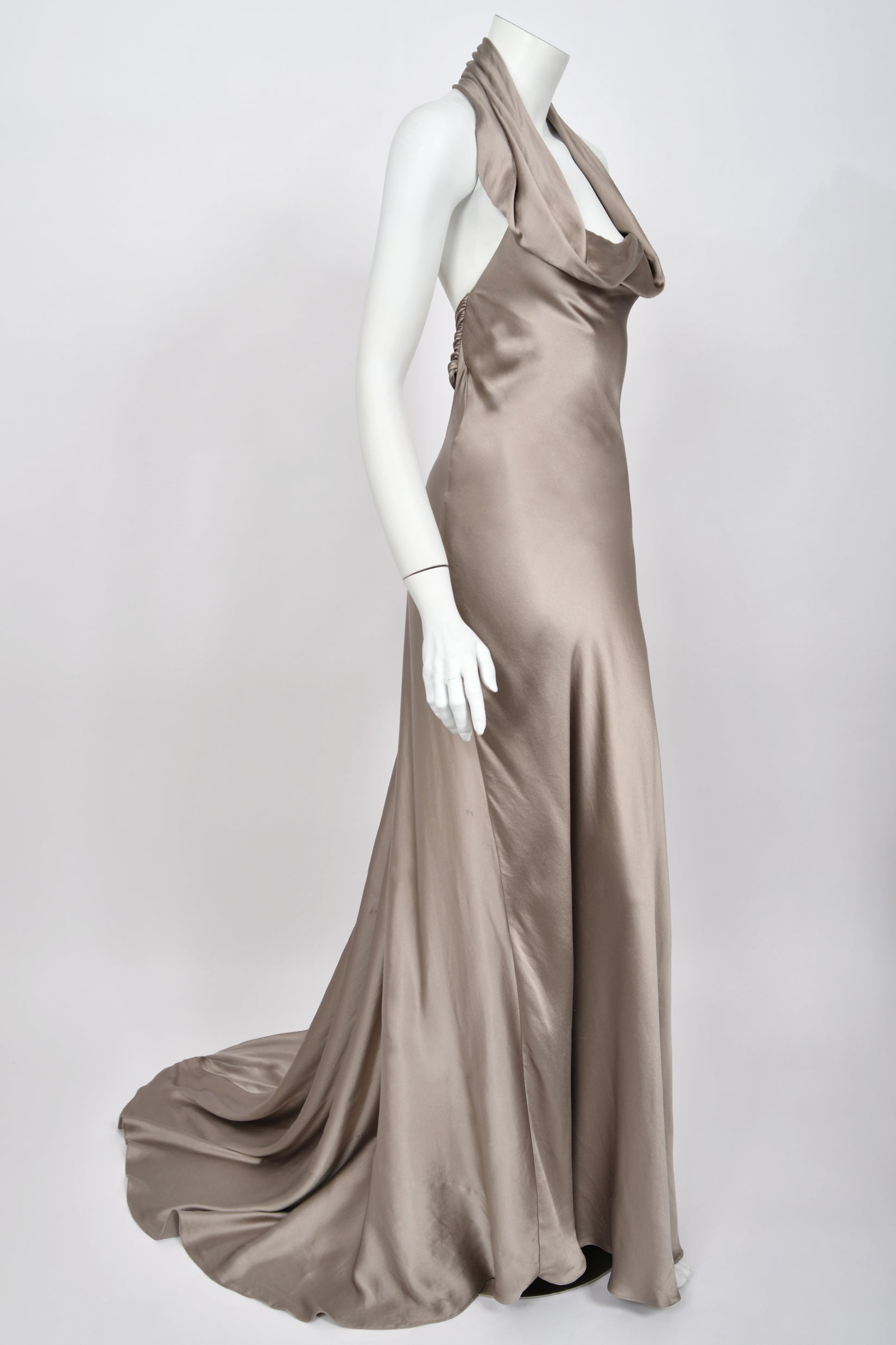 An elegant study in modern 'Old Hollywood' glamour, this Ralph Lauren purple label platinum silk satin gown dates back to his 2014 fall/winter collection. Ralph Lauren built one of the most influential fashion empires, redefining classic style through an idealized vision of sophistication and ease. Renowned for blending cinematic romance with impeccable tailoring, his work finds a clear expression in this gown, marrying refined construction with a sensual, screen-worthy presence. For this special collection Lauren presented a strikingly split show: the opening half introduced his new Polo label, while the latter returned to the heightened elegance of his namesake line. Vogue noted that “there was no mistaking Polo for the Ralph Lauren portion of this outing, which was as elegant as they come, and the designer’s finest work in some time.” This gown closely recalls Look 36, modeled by Karlie Kloss, capturing the same sleek sensibility and fluid restraint. Crafted in luminous platinum silk satin and cut on the bias, the gown skims the body with a liquid drape that elongates the silhouette. The seductive halter bodice is softly sculpted, forming a refined cowl at the neckline that falls with natural ease. The satin glides cleanly through the waist and hips before pooling to the floor. Included is a matching oversized sash, offering versatile styling options—worn as a dramatic shawl, wrapped at the neck, or styled as an elegant head covering. The back reveals a striking open design, anchored by a ruched satin band that fastens discreetly at the center. From there, the skirt flows into a sweeping train that trails gracefully behind, complete with a subtle finger loop that allows it to be gathered and carried with poise. The perfect 'silver screen starlet' 1930's vibe! This epic Ralph Lauren would be perfect for any wedding or red carpet affair.