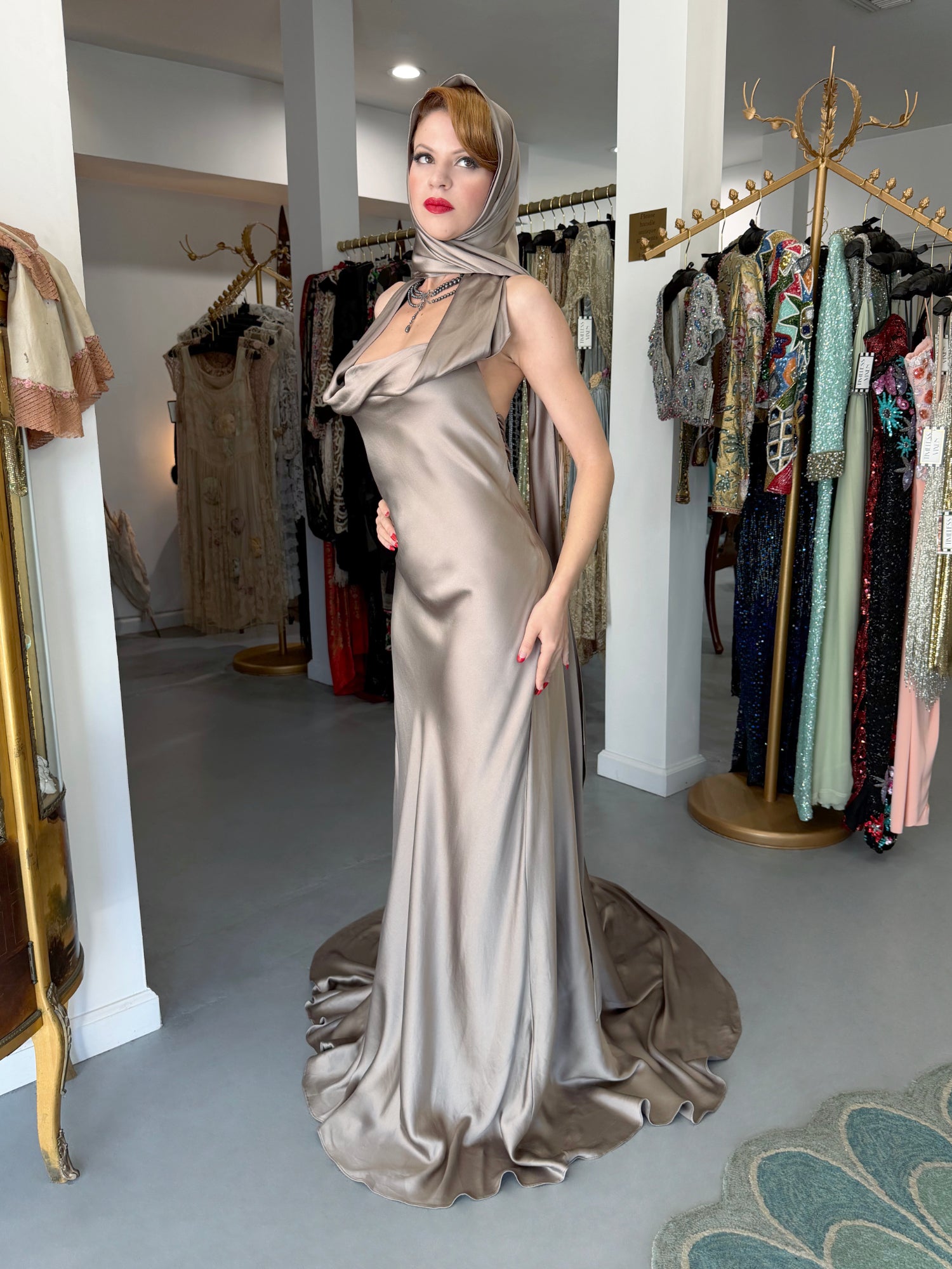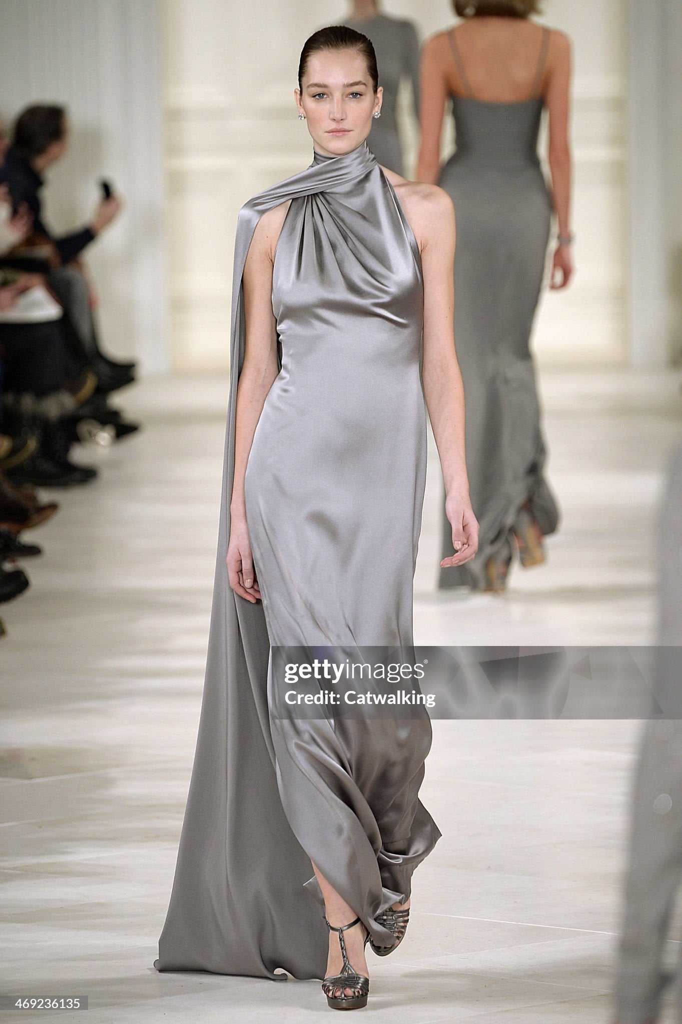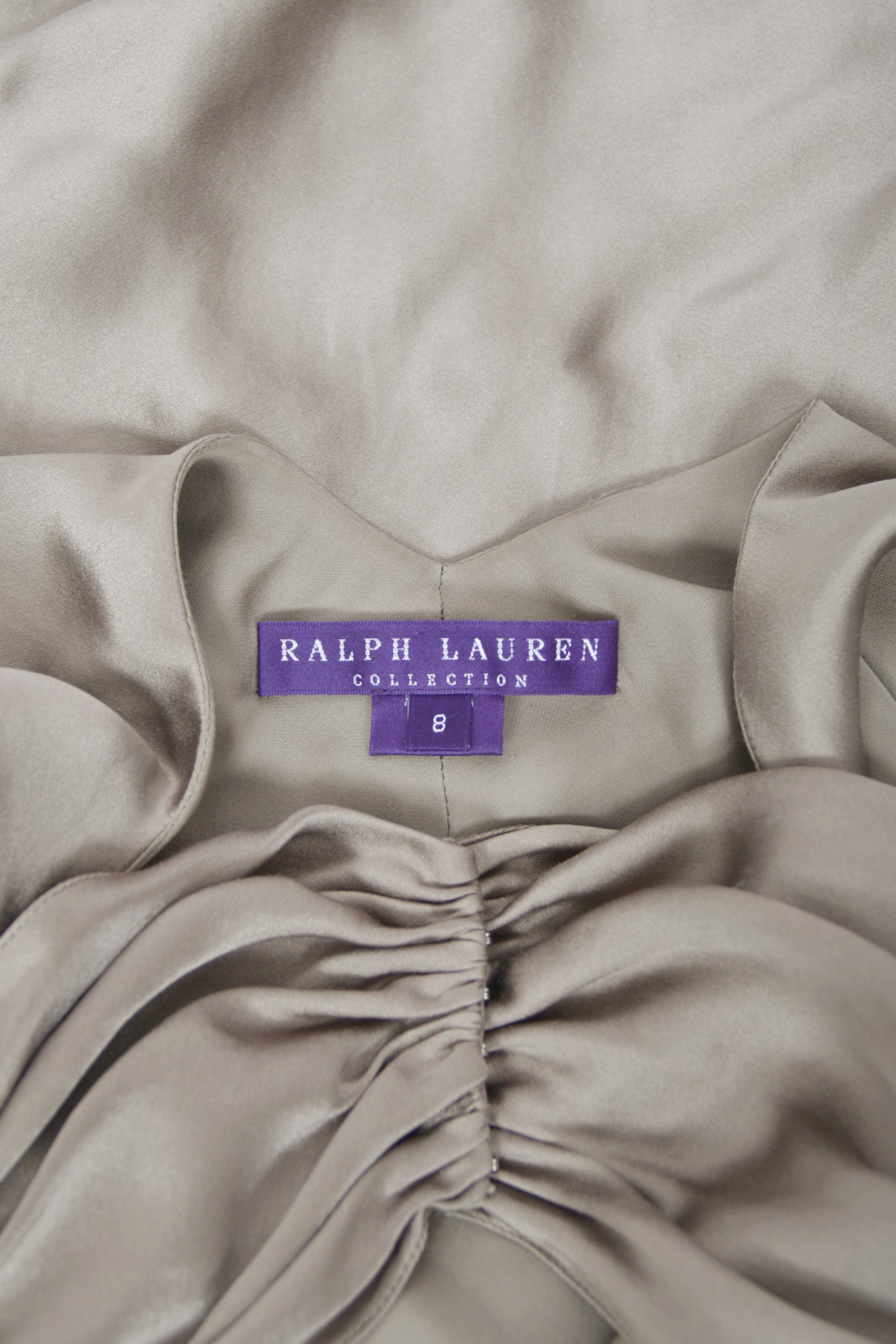 An elegant study in modern 'Old Hollywood' glamour, this Ralph Lauren purple label platinum silk satin gown dates back to his 2014 fall/winter collection. Ralph Lauren built one of the most influential fashion empires, redefining classic style through an idealized vision of sophistication and ease. Renowned for blending cinematic romance with impeccable tailoring, his work finds a clear expression in this gown, marrying refined construction with a sensual, screen-worthy presence. For this special collection Lauren presented a strikingly split show: the opening half introduced his new Polo label, while the latter returned to the heightened elegance of his namesake line. Vogue noted that “there was no mistaking Polo for the Ralph Lauren portion of this outing, which was as elegant as they come, and the designer’s finest work in some time.” This gown closely recalls Look 36, modeled by Karlie Kloss, capturing the same sleek sensibility and fluid restraint. Crafted in luminous platinum silk satin and cut on the bias, the gown skims the body with a liquid drape that elongates the silhouette. The seductive halter bodice is softly sculpted, forming a refined cowl at the neckline that falls with natural ease. The satin glides cleanly through the waist and hips before pooling to the floor. Included is a matching oversized sash, offering versatile styling options—worn as a dramatic shawl, wrapped at the neck, or styled as an elegant head covering. The back reveals a striking open design, anchored by a ruched satin band that fastens discreetly at the center. From there, the skirt flows into a sweeping train that trails gracefully behind, complete with a subtle finger loop that allows it to be gathered and carried with poise. The perfect 'silver screen starlet' 1930's vibe! This epic Ralph Lauren would be perfect for any wedding or red carpet affair.