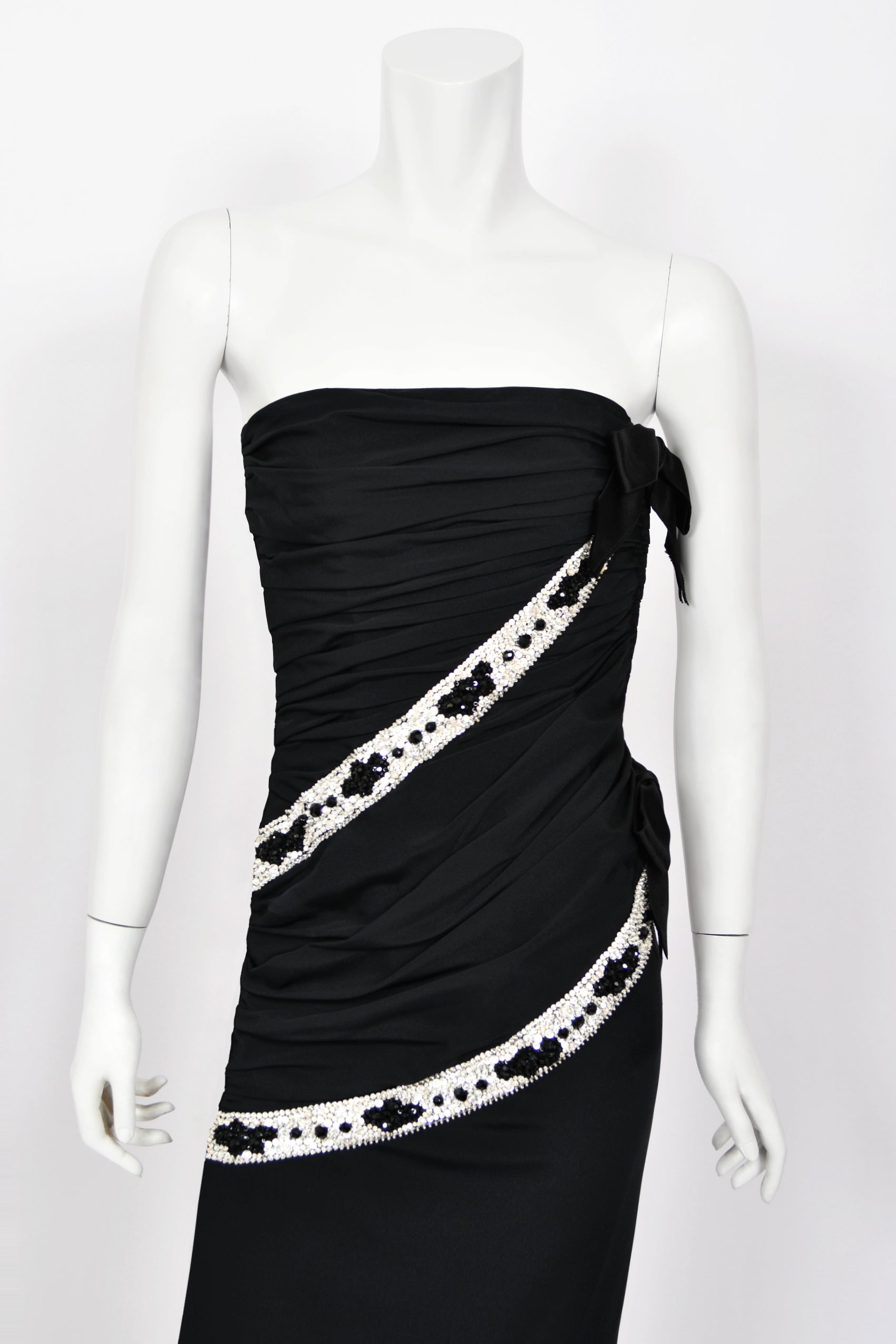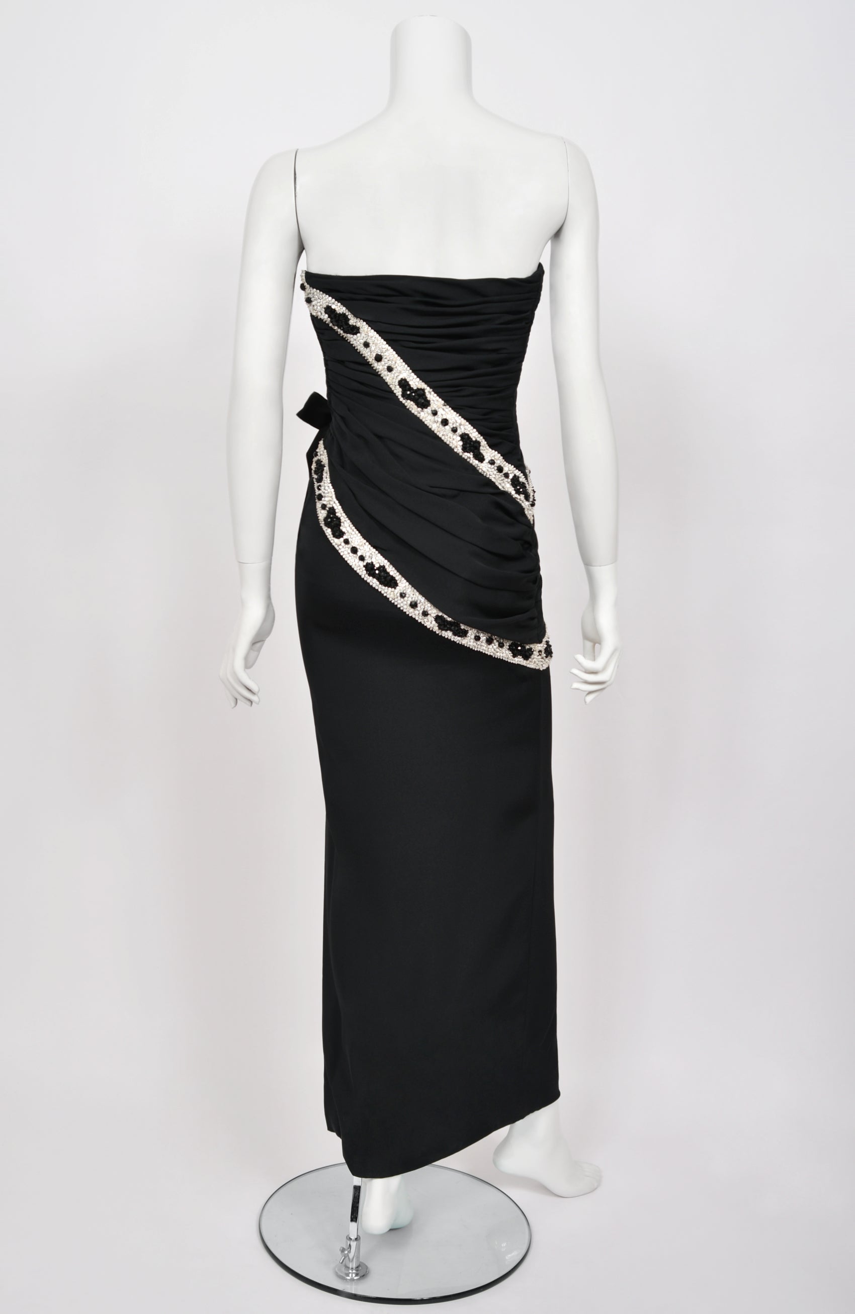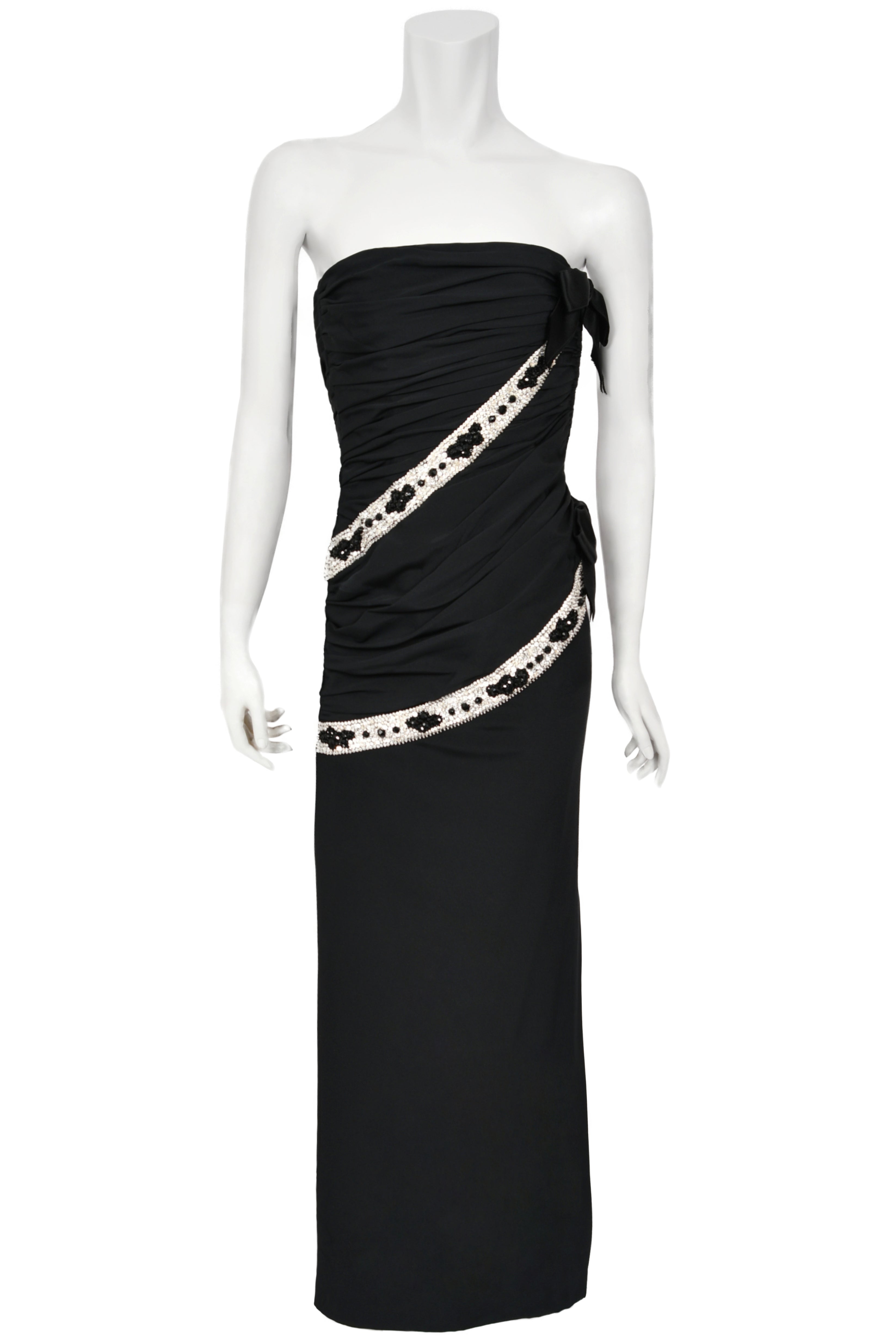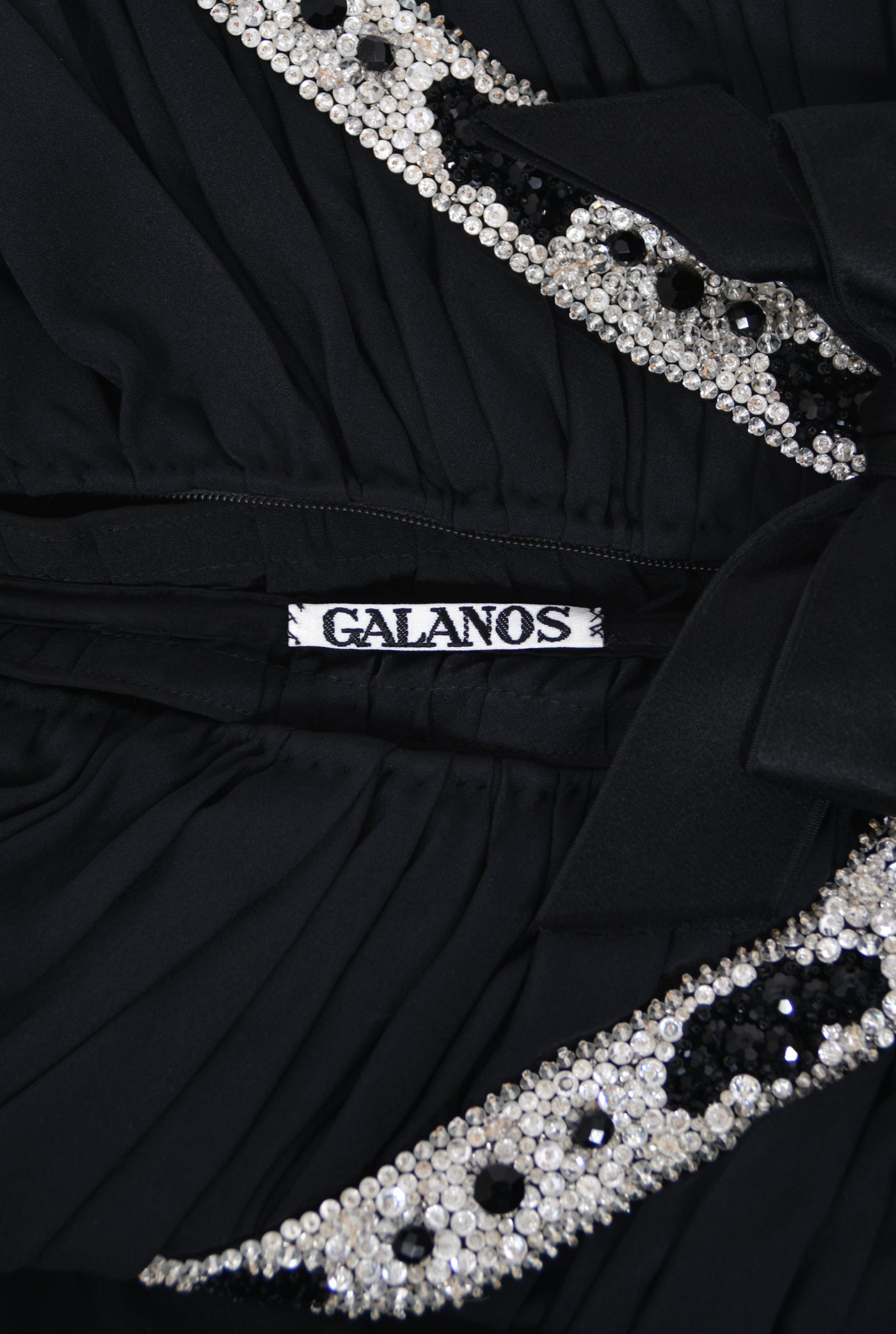 This simply exquisite Galanos crystal-beaded black silk hourglass gown dates back to his 1984 fall-winter couture collection. James Galanos—celebrated for his exacting workmanship and understanding of the female form—built a legacy centered on couture-level construction produced entirely in the United States. His work shaped the aesthetic of sophisticated American dressing, earning a devoted clientele that included Marilyn Monroe, Elizabeth Taylor, Grace Kelly and Diana Ross! This ultra chic black gown showcases a sleek strapless fully-boned corset bodice crafted from ruched silk that molds gracefully to the torso, creating a sculpted elongated profile. The meticulously soft folds sweep diagonally across the body, offering dimension without excess.The hourglass shape is further emphasized by the fluid column skirt, which releases into a seductive side slit for just the right amount of movement and allure. The most captivating feature is the pair of sinuous beaded bands that wrap around the dress. Composed of jet black paillettes, faceted stones, and shimmering crystal clusters, each band begins at a satin bow on one side of the gown, then travels in a graceful diagonal before converging into a precise point on the opposite hip. The embellishment continues around the back, forming a continuous jeweled pathway that highlights every curve. This graphic yet refined detail is quintessential Galanos: opulent in execution and astonishing in craft. We found a photo of Ivana Trump in the identical gown while attending the White House dinner honoring King Fahd of Saudi Arabia on February 11, 1985. Couture Galanos garments are treasured for their artistry and uncompromising quality. This gorgeous gown is an extraordinary choice where timeless sophistication is required.