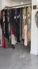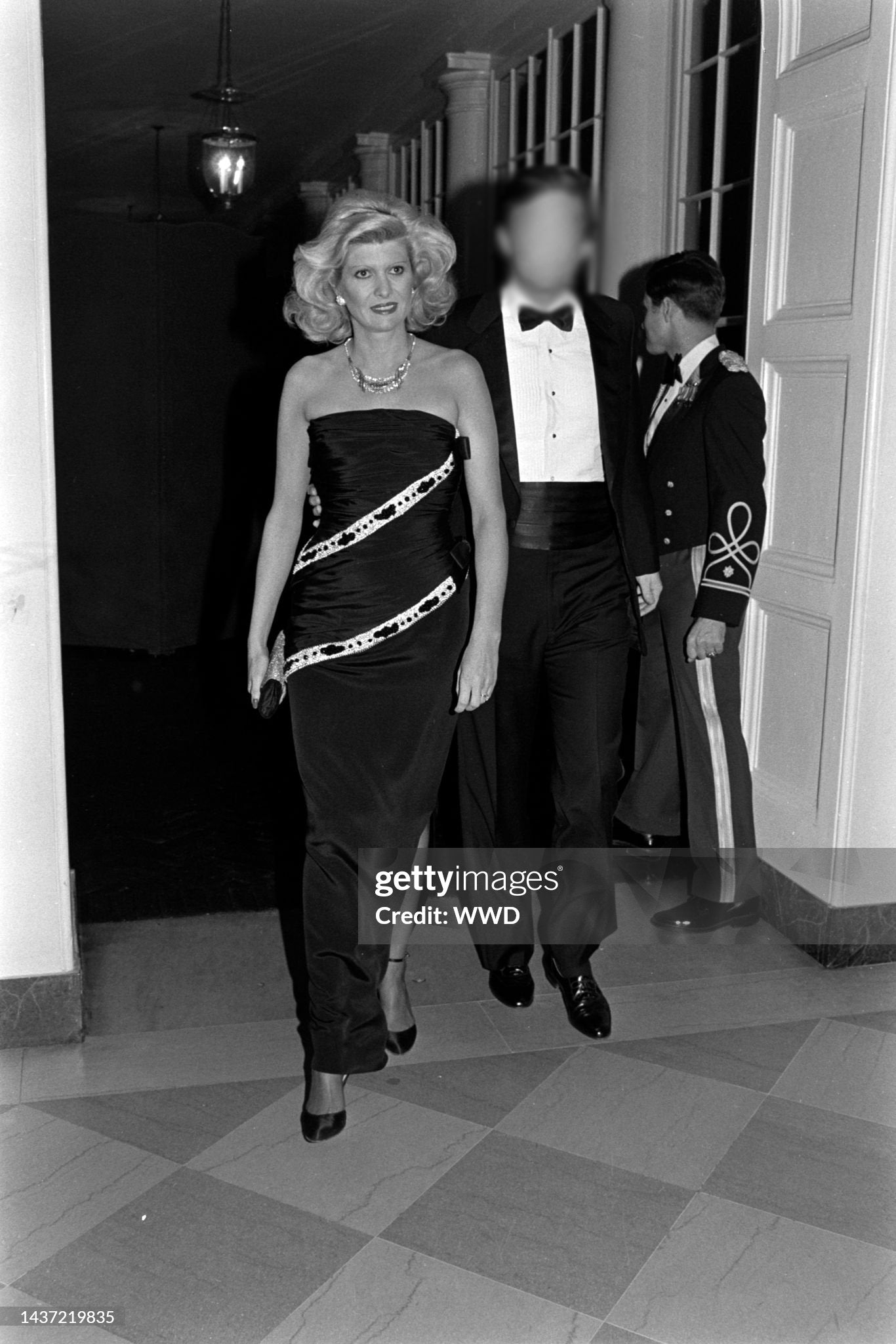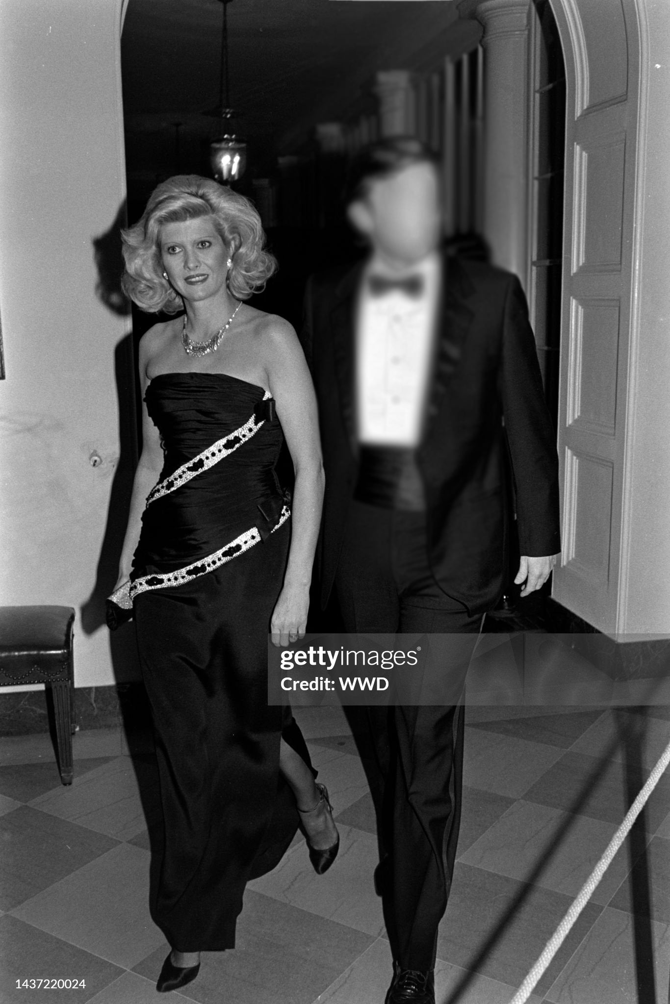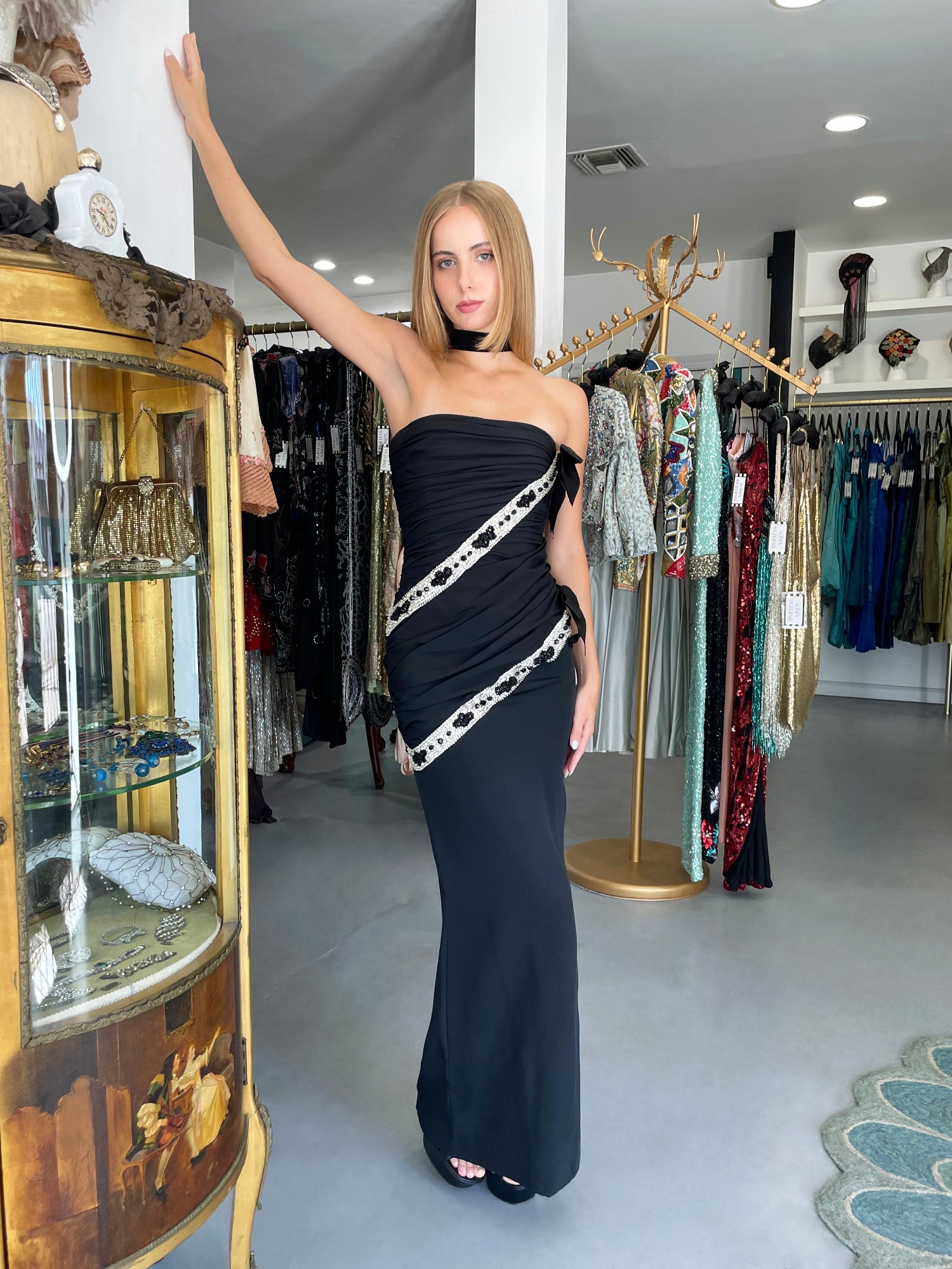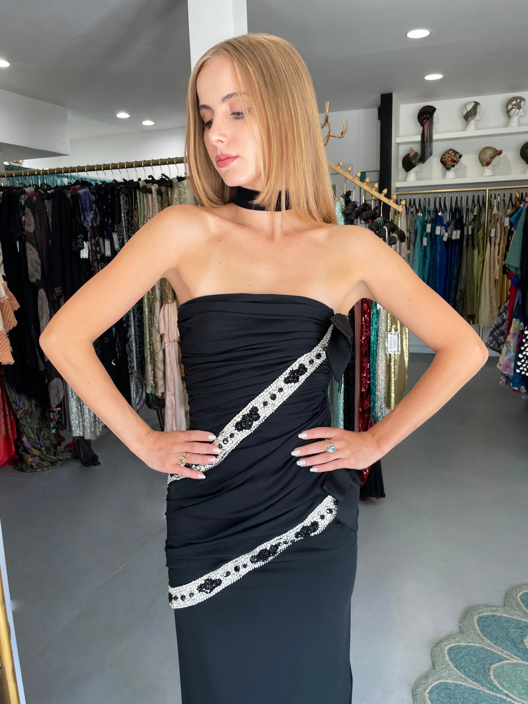 This simply exquisite Galanos crystal-beaded black silk hourglass gown dates back to his 1984 fall-winter couture collection. James Galanos—celebrated for his exacting workmanship and understanding of the female form—built a legacy centered on couture-level construction produced entirely in the United States. His work shaped the aesthetic of sophisticated American dressing, earning a devoted clientele that included Marilyn Monroe, Elizabeth Taylor, Grace Kelly and Diana Ross! This ultra chic black gown showcases a sleek strapless fully-boned corset bodice crafted from ruched silk that molds gracefully to the torso, creating a sculpted elongated profile. The meticulously soft folds sweep diagonally across the body, offering dimension without excess.The hourglass shape is further emphasized by the fluid column skirt, which releases into a seductive side slit for just the right amount of movement and allure. The most captivating feature is the pair of sinuous beaded bands that wrap around the dress. Composed of jet black paillettes, faceted stones, and shimmering crystal clusters, each band begins at a satin bow on one side of the gown, then travels in a graceful diagonal before converging into a precise point on the opposite hip. The embellishment continues around the back, forming a continuous jeweled pathway that highlights every curve. This graphic yet refined detail is quintessential Galanos: opulent in execution and astonishing in craft. We found a photo of Ivana Trump in the identical gown while attending the White House dinner honoring King Fahd of Saudi Arabia on February 11, 1985. Couture Galanos garments are treasured for their artistry and uncompromising quality. This gorgeous gown is an extraordinary choice where timeless sophistication is required.