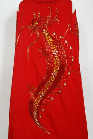 A truly unique and ultra seductive documented custom couture burlesque stage gown ensemble for performer Carol Stanish, dating back to the mid 1950's. This captivating showstopper even comes with an image of the original dancer performing! The whole look must have taken weeks to complete. The fabrication is truly magnificent; prong set rhinestones and a rainbow of hand beaded over-sized jewels worked into the a dramatic wrap-around dragon motif. I love the rhinestone straps and matching fingerless gloves. The low-cut plunge sweetheart bodice with narrowing wiggle skirt is so figure flattering. The matching full length red sleeveless cape vest is a statement piece in it's own right. We added many pictures so you can appreciate this masterpiece. A complete ensemble like this is a true piece of theatrical burlesque costume history.