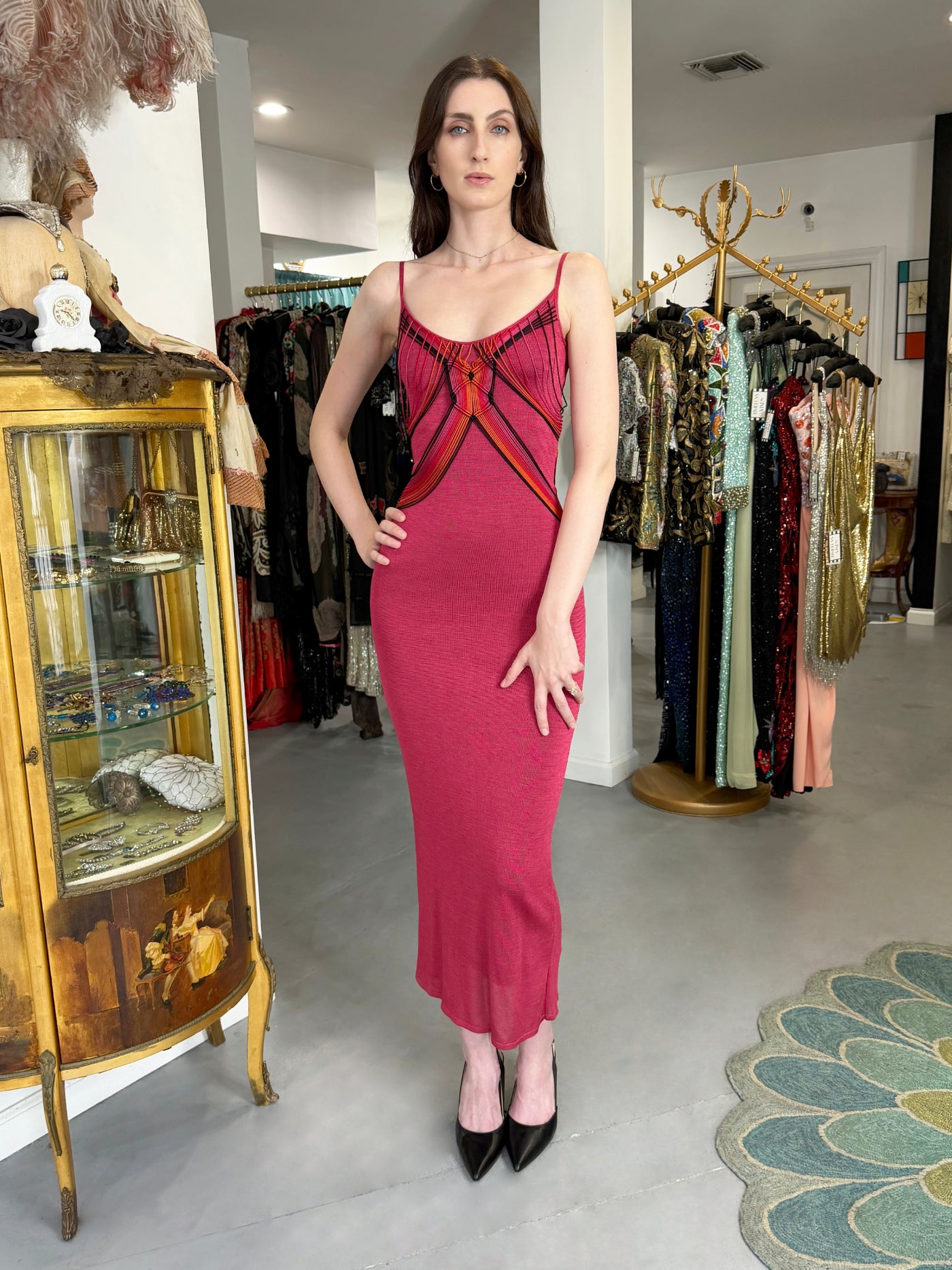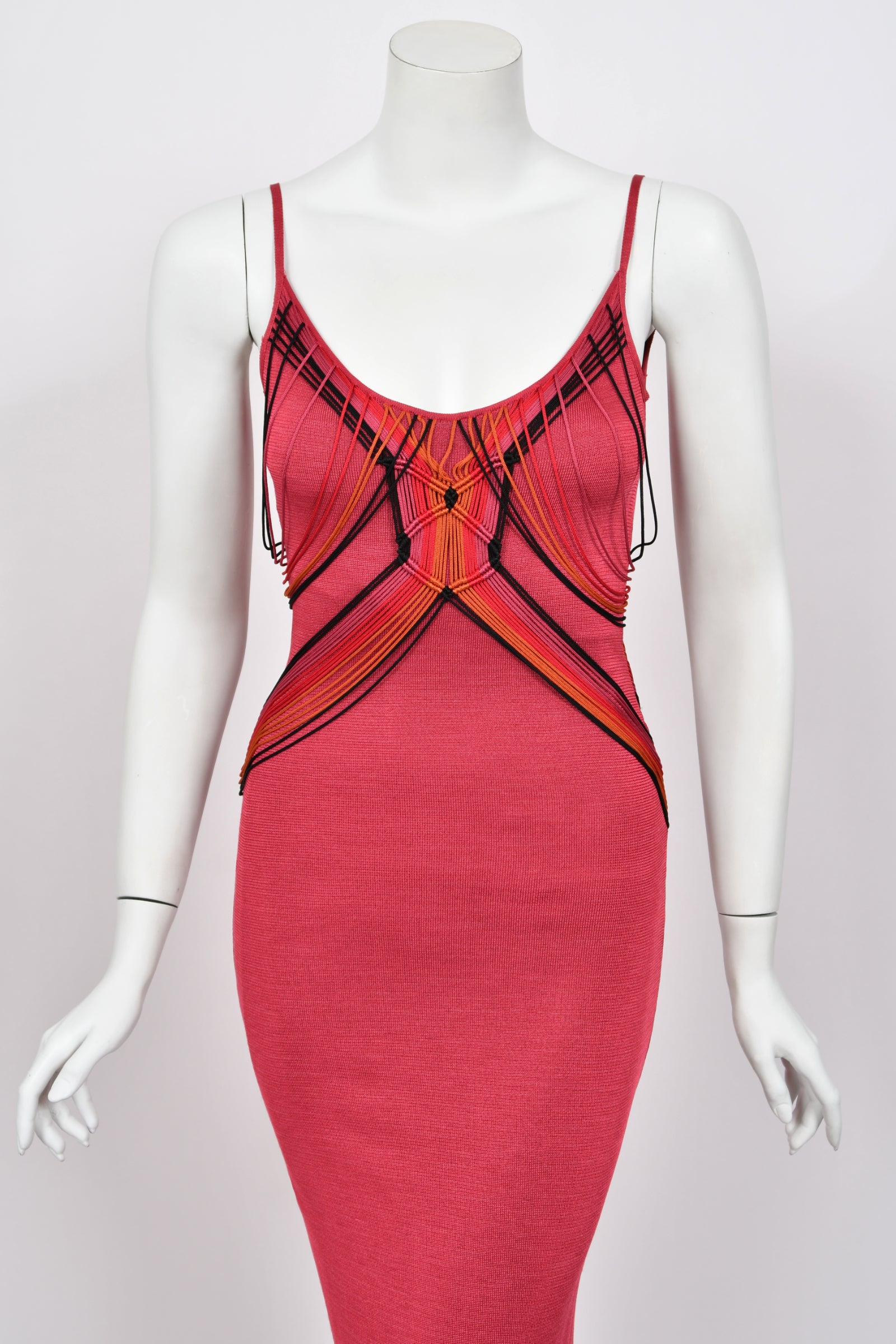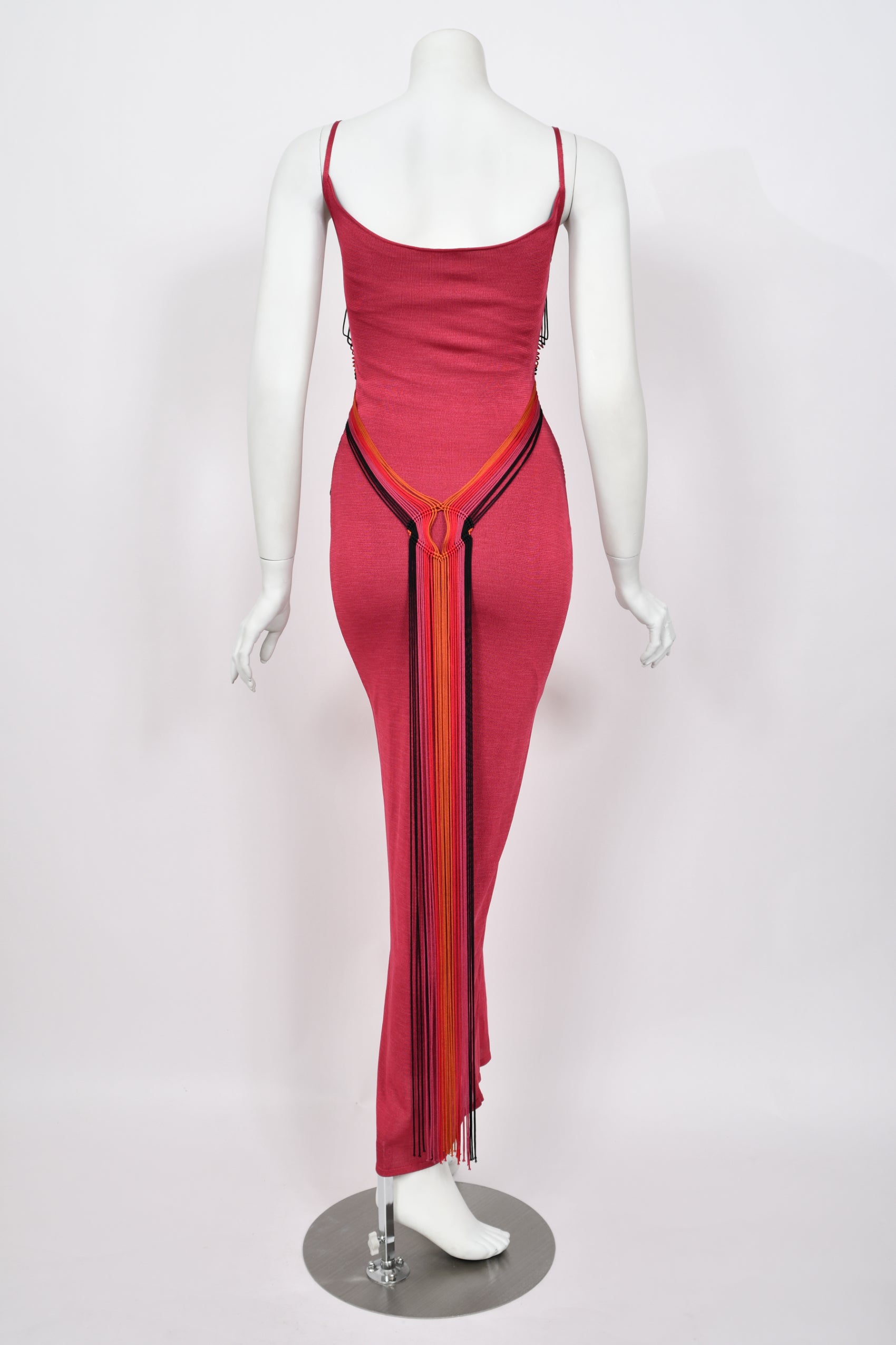 This incredibly special and ultra seductive Christian Dior burgundy red stretch-knit hourglass maxi slip dress dates back to John Galliano's spring/summer 2003 collection. During his tenure at the house of Dior, John Galliano transformed the brand with his signature blend of historical romanticism and high-fashion theatricality. Revered for his fearless approach to construction and narrative design, Galliano’s Dior era is now considered one of the most influential and collectible periods in modern fashion history. We were thrilled to learn that this slip dress is a rare French prototype for this collection. Crafted from a luxurious burgundy silk-blend knit with a flattering, figure-skimming stretch, the color is both moody and vibrant, shifting subtly between deep rose and wine tones depending on the light. The silhouette is long and lean, with delicate spaghetti straps and a softly scooped neckline that frames the bust with effortless sensuality. The most alluring feature is the incredible multicolor string work—a unique Galliano touch that elevates this from a simple slip dress to a technical masterpiece. Dozens of fine silk fringe cords in shades of orange, red, fuchsia, and black are draped across the bodice in an intricate geometric configuration, creating the illusion of a woven cage overlaying the knit base. These cords gather, knot, and intersect with sculptural tension, contouring the torso and drawing the eye inward for a striking hourglass effect. At the hips, the strings converge into a beautifully worked knot that releases into long cascading tendrils. And then comes the most dramatic surprise: turning around reveals that the strings continue onto the back and fall freely towards the floor, creating a trailing fringe that moves with weightless fluidity. We also styled the back tassel design in front and the effect is magnificent. A Galliano-era Dior prototype is an exceptionally rare acquisition, especially one as technically complex and visually mesmerizing as this. For collectors, it represents the purest form of Galliano’s artistry. For the wearer, this is that epic, archival Christian Dior destined for a high glamour moment.