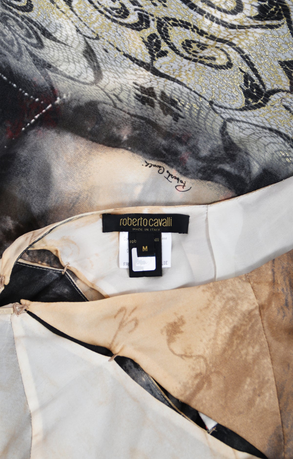 This alluring gown, with its picturesque whimsical print and seductive silhouette, is the epitome of Cavalli’s legacy. The fabric is a luxurious, semi-sheer light weight silk that flows effortlessly, giving the gown an ethereal quality that hugs the body while maintaining gracility. I especially love the beautiful printed metallic lamè towards the bottom of the dress; like you are walking through sparkling gold. Vogue noted that this Cavalli collection “evoked Pompeian tiled courtyards,” and our gown embodies that spirit, with a print based on Sir Lawrence Alma Tadema’s 'Unconscious Rivals'. This painting of two women leaning toward one another, sharing a heart, imbues the gown with a sense of timeless femininity and romance. The ultra chic bodice of the gown is another work of art, featuring a plunging décolleté framed by diamond shaped cut-outs that run from the bust to the waist. The skirting of the gown is equally mesmerizing, with side slits that reveal both legs in such a flattering way. The fabric flows to the floor, cascading into a dramatic train that creates a bold visual effect as the gown glides over the body. This Roberto Cavalli gown is perfect for someone who seeks to make a statement—whether it’s for a high-profile gala, or any event where all eyes will be on you. Its blend of sensuality, sophistication, and Cavalli’s signature flair for sex appeal makes it a must-have for any lover of archival fashion.