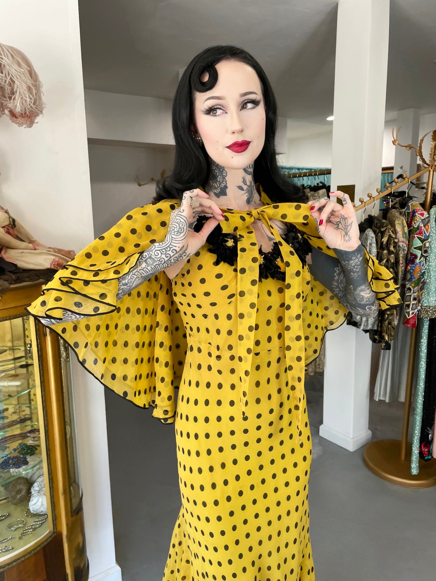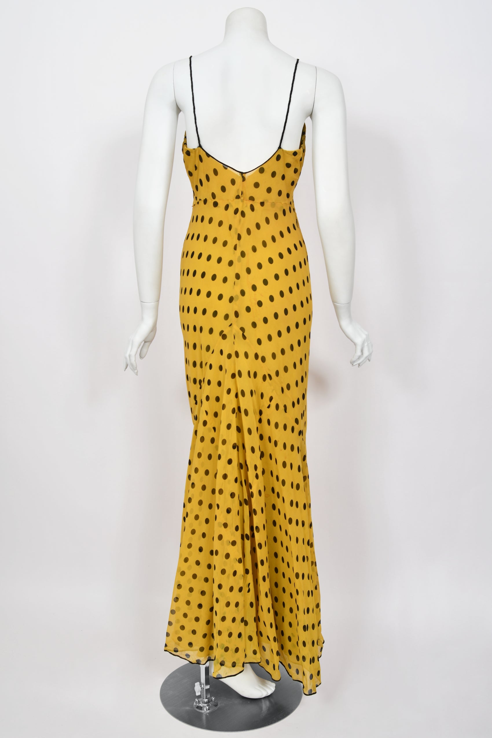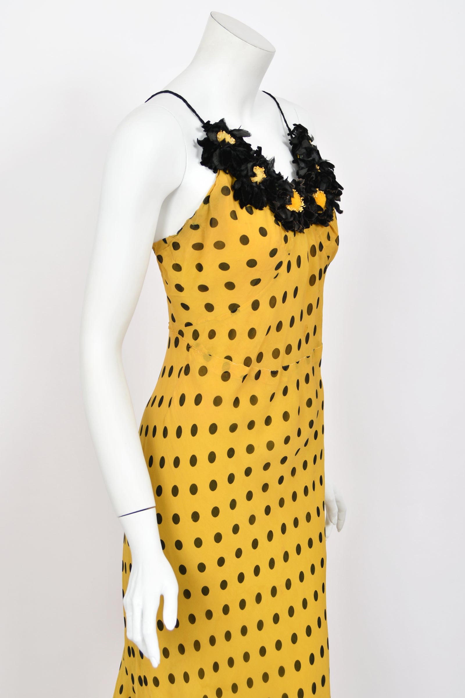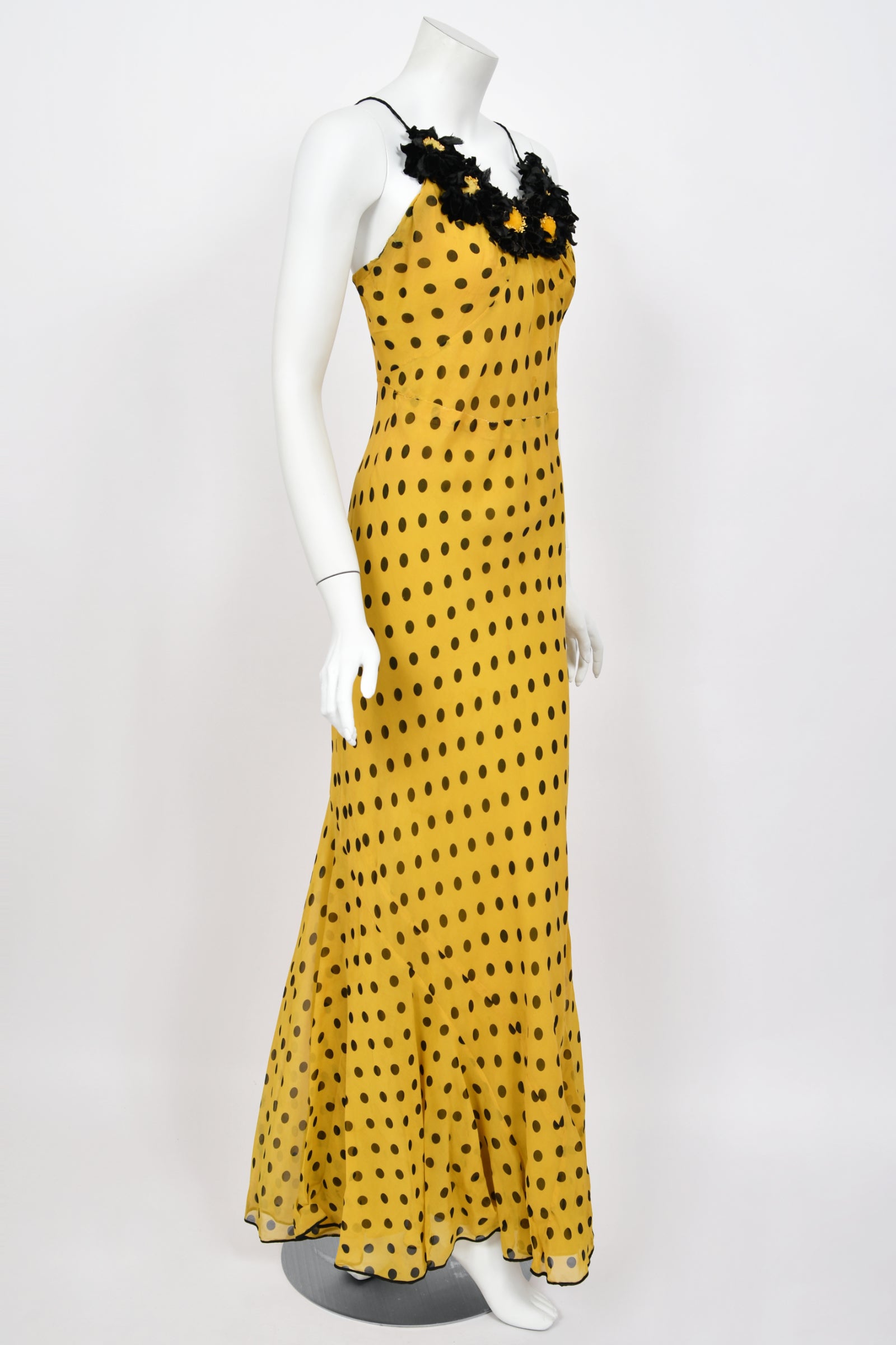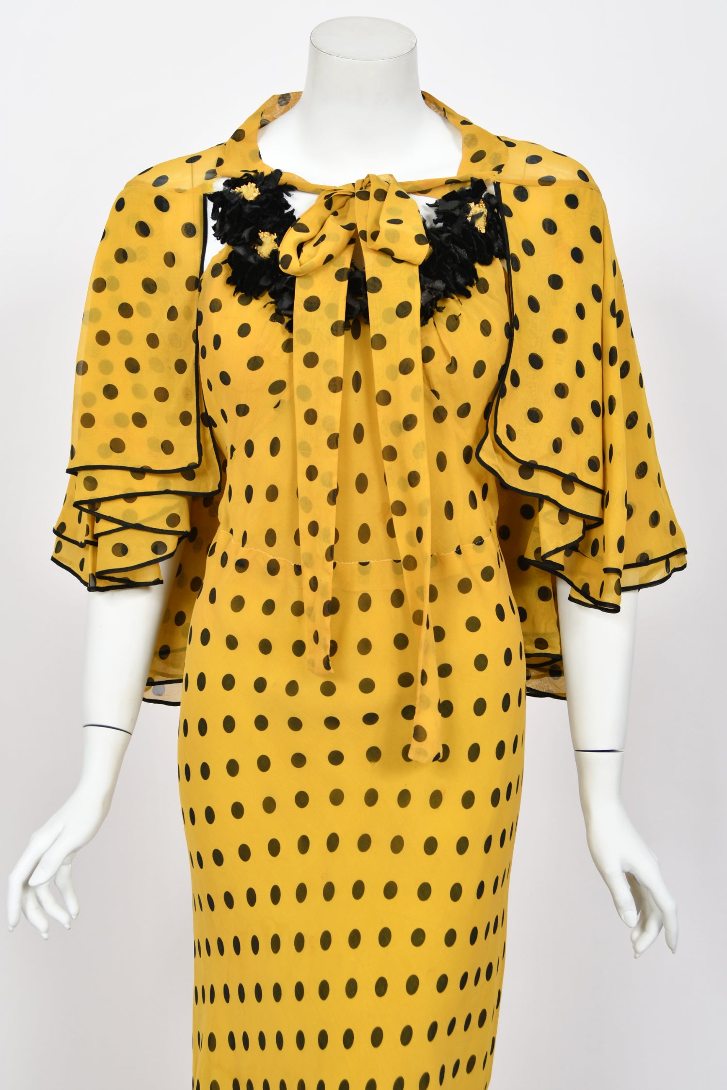 An absolutely breathtaking and ultra rare Germaine Monteil couture polka dot bias-cut gown ensemble dating back to the mid 1930's. Germaine Monteil is remembered most for her cosmetics empire, but she was first a well-known fashion designer. Born in France, she moved to America in the early 1930's and opened her own house at 663 Fifth Avenue in New York. In recognition of her vast influence upon the fashion industry, Monteil received a Neiman Marcus Fashion Award in 1938. This incredible black and yellow polka-dot silk gown with matching capelet is a masterclass in craftsmanship. The chic thin-strap bodice has the most incredible floral appliqués along the bodice in the same hue. This detail adds such depth and texture to the delicate fabric. The matching romantic tiered capelet elevates the look with additional layers gracefully falling over the bust, lending an air of allure. The bias-cut design of this exquisite gown drapes the body in a flattering silhouette, emphasizing the curves while allowing for graceful movement. Definitely a type of garment that would have influenced John Galliano while he was working at Christian Dior. It is amazing that a gown with this amount of presence can literally feel almost weightless but it does. An iconic example of high-end 'Old Hollywood' glamour from this very special era.