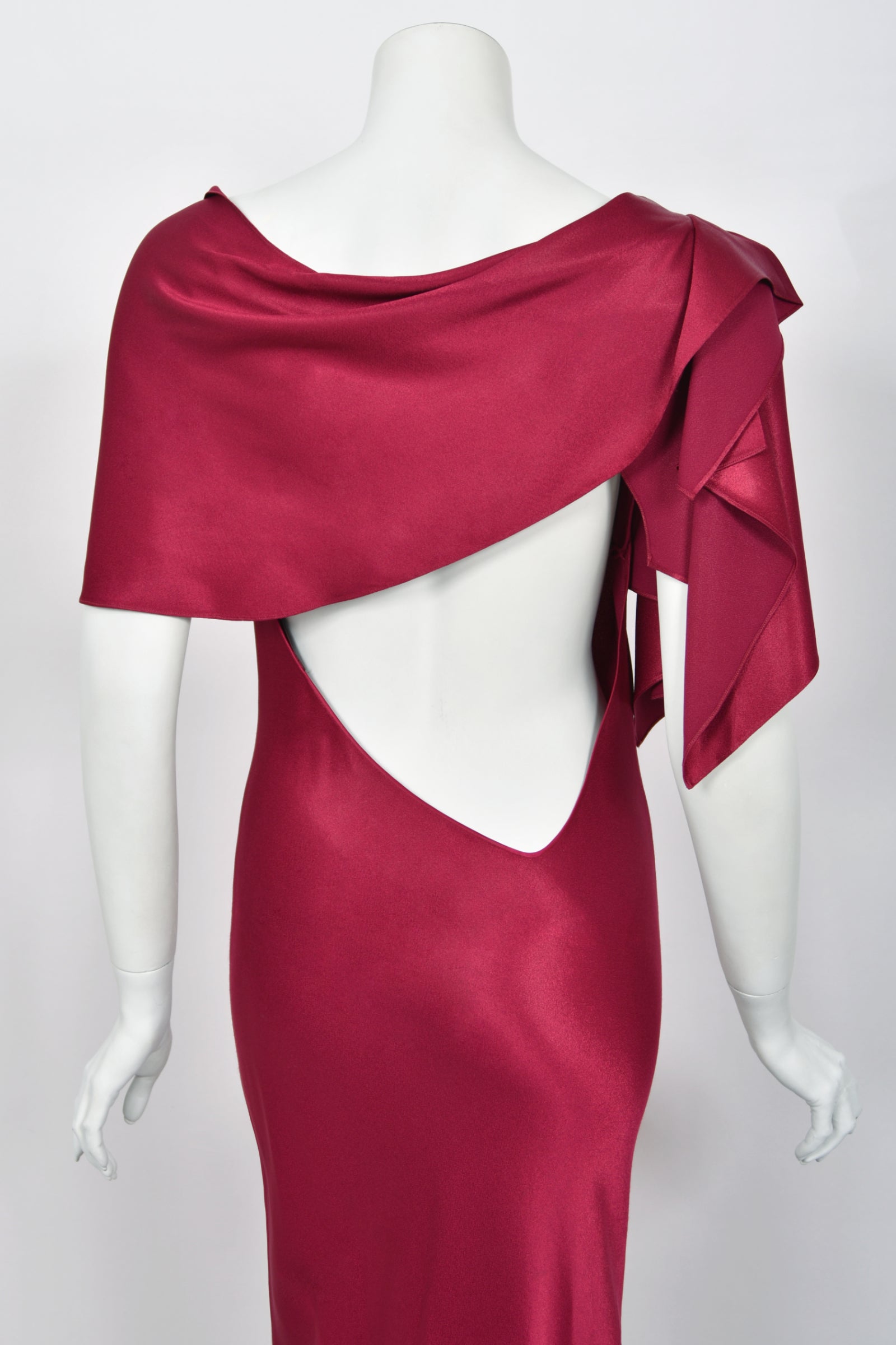 This highly coveted and absolutely breathtaking John Galliano wine-red silky asymmetric bias-cut full length gown perfectly captures the intoxicating drama from his 1999 fall/winter Maori collection. At this moment in his career, Galliano’s own label mirrored the theatricality and razor-sharp techniques he simultaneously brought to Dior; two parallel worlds feeding a singular vision. His work continues to be influential today, leaving an unmistakable imprint on the evolution of modern high fashion. This epic gown appeared as runway look 51, modeled by Inez Ribeiro, and embodies the collection’s tension between seduction and strength.