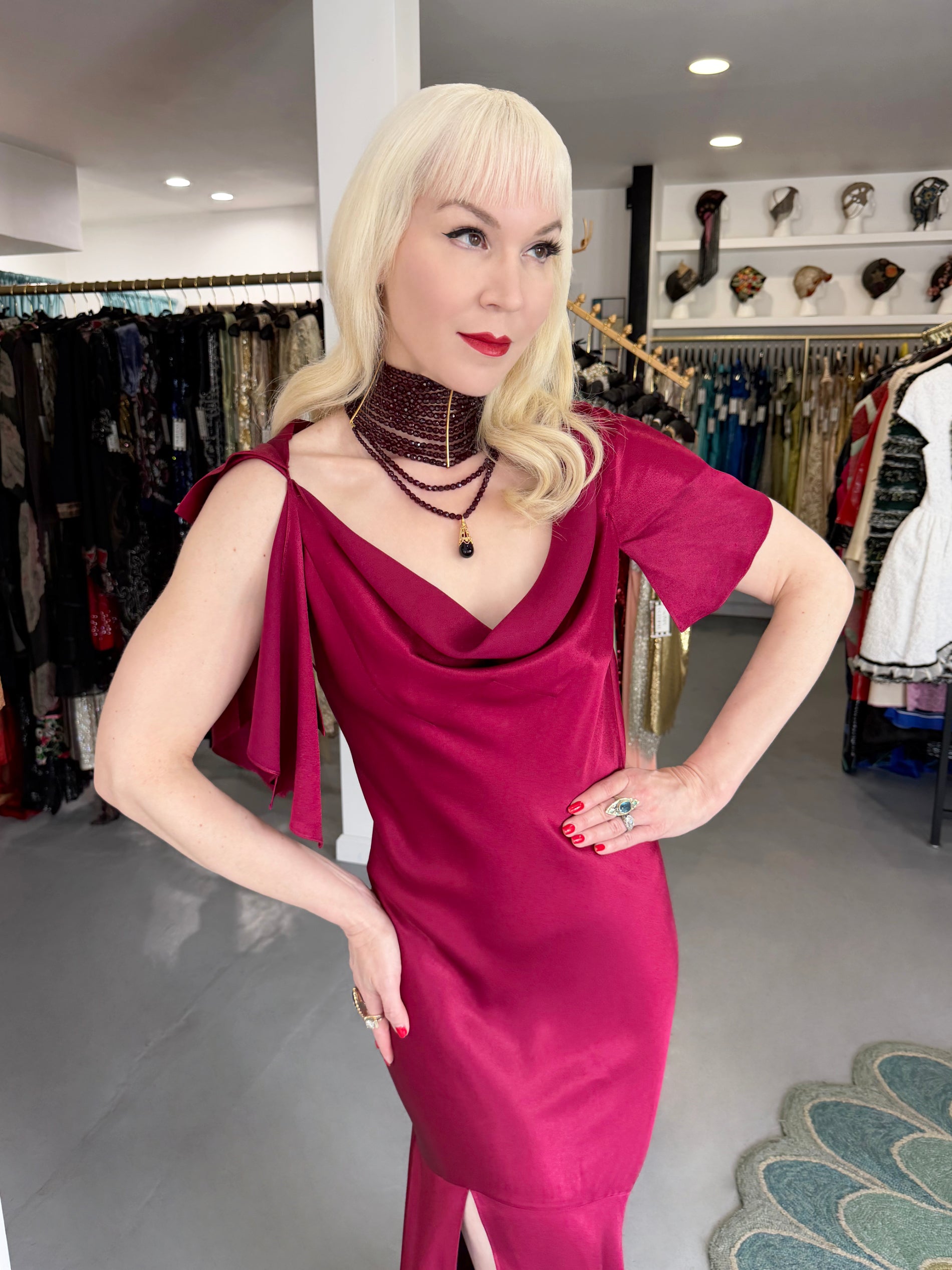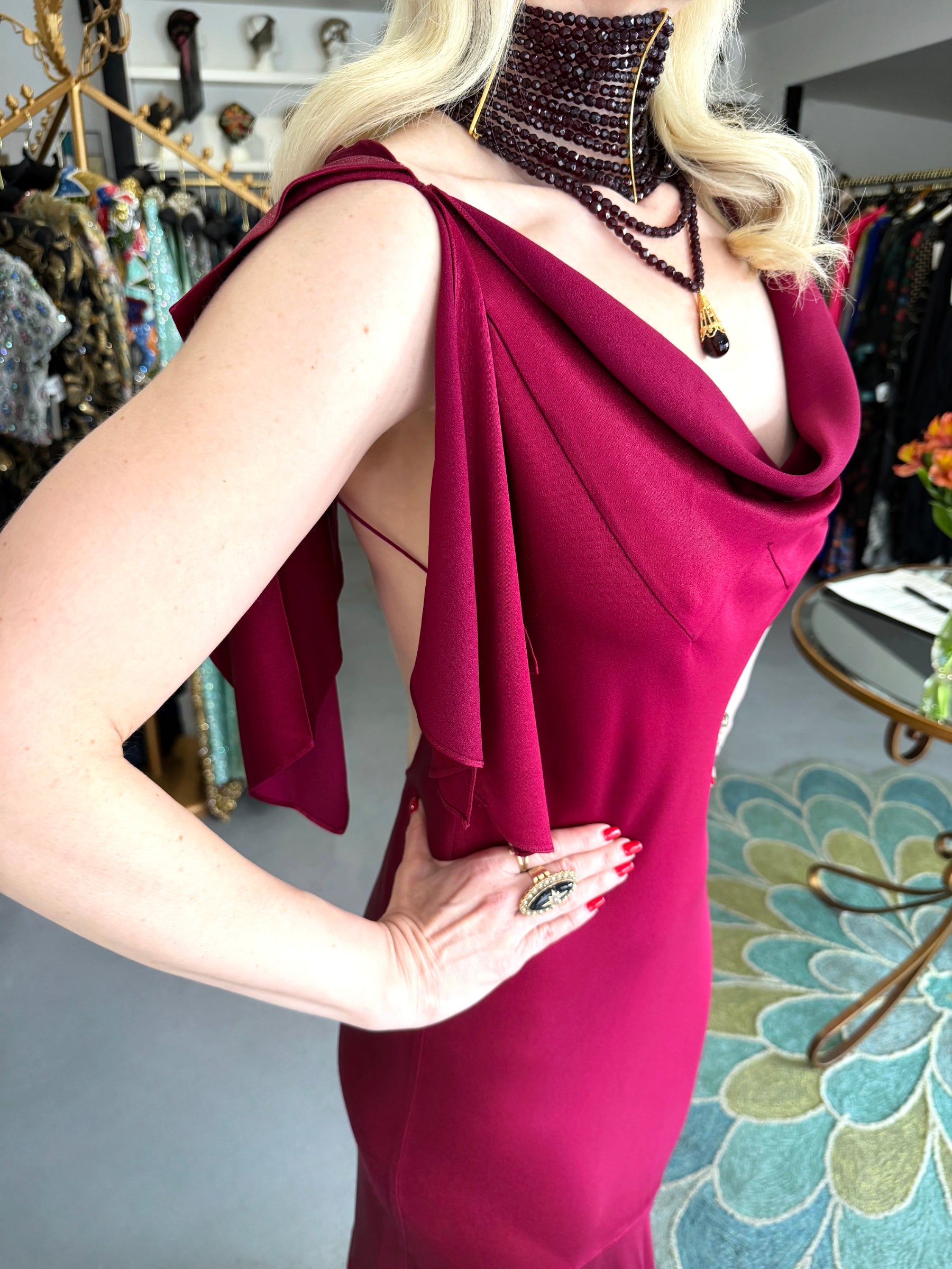 Designed to skim the body in a figure flattering bias-cut, the rich red color deepens in tone with movement and light as it pools into a floor-length sweep. The bodice is shaped through controlled draping, with the fabric drawn and folded to form a neckline that is fluid in design. Two contrasting shoulder treatments give the dress its quiet complexity: one side formed by a whisper-thin strap with two delicate swathes of silk on either side of the shoulder, the other finished with a draped sleeve that frames the upper body. Clever construction keeps everything perfectly in place—the shoulder straps are discreetly joined by a hidden slim band across the upper back. A seductive front slit introduces the right amount of allure, revealing just enough leg as you walk. The drama continues as you turn around with an asymmetrically cut open back, ensuring the gown is compelling from every angle. Galliano dresses from this era have become increasingly difficult to find. This is the kind of gown you choose when the moment matters—perfect for a red-carpet appearance or formal evening where presence is everything. When you wear it, you’re not simply wearing a beautiful dress; you’re stepping into one of Galliano’s most celebrated creative chapters.