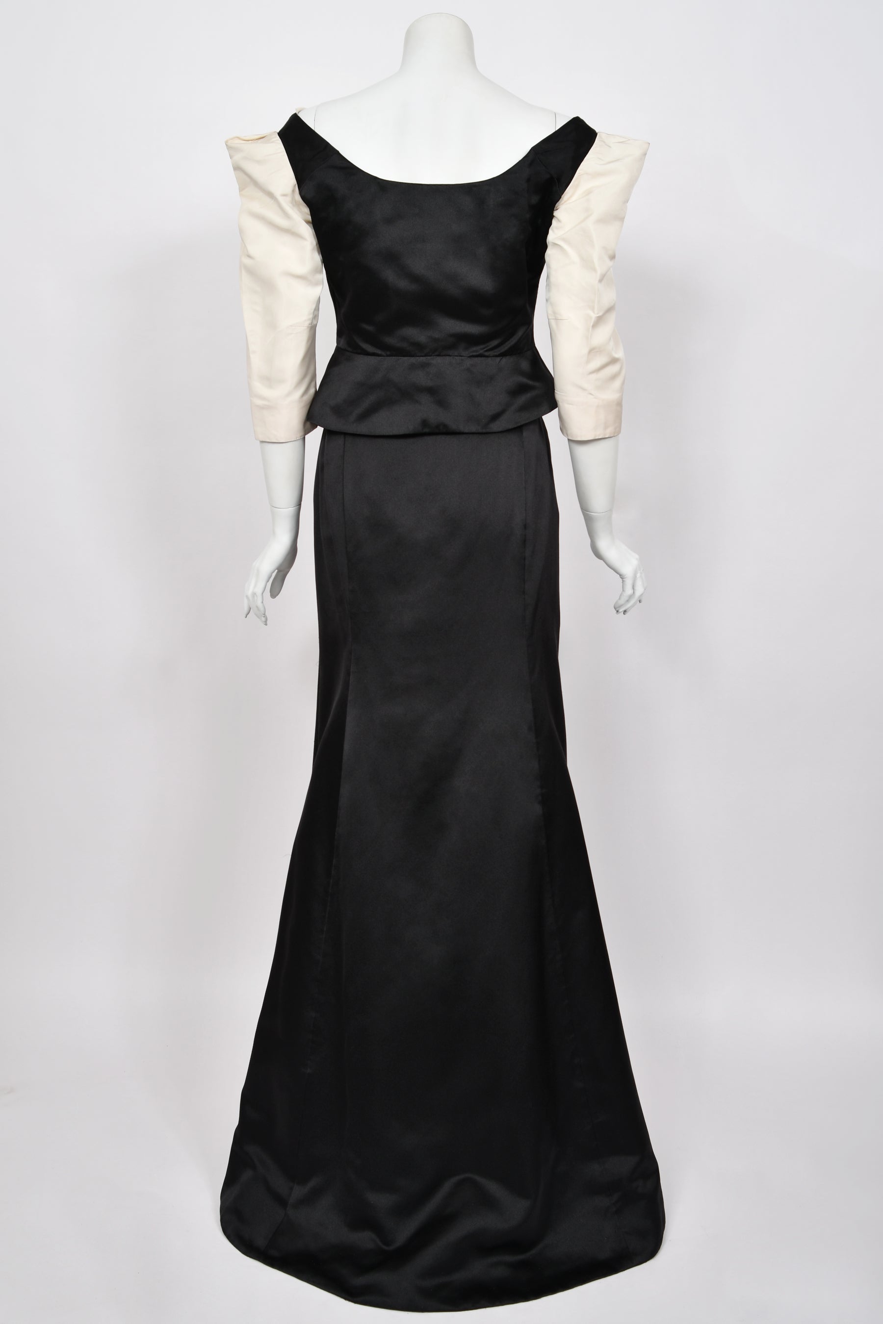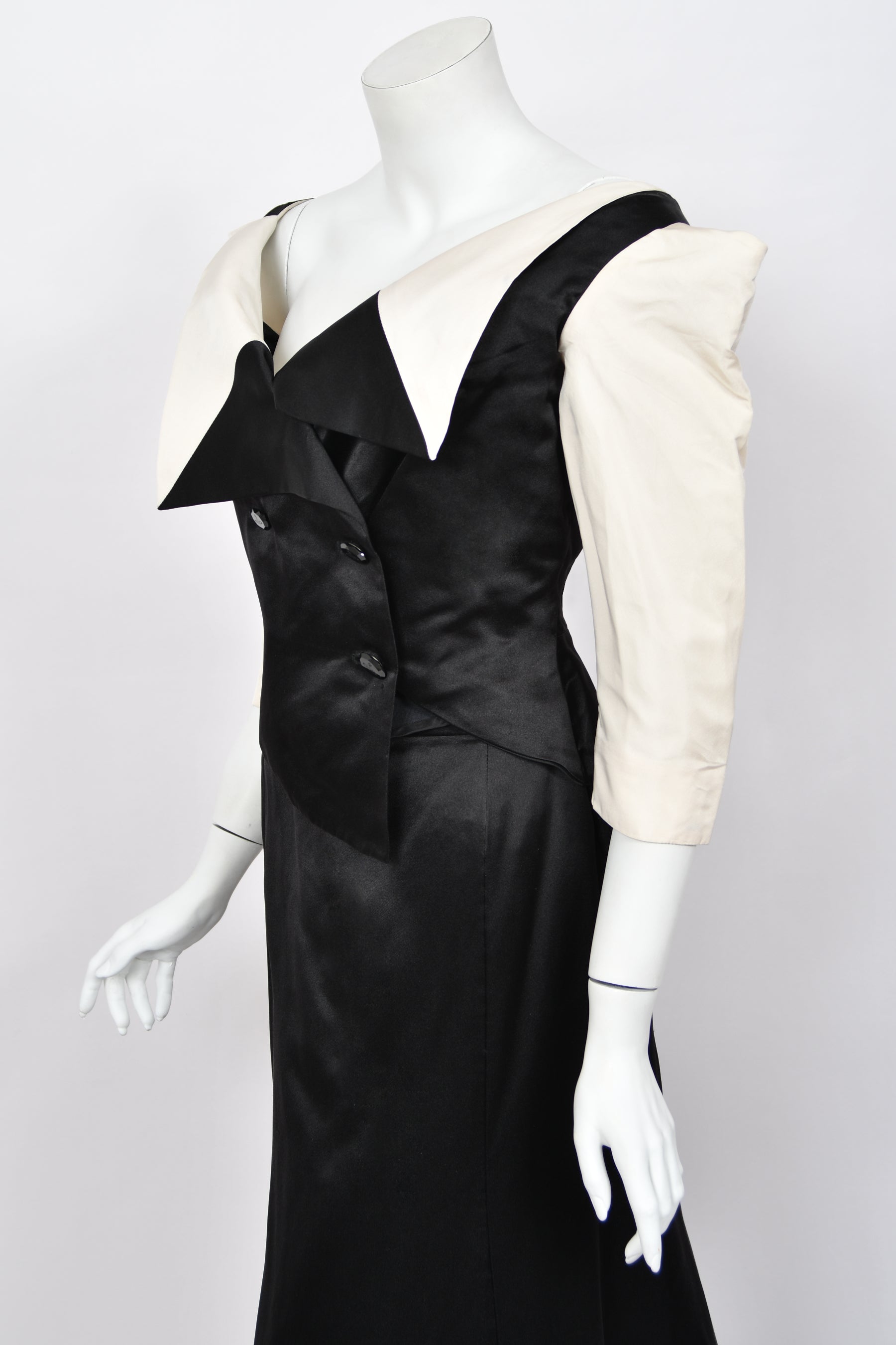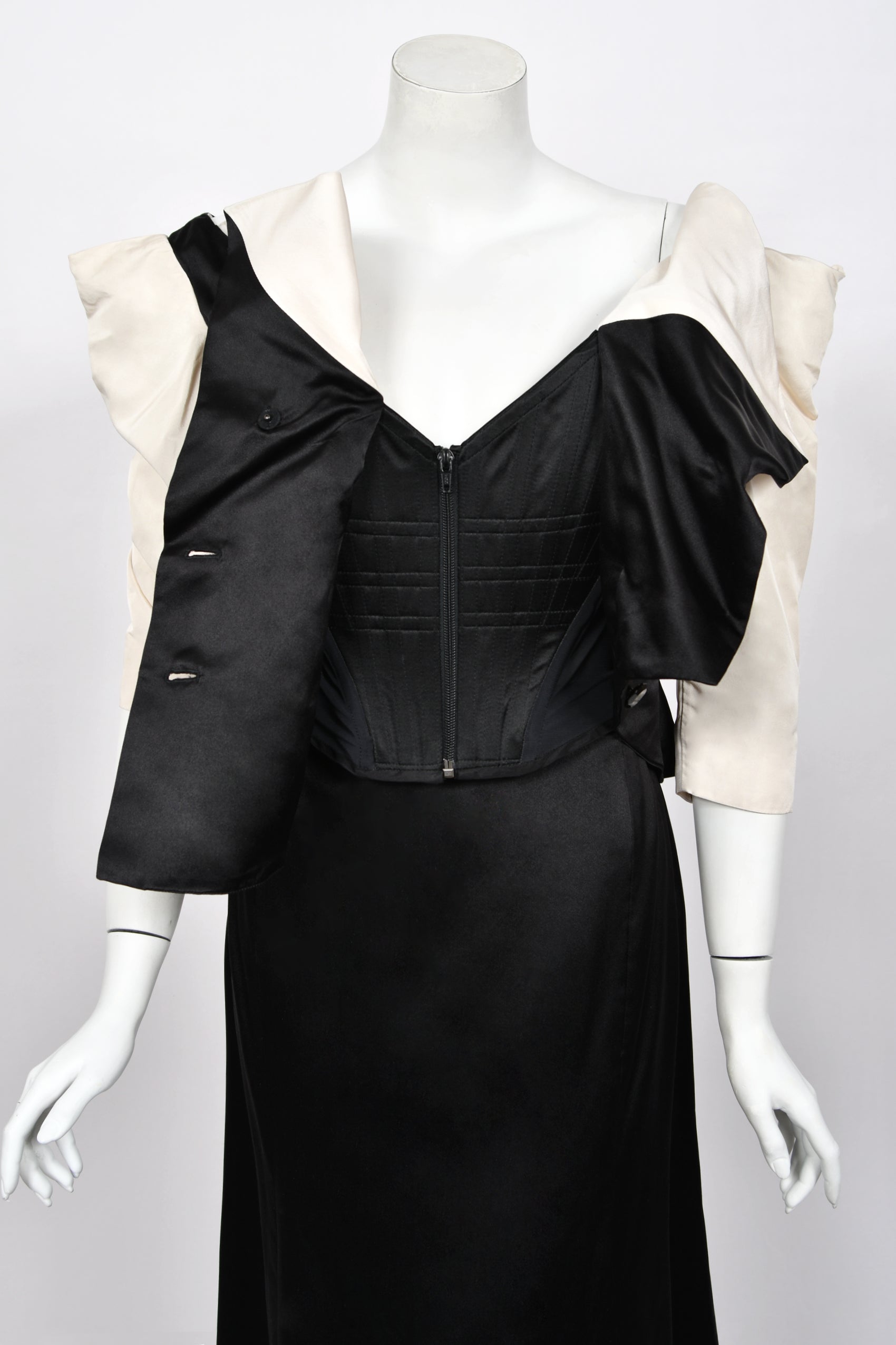 This regal design was Look 78, modeled on the runway by Alek Wek, who wore the same sculptural corset top styled with a different skirt in a similar elongated cut. The silhouette is statuesque and deliberate. The black mid-weight silk skirt falls in a fluid line from the waist to the floor, skimming the hips before releasing into a slight back train. Its length creates a columnar effect that elongates the body, allowing you to glide across the floor with each step. Yet it is truly all about the corset blouse! The avant-garde block coloring immediately draws the eye; bold ivory silk panels frame the neckline in sharp contrast against the inky black base. The sculpted off-shoulders, which highlights the decolletage, mixed with softly puffed sleeves nod to historical dress while remaining unmistakably Westwood. Angled front closures are finished with her signature logo buttons. Beneath the exterior lies a fully boned interior corset, complete with structured seaming and a central zipper that precisely cinches the waist. Worn together, the ensemble delivers runway presence for that polished evening look. Styled separately, the corset blouse becomes a statement piece you can pair with tailored trousers or denim. This is a rare opportunity to own an iconic design from one of Britain's most radical minds in fashion.