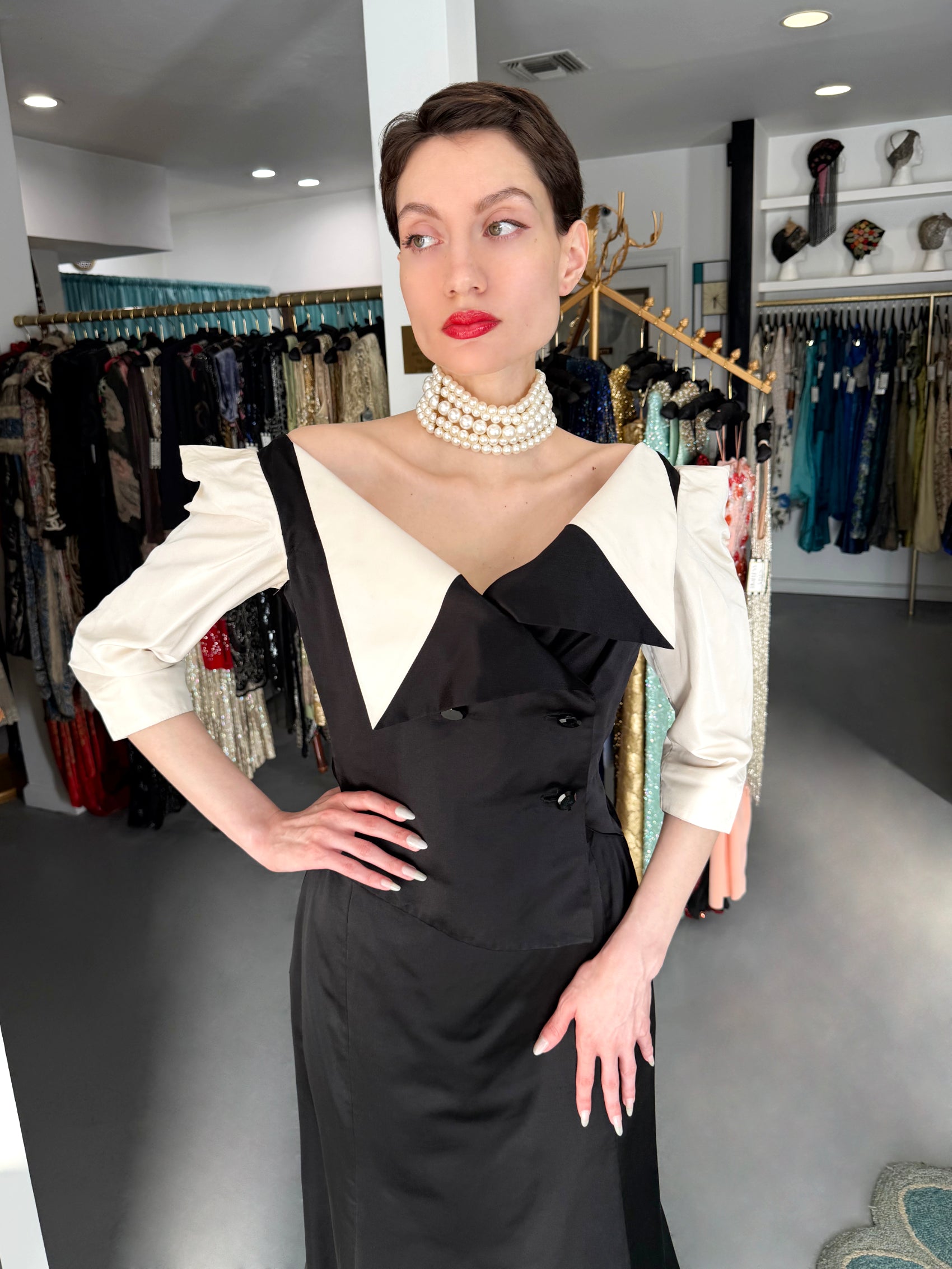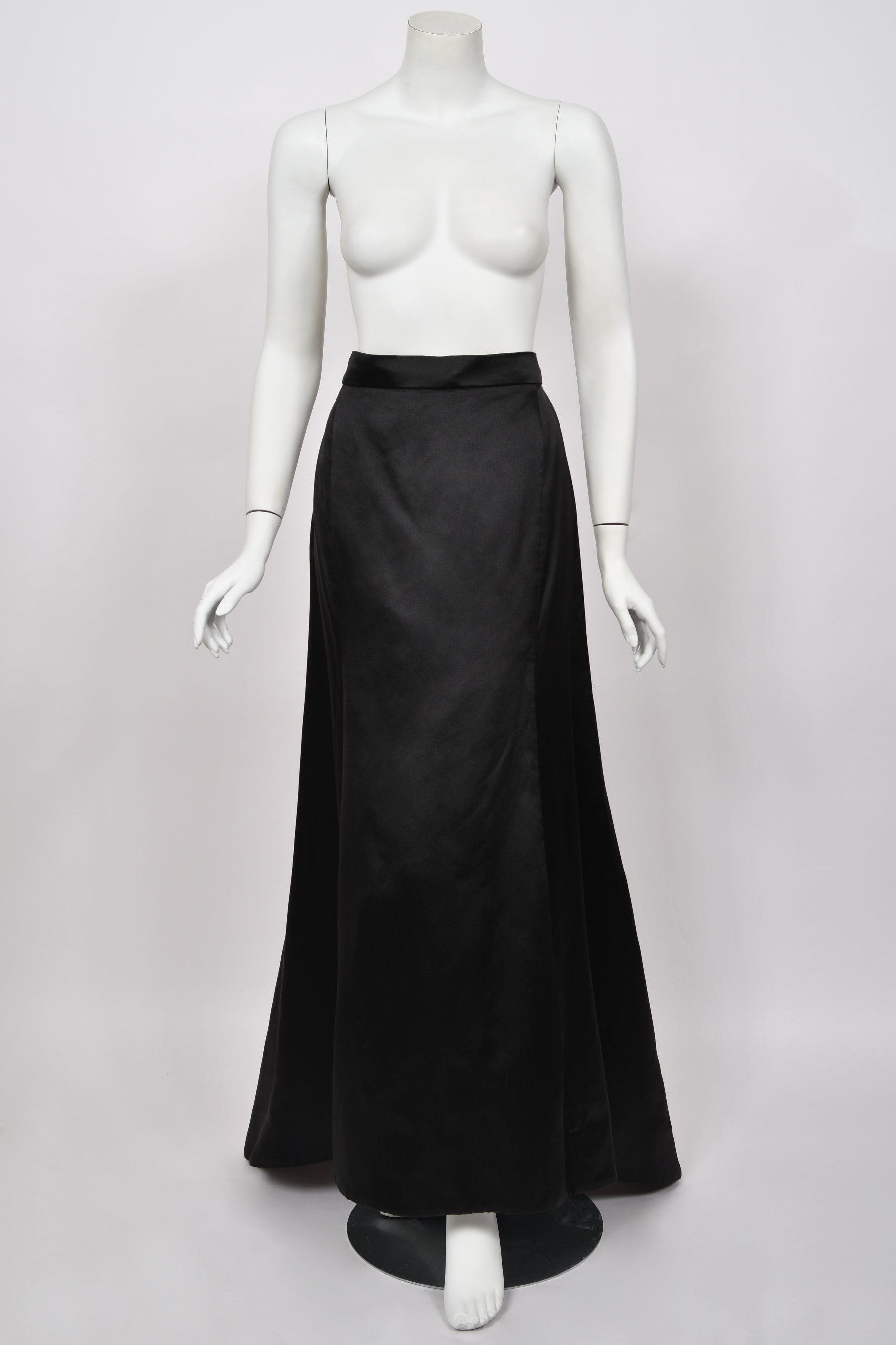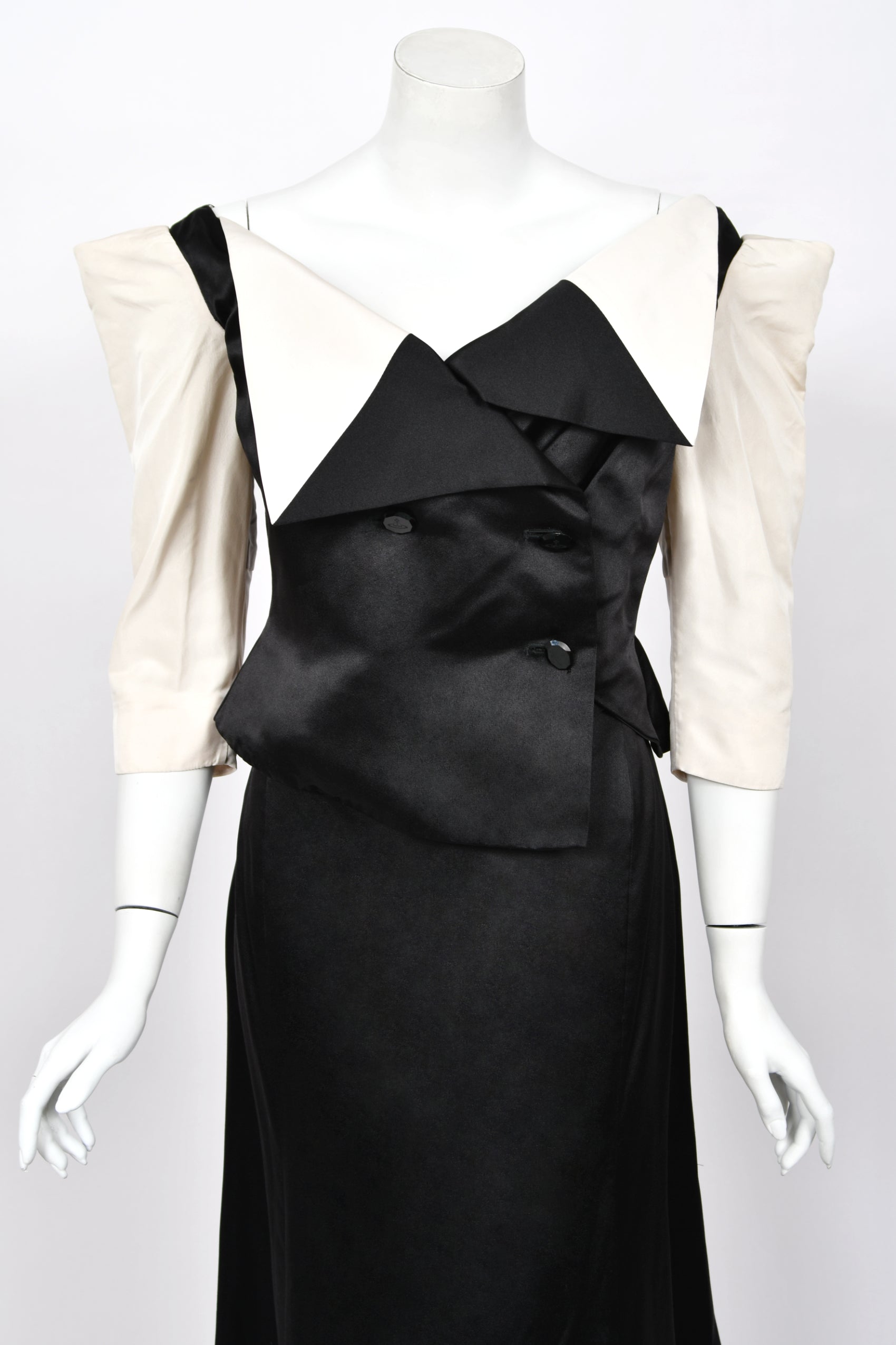 This regal design was Look 78, modeled on the runway by Alek Wek, who wore the same sculptural corset top styled with a different skirt in a similar elongated cut. The silhouette is statuesque and deliberate. The black mid-weight silk skirt falls in a fluid line from the waist to the floor, skimming the hips before releasing into a slight back train. Its length creates a columnar effect that elongates the body, allowing you to glide across the floor with each step. Yet it is truly all about the corset blouse! The avant-garde block coloring immediately draws the eye; bold ivory silk panels frame the neckline in sharp contrast against the inky black base. The sculpted off-shoulders, which highlights the decolletage, mixed with softly puffed sleeves nod to historical dress while remaining unmistakably Westwood. Angled front closures are finished with her signature logo buttons. Beneath the exterior lies a fully boned interior corset, complete with structured seaming and a central zipper that precisely cinches the waist. Worn together, the ensemble delivers runway presence for that polished evening look. Styled separately, the corset blouse becomes a statement piece you can pair with tailored trousers or denim. This is a rare opportunity to own an iconic design from one of Britain's most radical minds in fashion.
