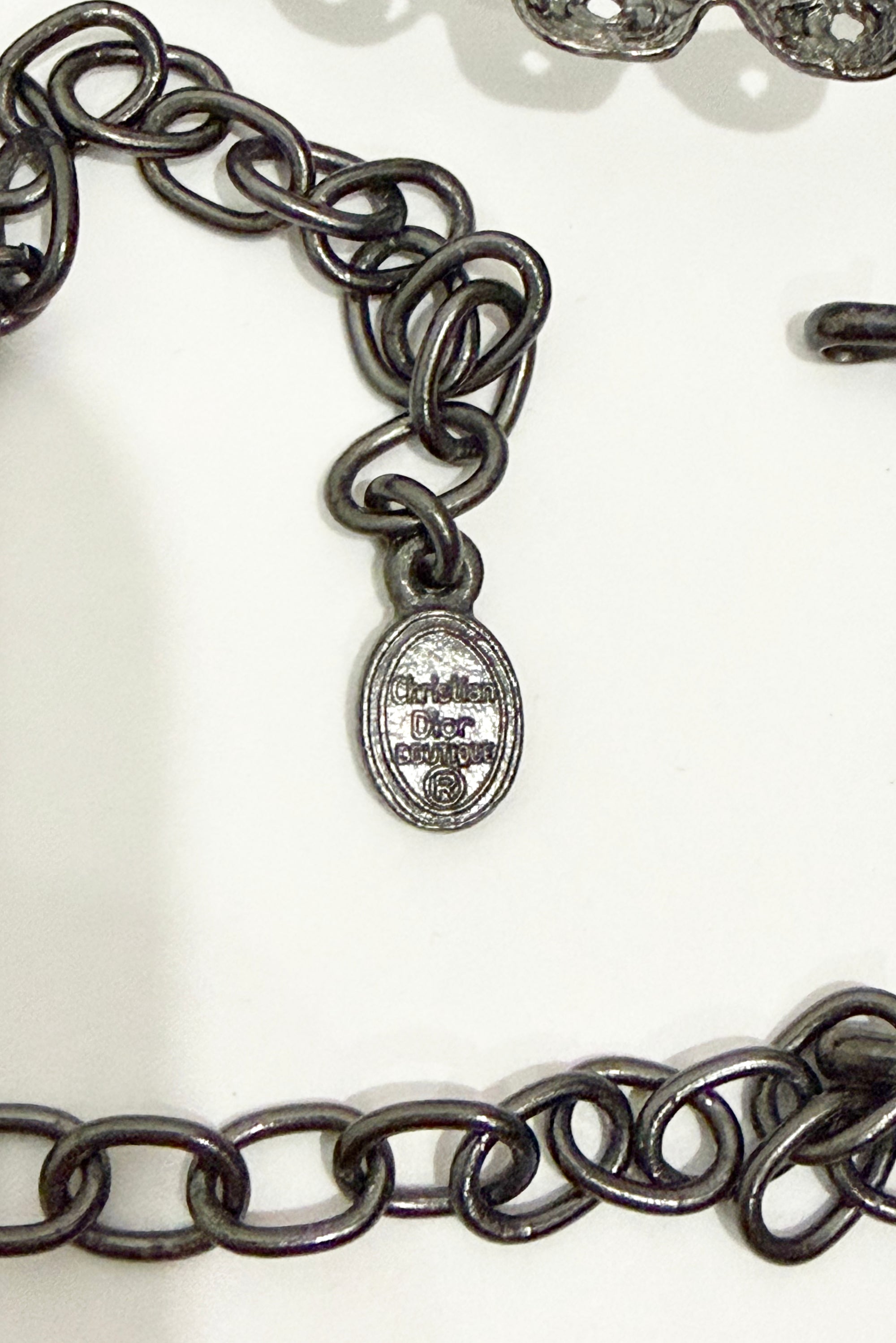 This striking and incredibly special Christian Dior by John Galliano silver Belle Époque–inspired crescent motif oversized statement choker dates back to his 2000 fall/winter collection. During Galliano’s tenure at Dior, his theatrical imagination revived the house with decadent couture and romantic historical references. This Belle Époque–inspired piece features antique-style filigree adorned with luminous black crystals, delicate tear-drop accents, and fine chain strands draped elegantly around the neck. Two prominent crescent pendants sit at center front — one resting at the base of the throat and the second falling beautifully over the décolletage. An iconic accessory for any fashion collector. Whether wearing a chic evening gown or a simple white tank top, this is definitely the kind of Dior necklace that takes center stage.