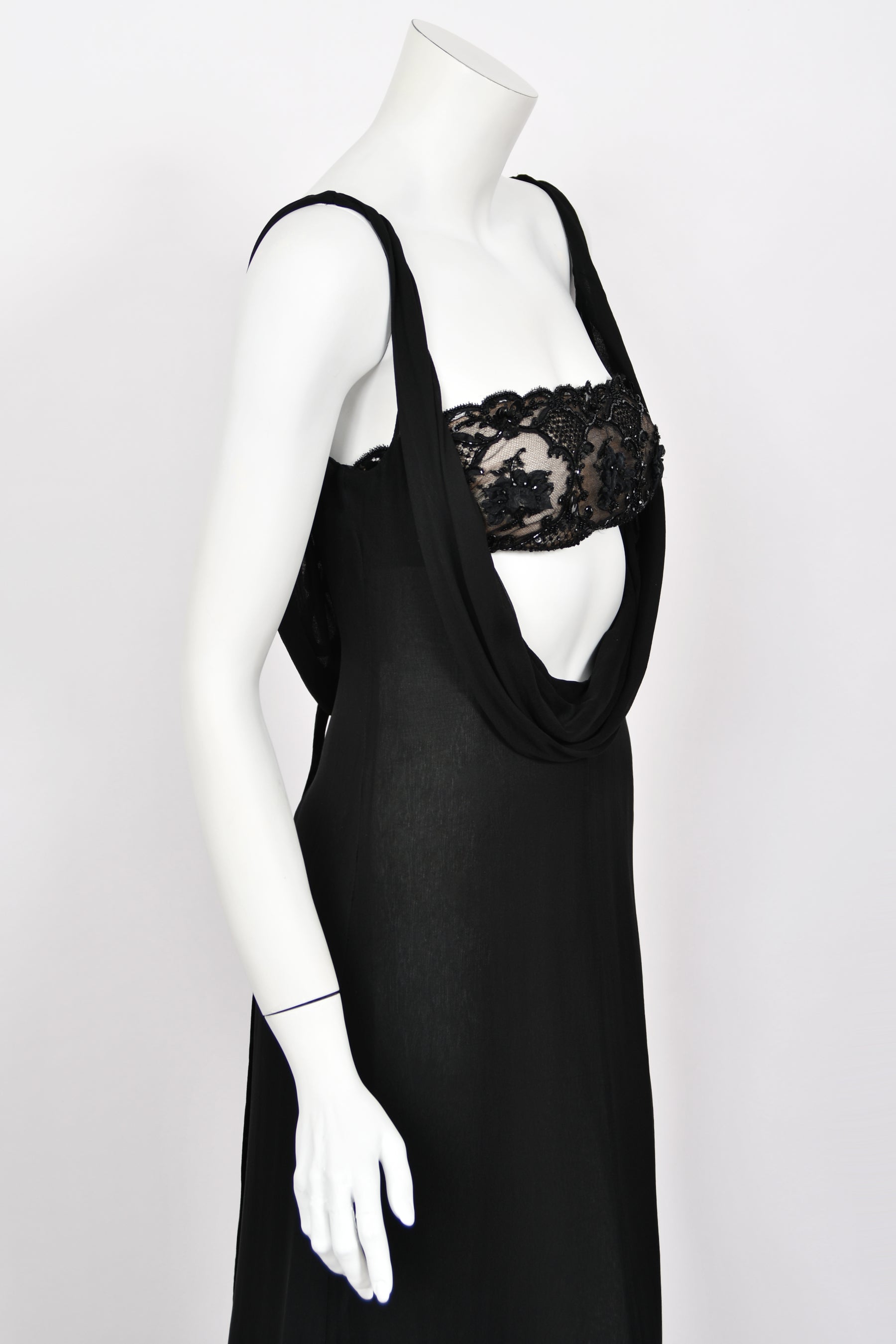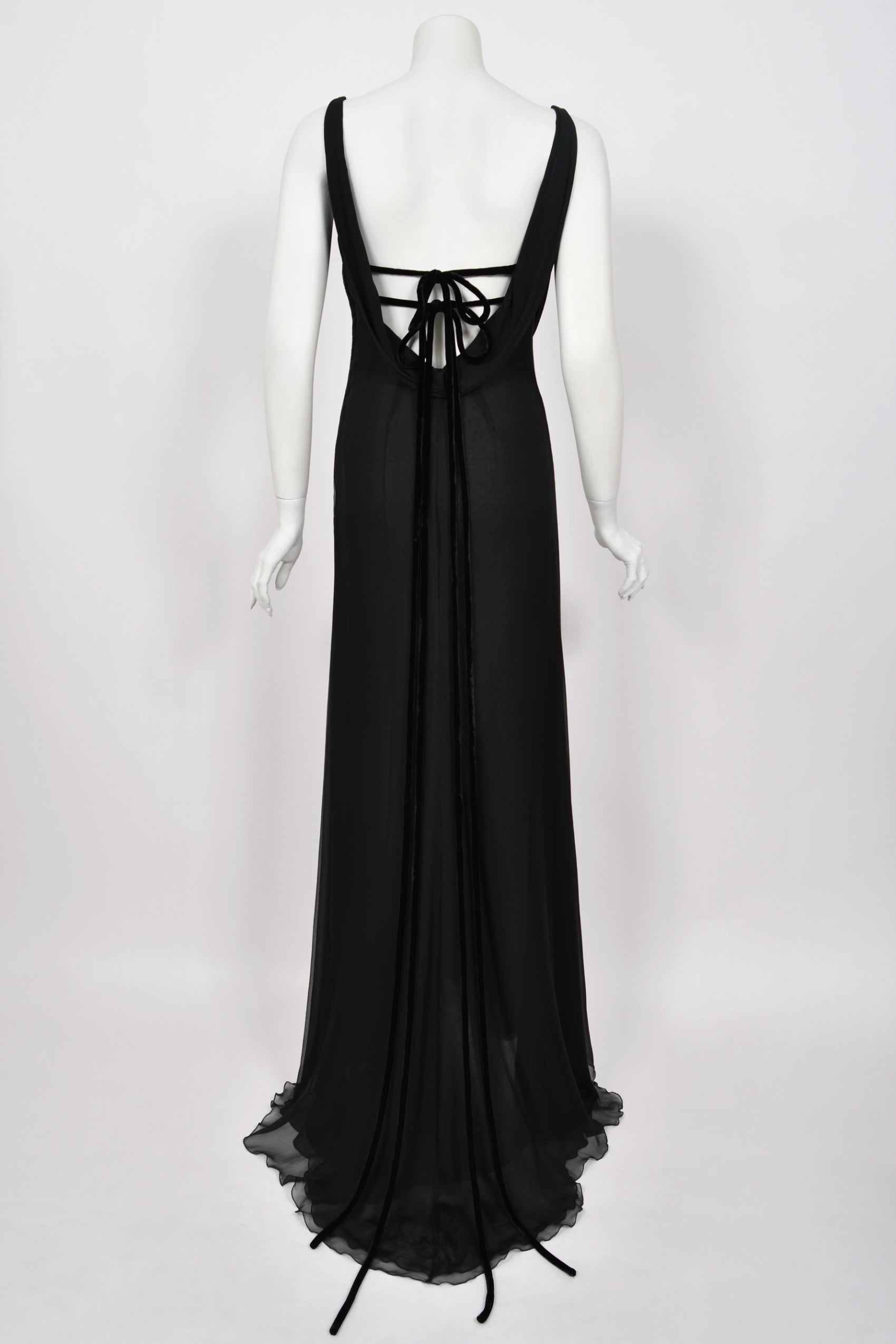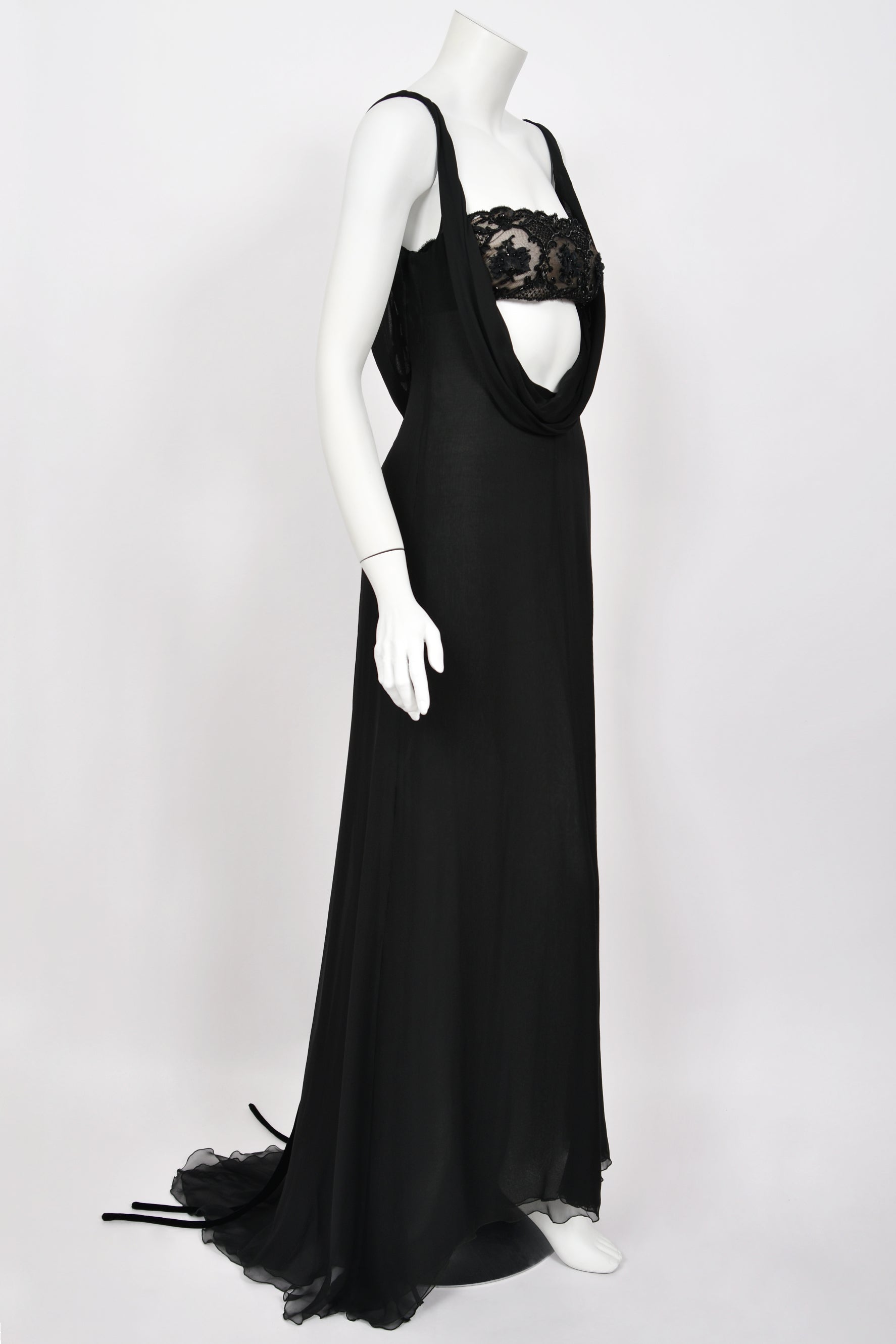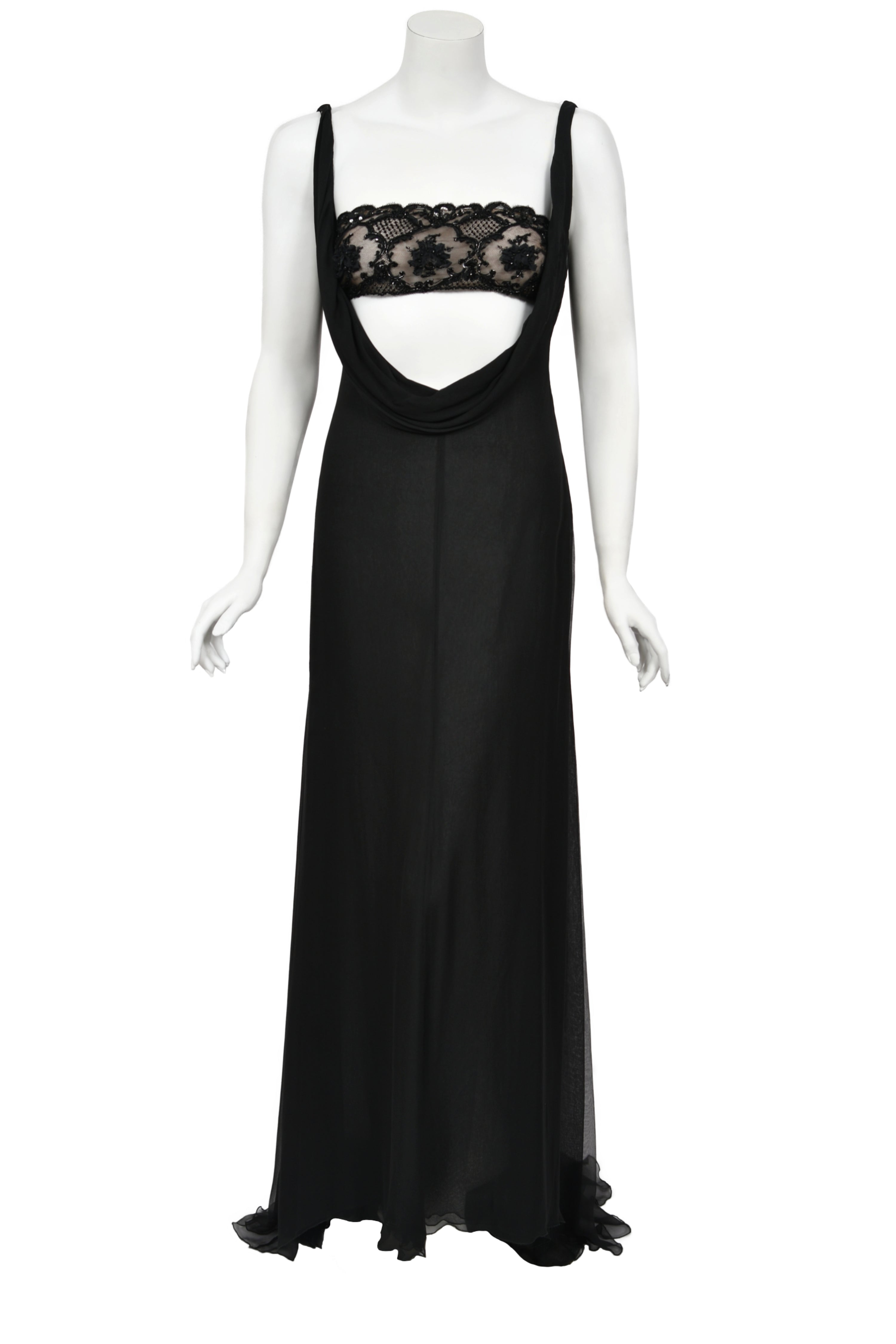 This gown, runway look 60, was worn by Italian model Mariacarla Boscono and styled with a lace mask that set the tone for the collection’s dark, seductive mood. The design features a slightly sheer, black silk that glides effortlessly over the figure. The gown reveals a daring open scooped bodice which showcases the dress's most prominent and sexy feature—an intricately beaded black lace bralette adorned with jet sequins and floral embroidery. Cleverly constructed, the bralette is anchored on the left side, wrapping across the bust and fastening in the back with two luxurious velvet ties that trail down the spine. The front is equally balanced out with a plunging open back, flowing into a graceful floor-length hem and subtle train that moves beautifully with every step. A masterclass in construction, this archival Valentino gown captures the designer’s signature blend of sensuality and sophistication.