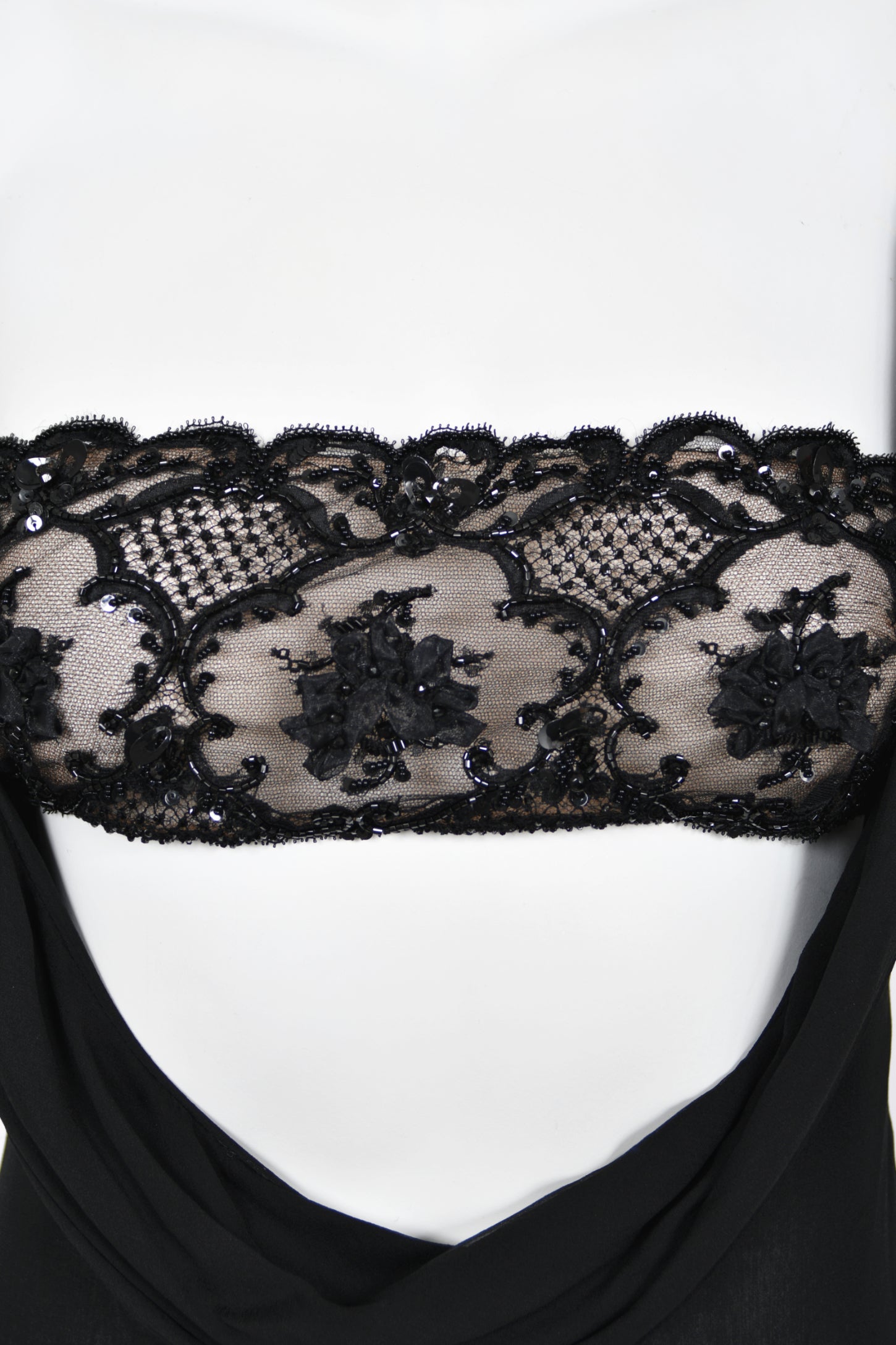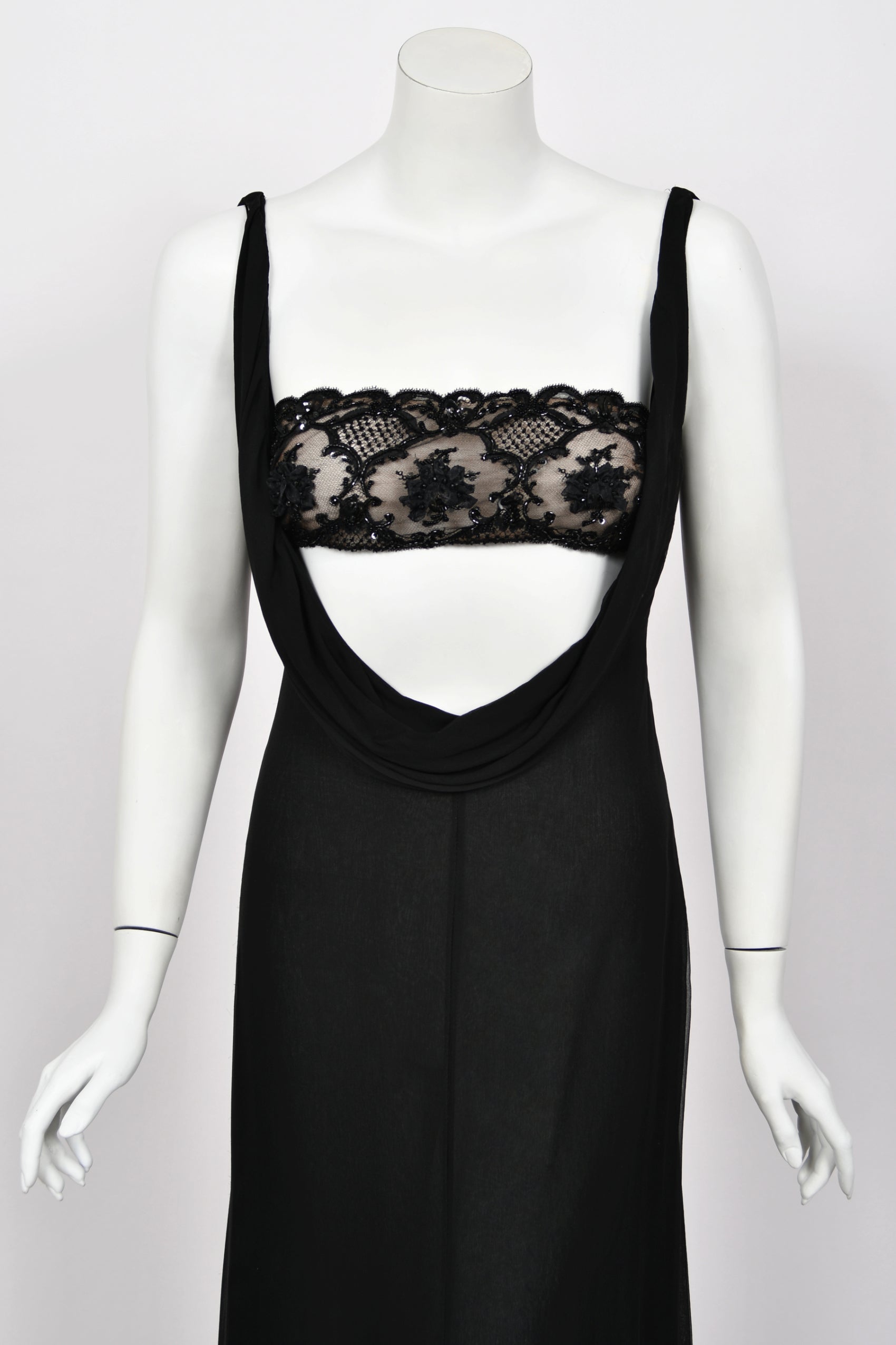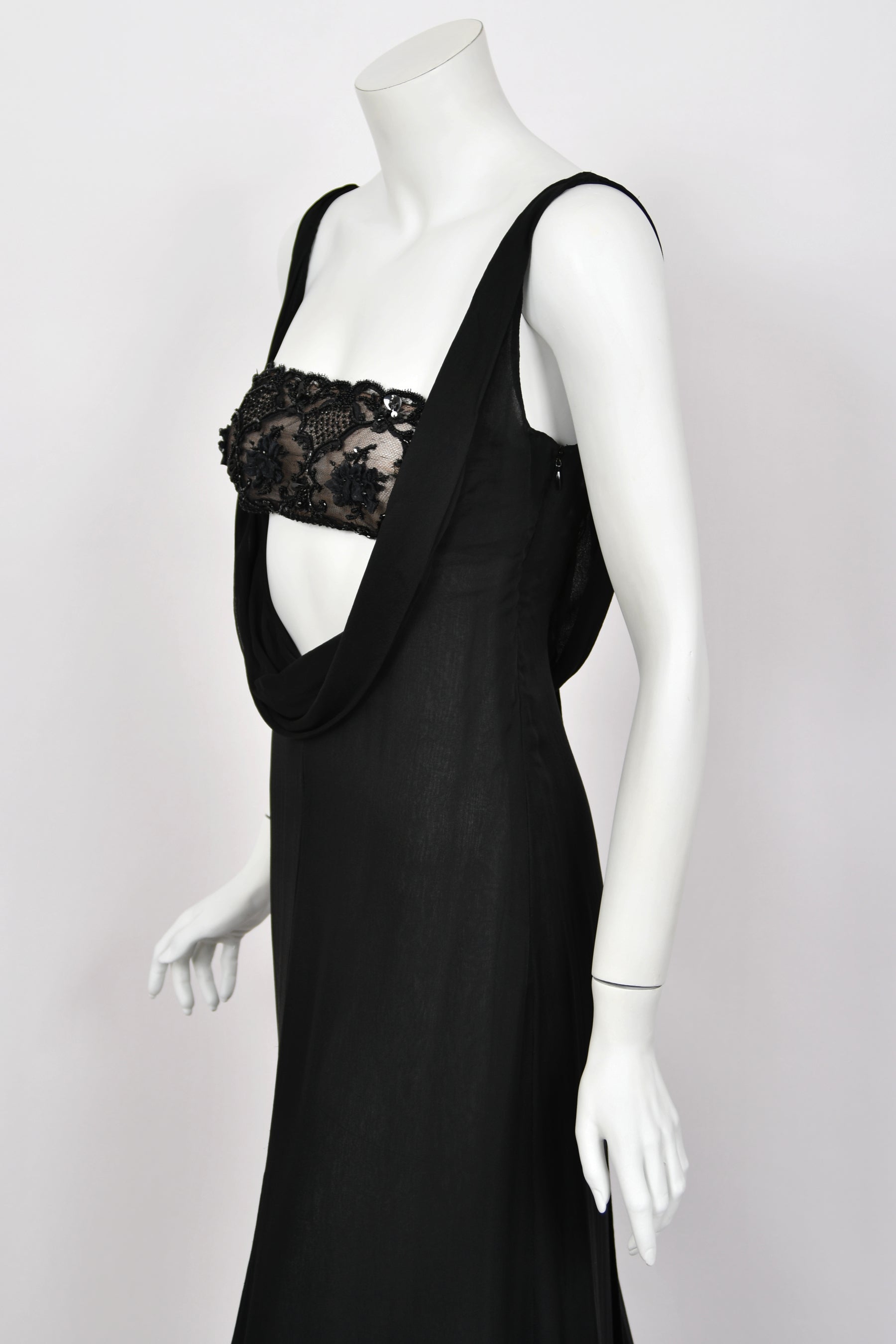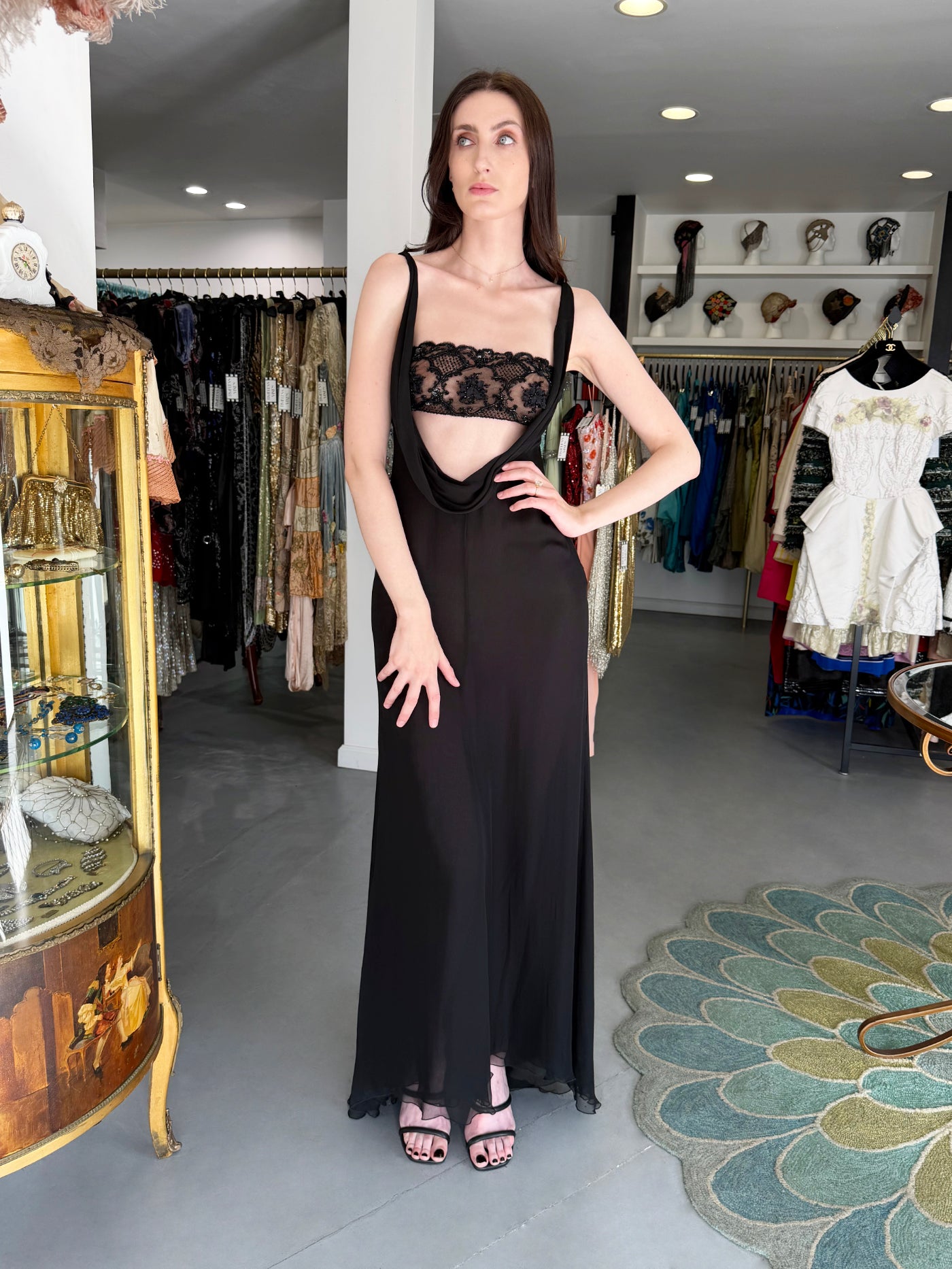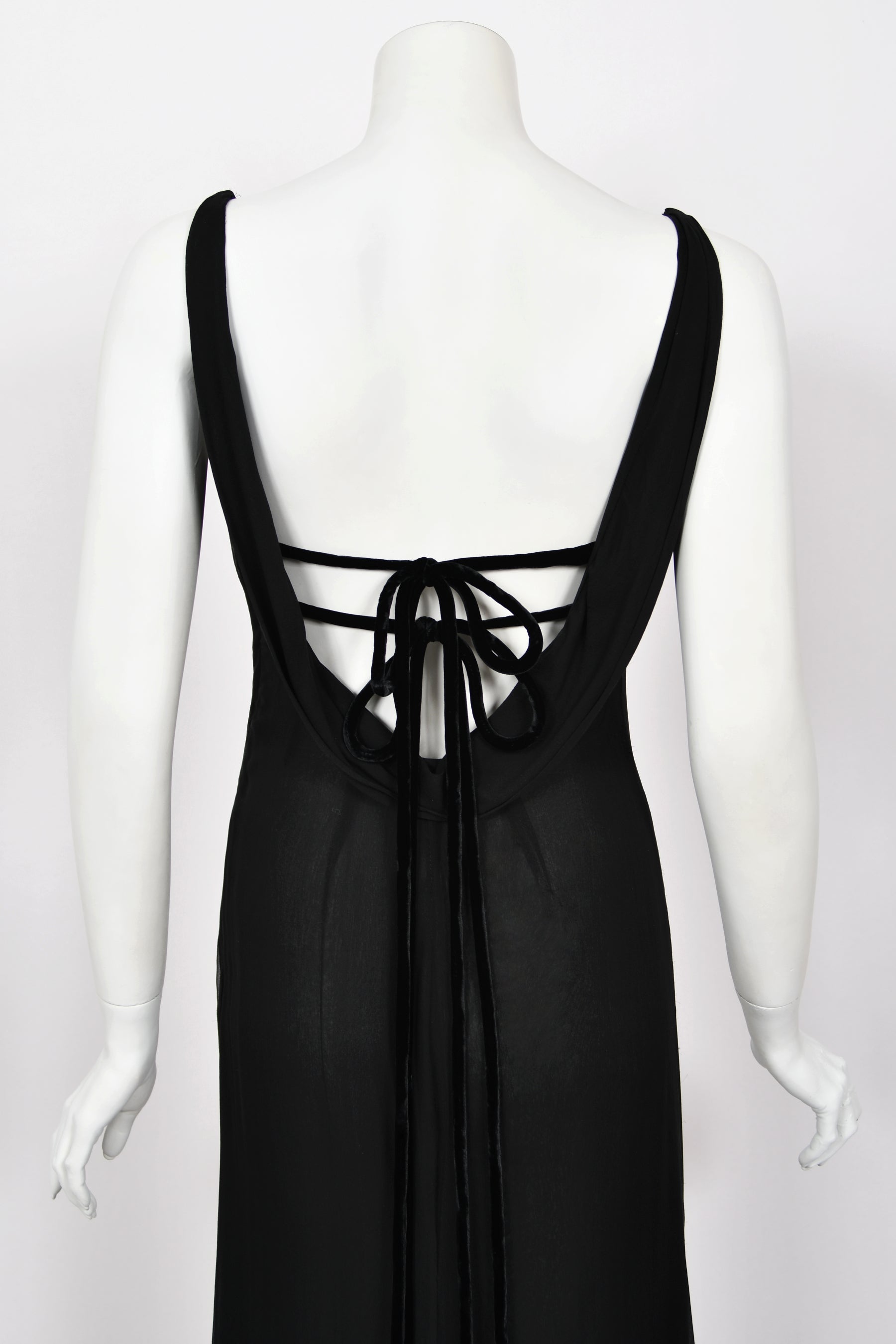 This gown, runway look 60, was worn by Italian model Mariacarla Boscono and styled with a lace mask that set the tone for the collection’s dark, seductive mood. The design features a slightly sheer, black silk that glides effortlessly over the figure. The gown reveals a daring open scooped bodice which showcases the dress's most prominent and sexy feature—an intricately beaded black lace bralette adorned with jet sequins and floral embroidery. Cleverly constructed, the bralette is anchored on the left side, wrapping across the bust and fastening in the back with two luxurious velvet ties that trail down the spine. The front is equally balanced out with a plunging open back, flowing into a graceful floor-length hem and subtle train that moves beautifully with every step. A masterclass in construction, this archival Valentino gown captures the designer’s signature blend of sensuality and sophistication.