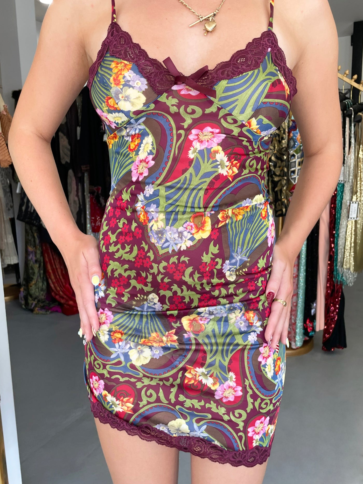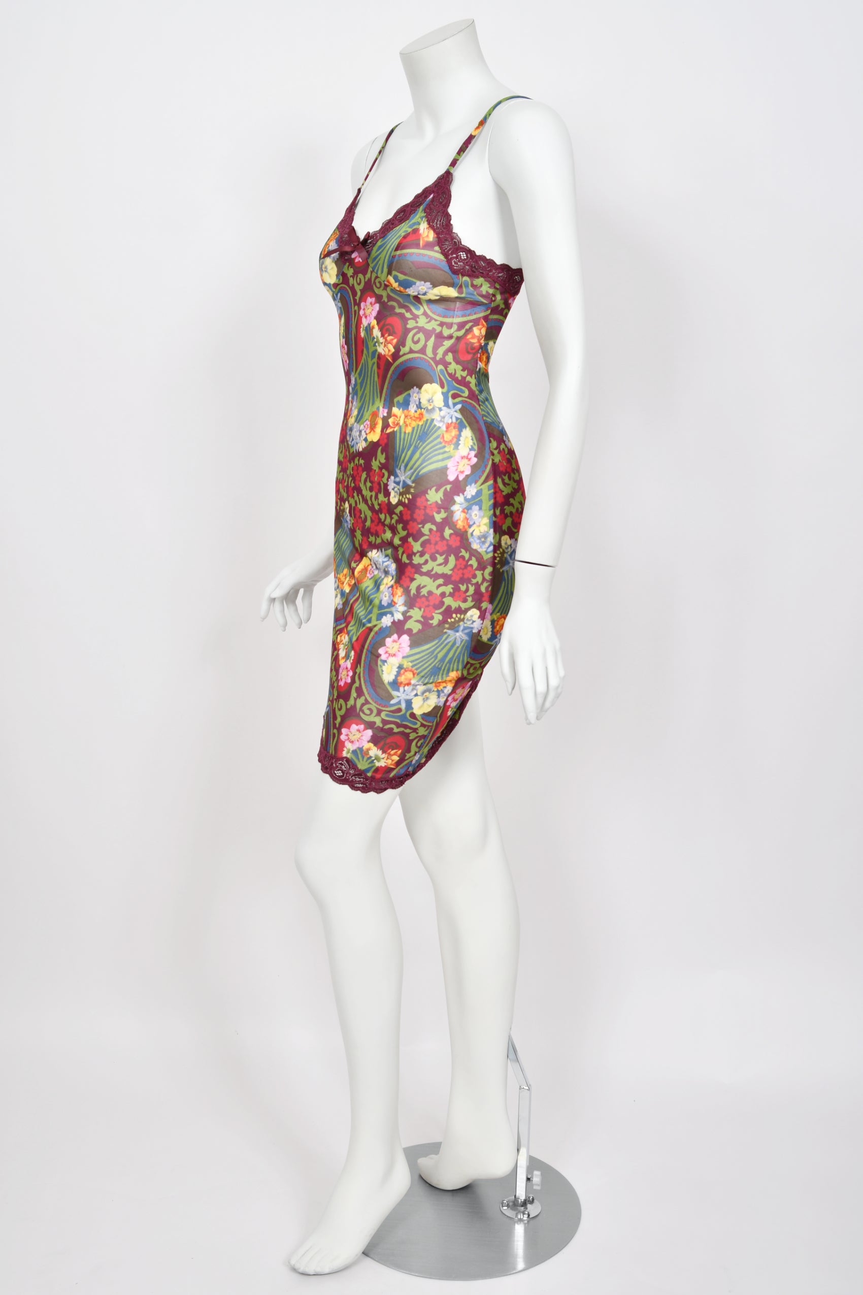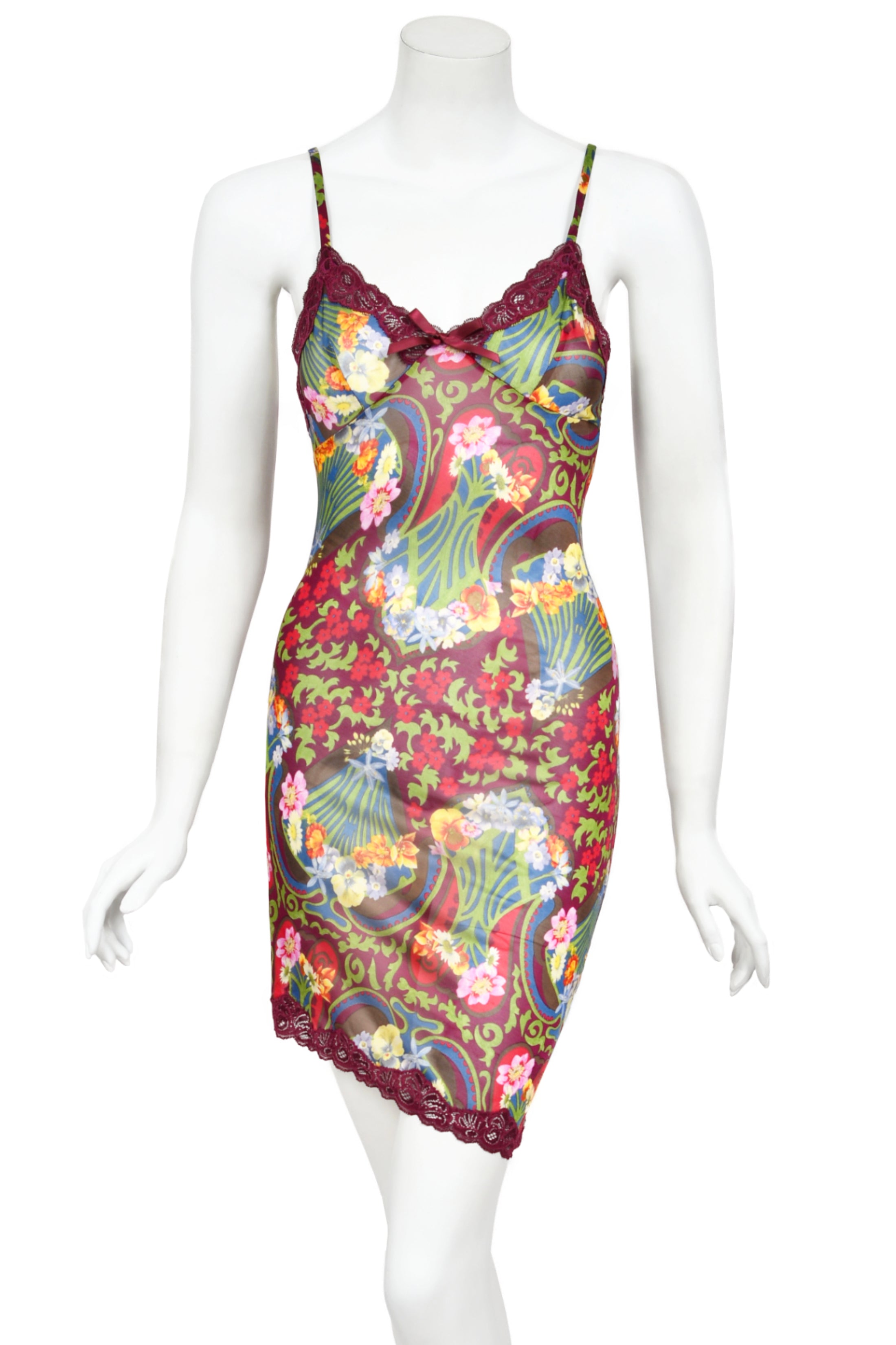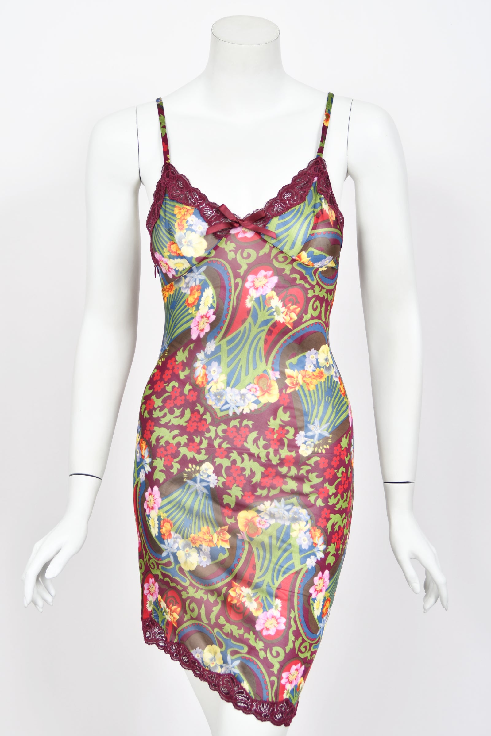 A super seductive and highly coveted Christian Dior semi-sheer burgundy floral mini slip dress dating back to John Galliano's 2005 spring-summer collection. Galliano is one of fashion’s living legends, receiving such prestigious distinctions as the British Designer of the Year award and the French Legion of Honor. Vogue describes him as “a designer after Dior’s own heart… whipping up fantasies of silk and embroidery that exalt beauty to the extreme.” His love for bold, eye-catching patterns is apparent in this gorgeous piece. The sleek semi-sheer silky viscose is printed with a gorgeous Art Nouveau inspired floral print. Photorealistic peonies, daisies, and star flowers appear alongside whimsical illustrations of poppies. A burgundy lace-trim neckline with a dainty bow makes the bodice especially darling. The asymmetric hem, accentuated with the same lace detailing, is a playful touch. Best part is, the original unworn store tag is attached, making this dress an extra-special find for any collector. From day to night; I’m obsessed with its versatility. This archival Christian Dior by John Galliano dress is sure to become one of your favorites.