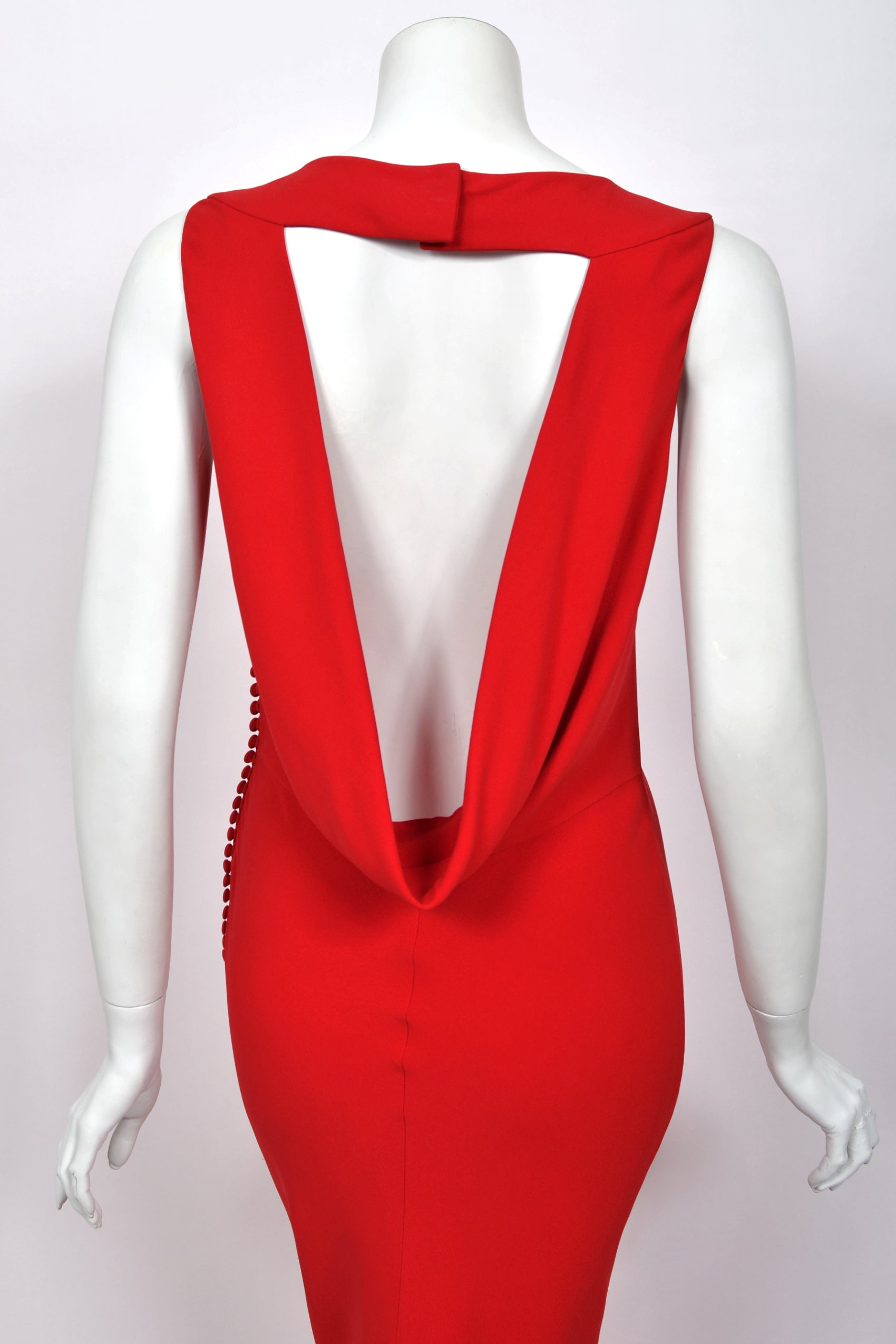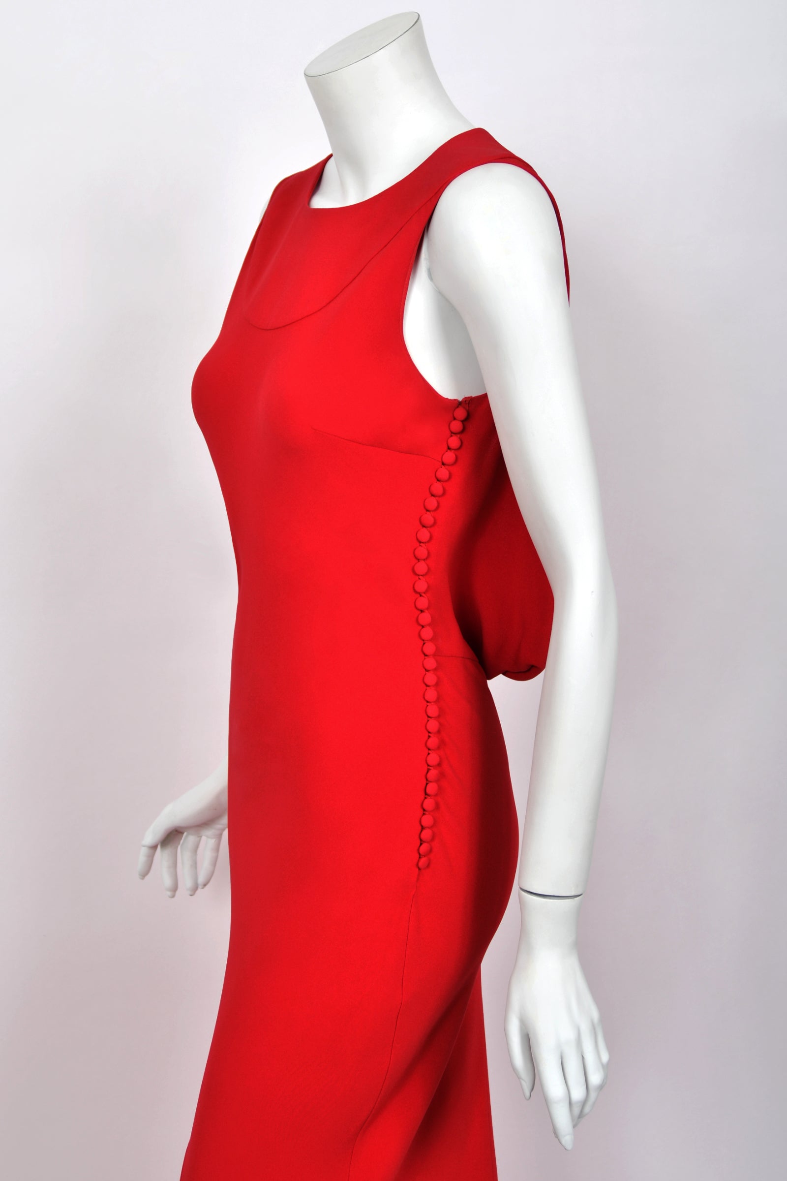 This commanding and incredibly elegant Christian Dior ruby red silk draped backless bias-cut floor length gown dates back to John Galliano's 2012 cruise collection. Appointed creative director of the house in 1996, Galliano reinvigorated Dior with theatrical storytelling and impeccable technique, blending historic references with modern seduction. Over his fifteen-year tenure, he reasserted the maison’s couture authority, often referencing the past while sharpening it for a contemporary woman. Pieces from this 2012 Cruise Collection, which have Galliano's unmistakable touch, are significant because they were designed before his departure from Dior in March 2011 and published by Vogue less than two months after he was fired.
