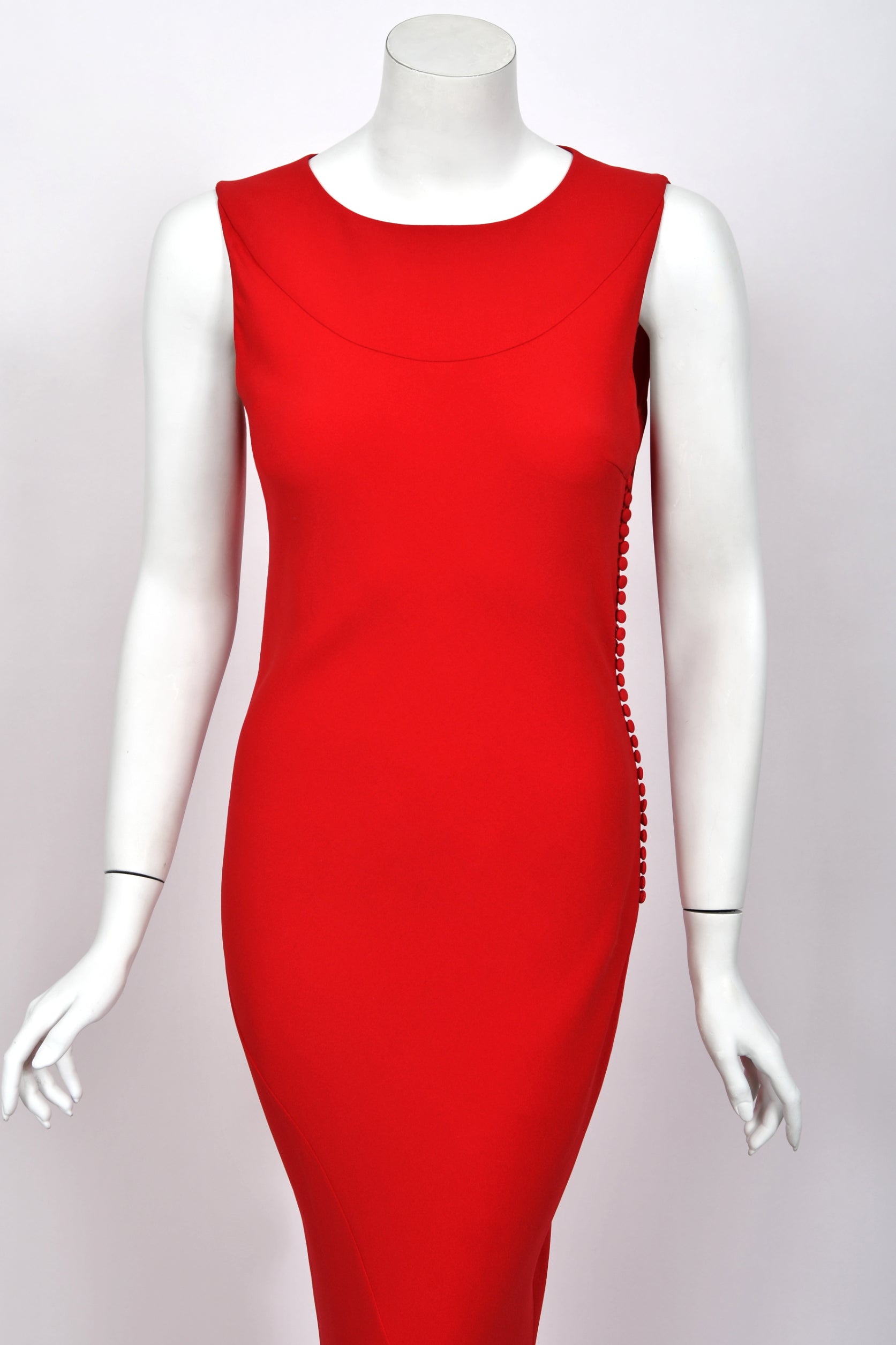 Fashioned in a saturated ruby red silk, the color alone catches attention the moment you enter a room. Cut on the bias, the gown skims the body with fluid precision, tracing the waist and hips. The sleeveless design is anchored by a clean bateau neckline that frames the collarbone and fastens discreetly at the back of the neck with two hidden snaps. As you move, the silk falls in a continuous line before releasing into a graceful flare, pooling softly at the floor and elongating your frame. The gown closes with Galliano’s signature covered buttons, a refined nod to the beloved 1930s aesthetic. Turn around and the drama unfolds. The fabric plunges into a low scoop that dips toward the waist in a fluid drape, revealing your back in one uninterrupted gesture. It folds inward at the base, creating a soft cowl effect that contrasts with the gown’s tailored front. It's the kind of detail that leaves a lasting impression long after you exit a room. Pieces from Galliano’s era at Christian Dior continue to gain recognition for their craftsmanship and vision, and this gown offers you the opportunity to own a striking example of that legacy.