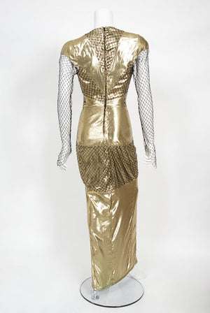 An iconic and highly coveted Thierry Mugler couture metallic gold lamé and fishnet hourglass gown dating back to his documented 1985 spring/summer collection. Garments from this show are next to impossible to find. This legendary French fashion designer is known for bold fashion and edgy, sometimes even campy, theatricality. Though Mugler stopped designing his couture and ready-to-wear lines in 2003 to focus on photography and costume design, his work has a lasting legacy. This seductive metallic gold gown is a perfect example of his genius. Not only is this number unforgettable; it is true wearable art. I love the skilled nipped-waist bodice with little cap sleeves. Patterned overlay of fishnet almost creates a stunning web effect that flows into lean long sleeves. The ultra-high front slit creates even more drama and sex appeal. The hourglass cut really has that nod to Old Hollywood glamour days that you see in his best pieces.