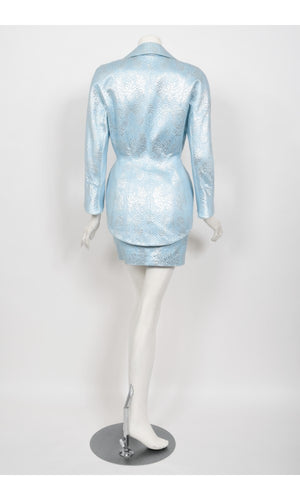 An iconic and highly coveted Thierry Mugler couture metallic silver blue silk brocade three-piece jacket, corset bustier and mini skirt ensemble dating back to his 1992 fall/winter collection. I love how this rare set totally resembles the 'Angel' perfume bottle he introduced the same year! A legendary French fashion designer, Mugler is known for bold fashion and edgy, sometimes even campy, theatricality. Though he stopped designing his couture and ready-to-wear lines in 2003 to focus on photography and costume design, his work has a lasting legacy. This ultra chic three-piece metallic set is a perfect example of his genius. The sculpted snap-button jacket has the most gorgeous futuristic construction. The cuffs flare out into a stunning circular design which is also mirrored around the jacket hemline. The end result is breathtaking. I especially adore the strapless fully-boned metallic silver bustier which is a statement piece in it's own right. You can totally wear this separate with jeans or trousers for a different look. The draped sweetheart and corset lace-up style are such lovely details. The hourglass mini skirt finishes this look off with quintessential 1990's flair. A gorgeous slice of wearable fashion history from such a celebrated designer. The pictures say it all.
